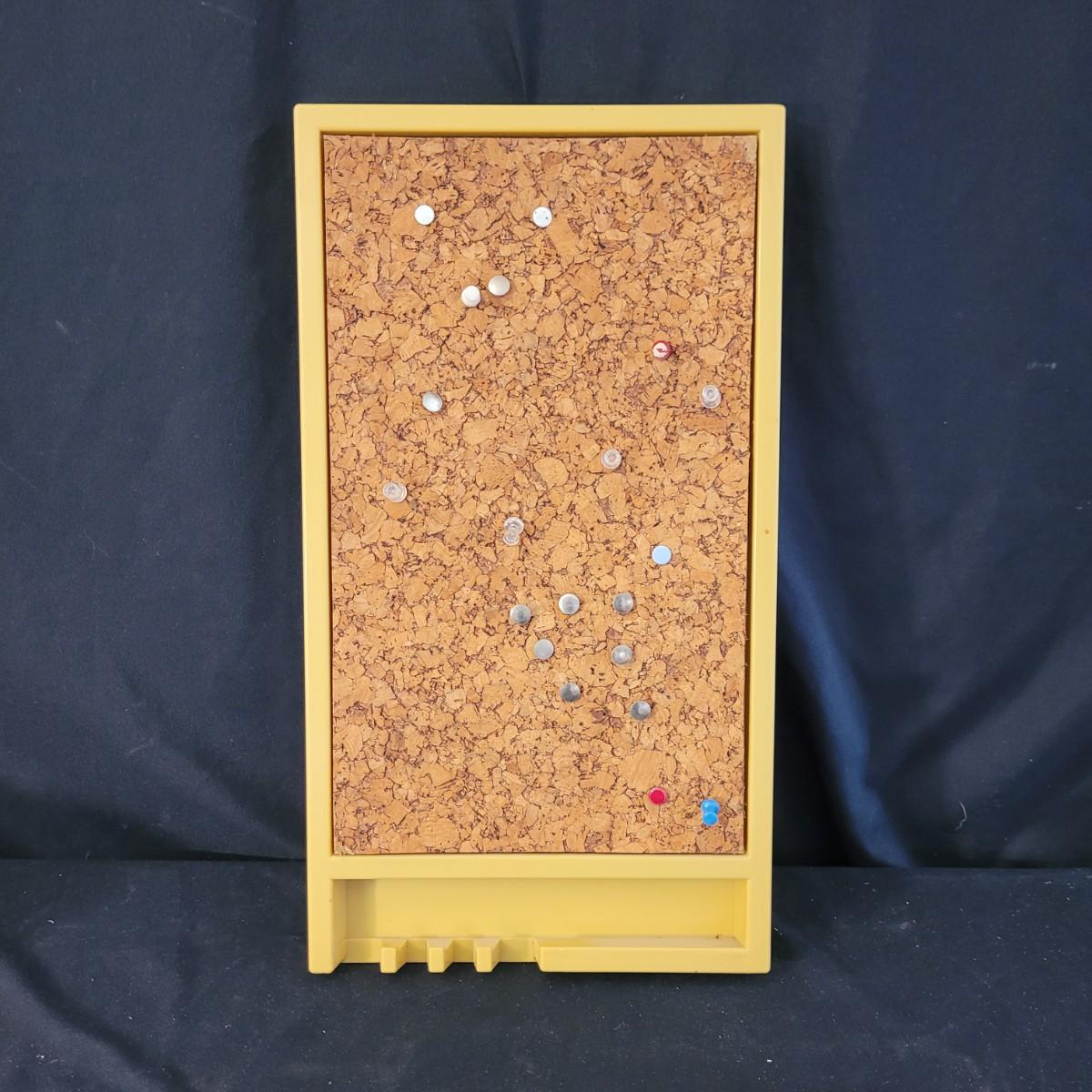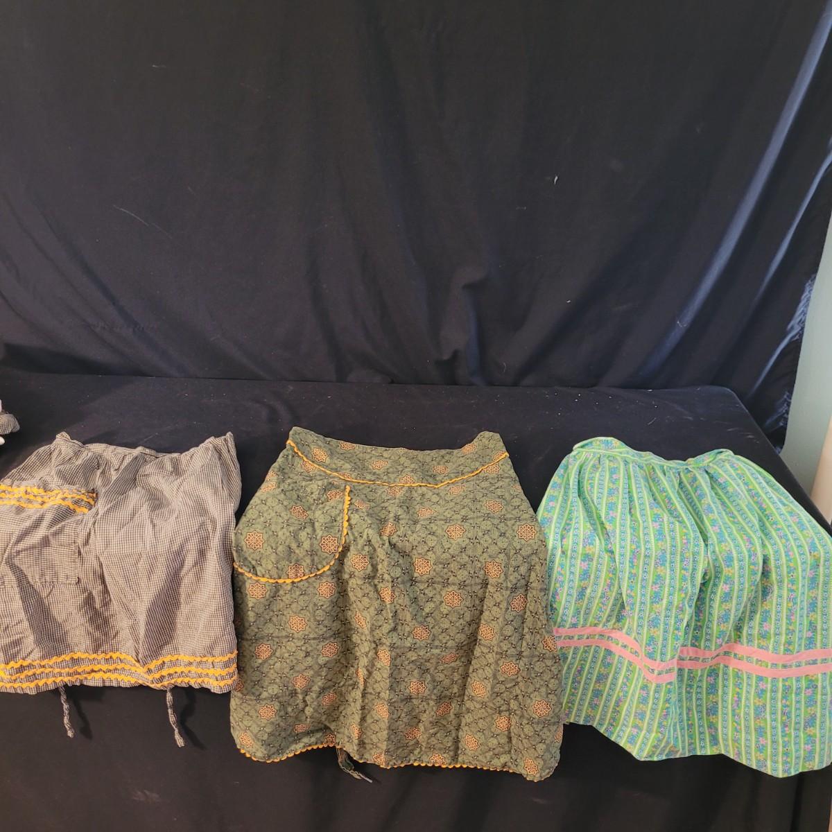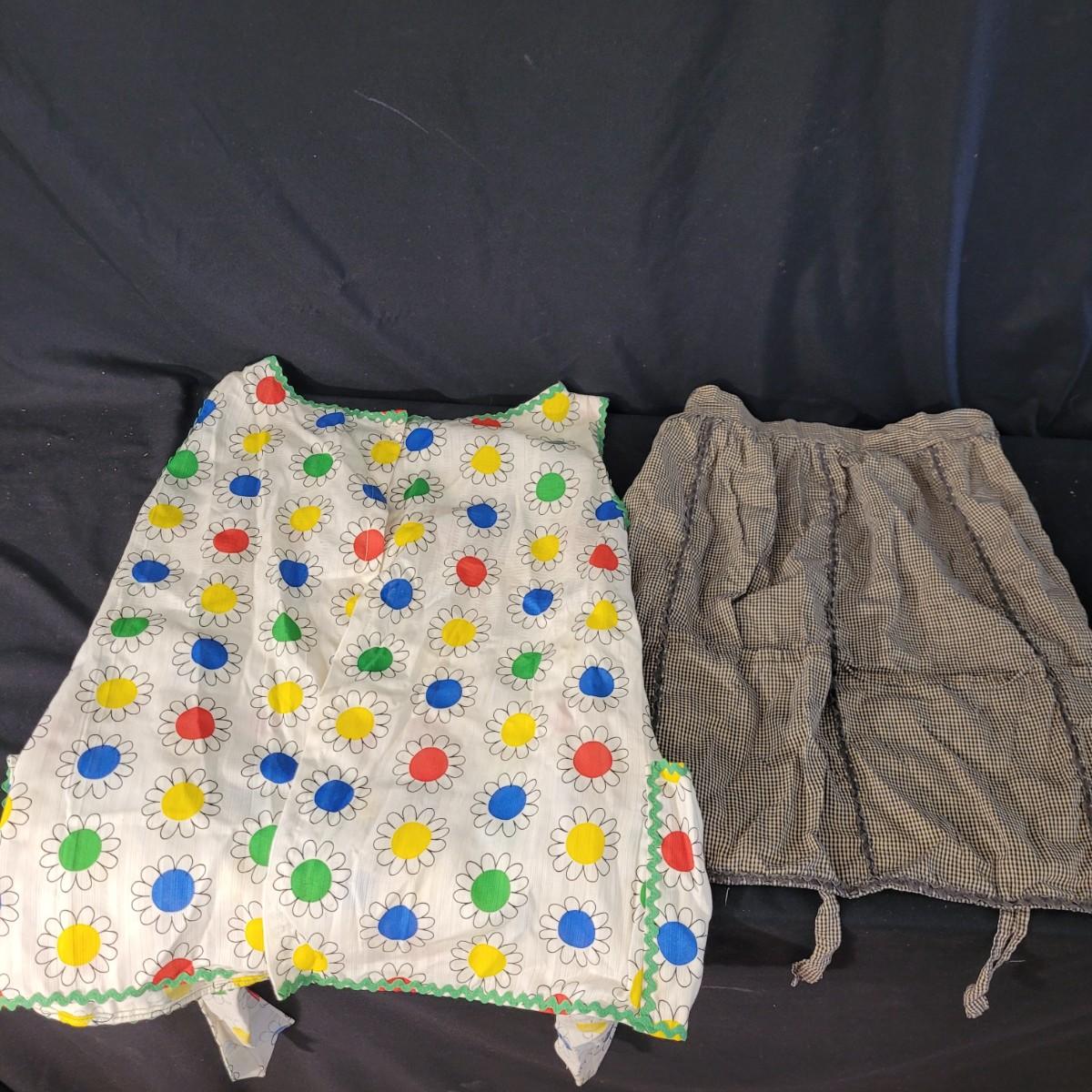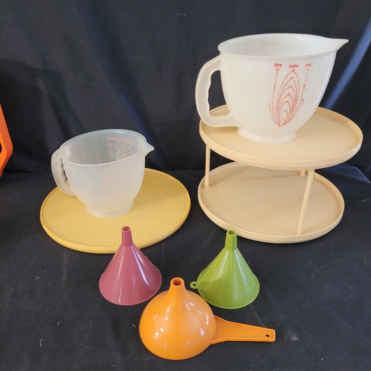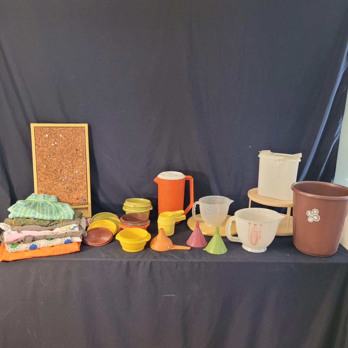 A fun collection of vintage kitchen items, including Tupperware bowls with lids, measuring cups large and small, funnels, lazy Susan trays, drink pitchers, and a trash bin. For reference, the trash bin measures 9”D x 10.5”H. Cork board has detached from the frame (see photos). Aprons come in a variety of full button down and waist wrap around. Shipping available.