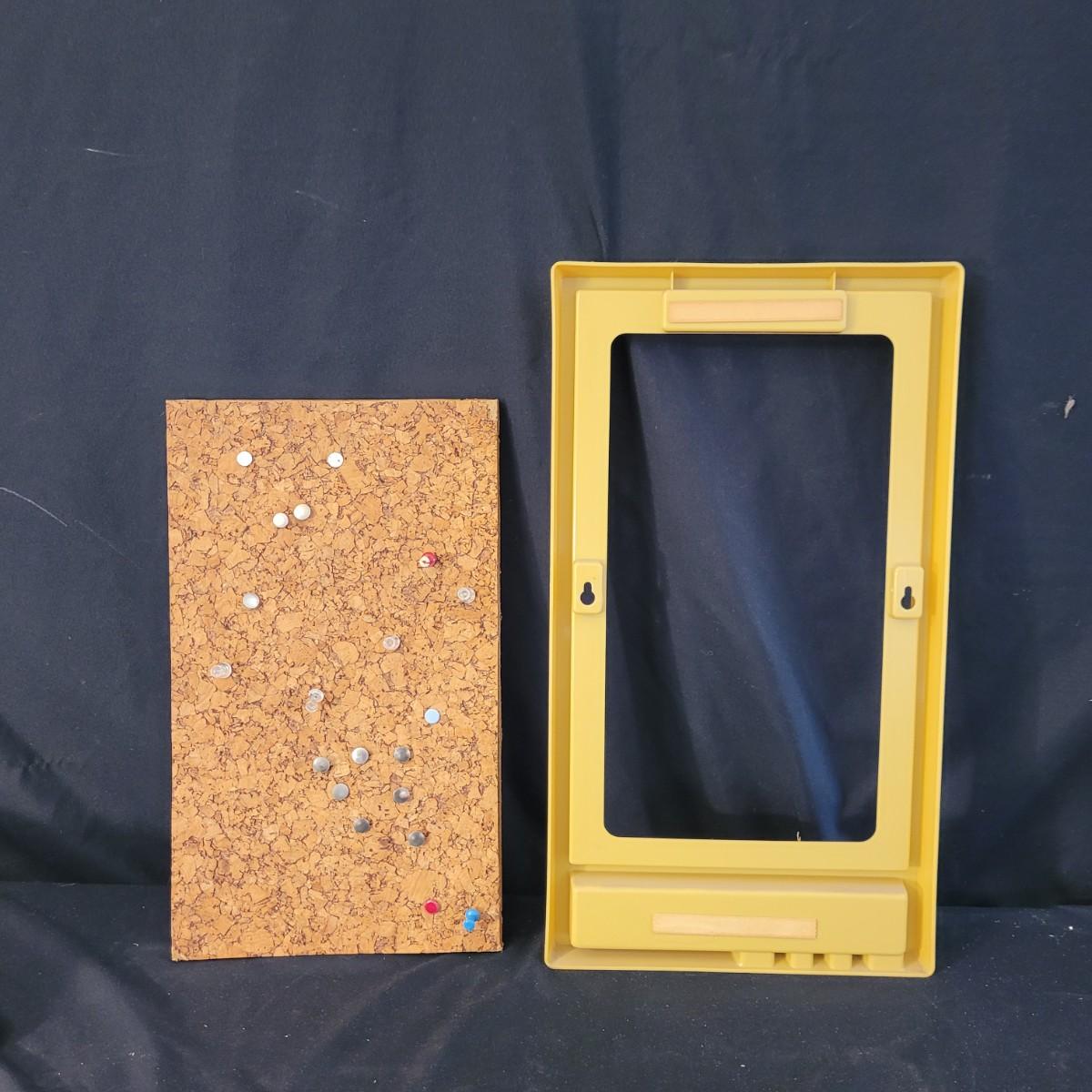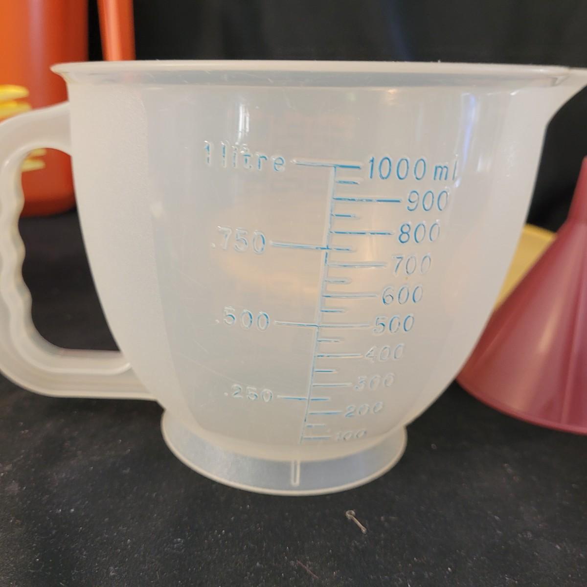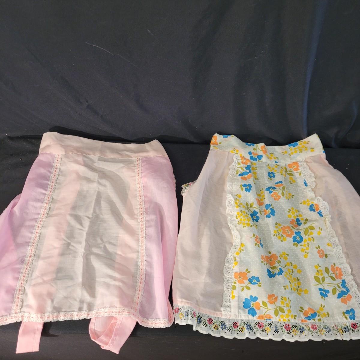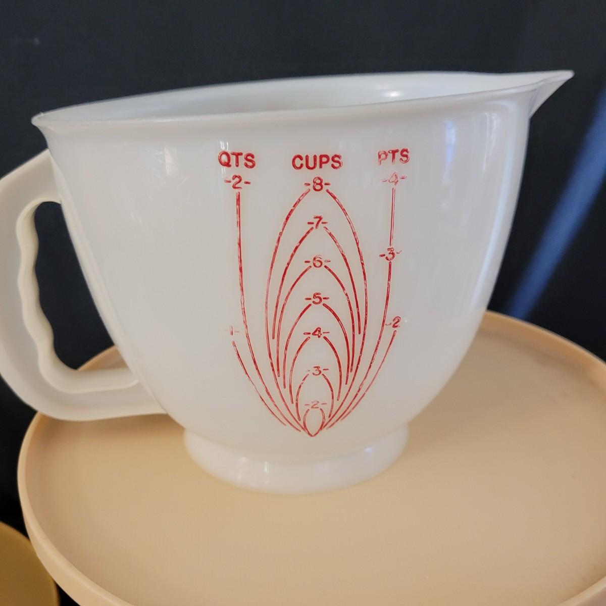 A fun collection of vintage kitchen items, including Tupperware bowls with lids, measuring cups large and small, funnels, lazy Susan trays, drink pitchers, and a trash bin. For reference, the trash bin measures 9”D x 10.5”H. Cork board has detached from the frame (see photos). Aprons come in a variety of full button down and waist wrap around. Shipping available.