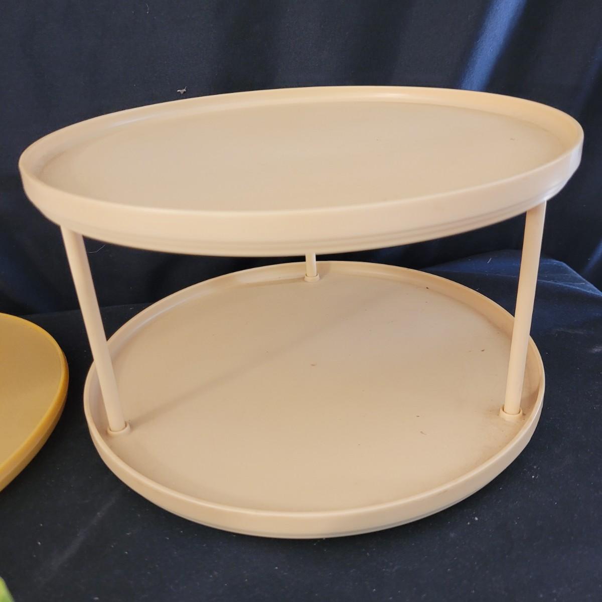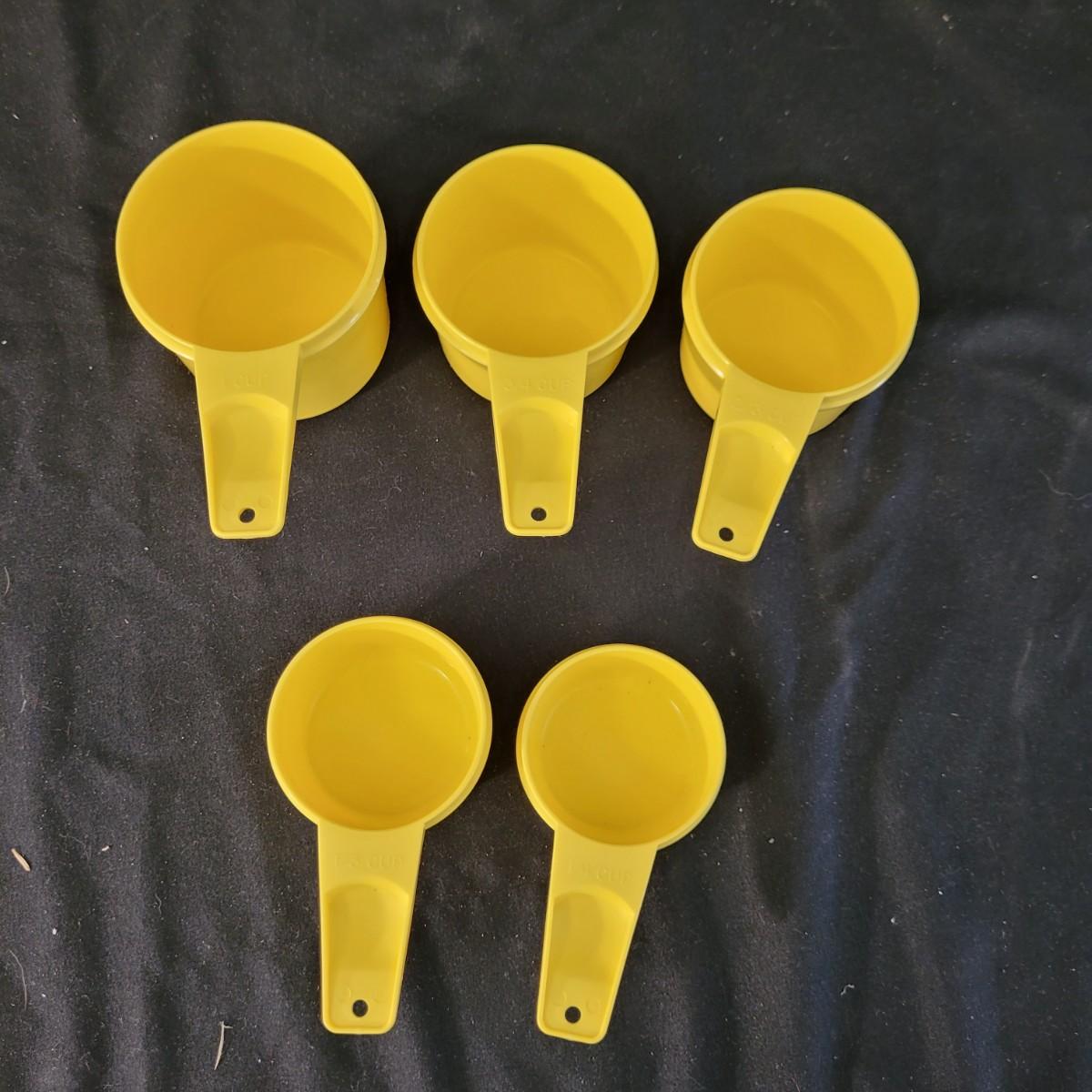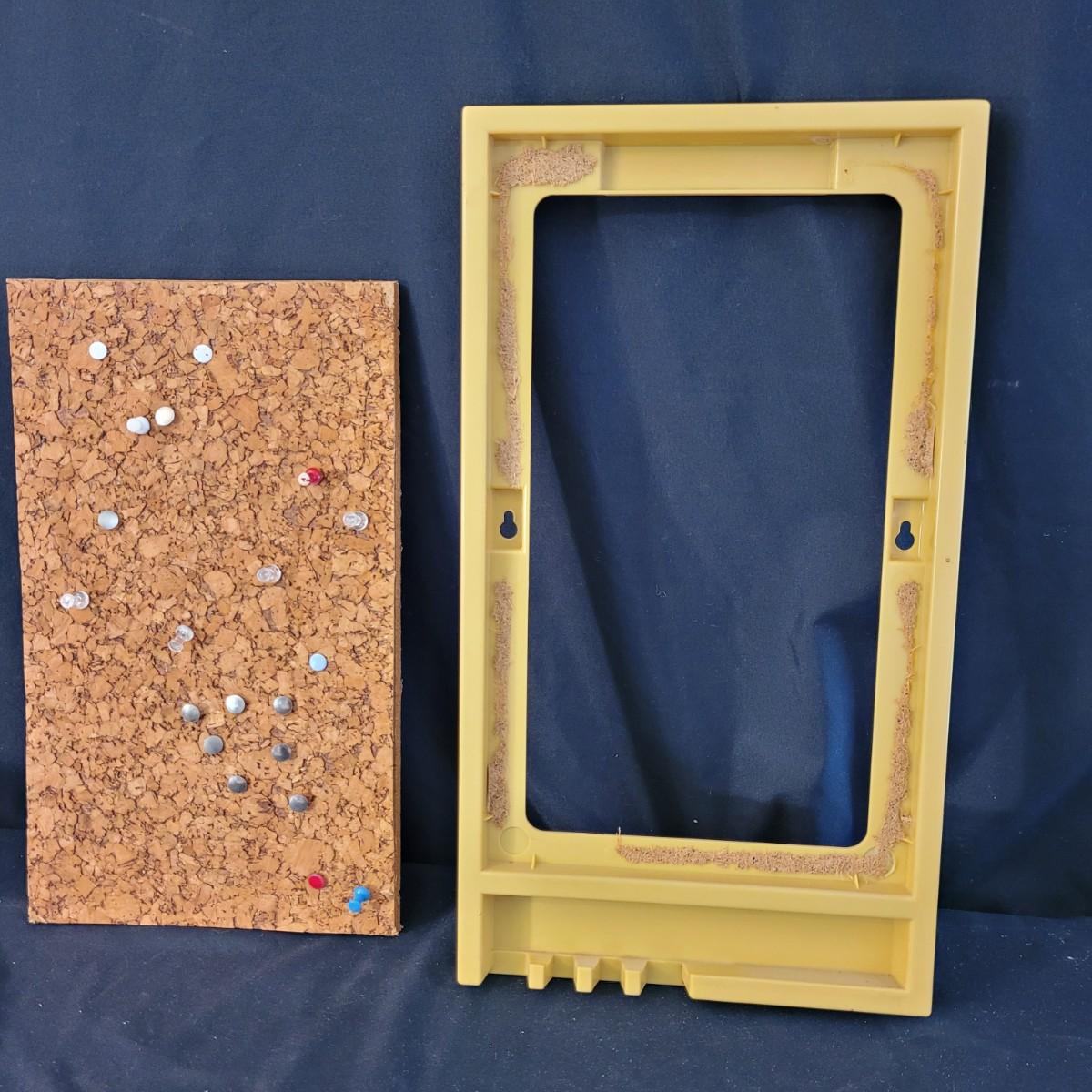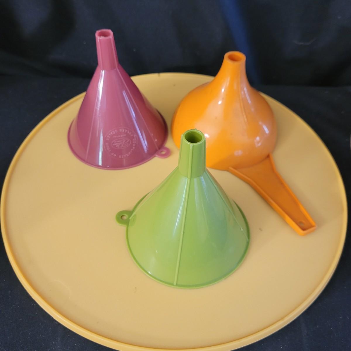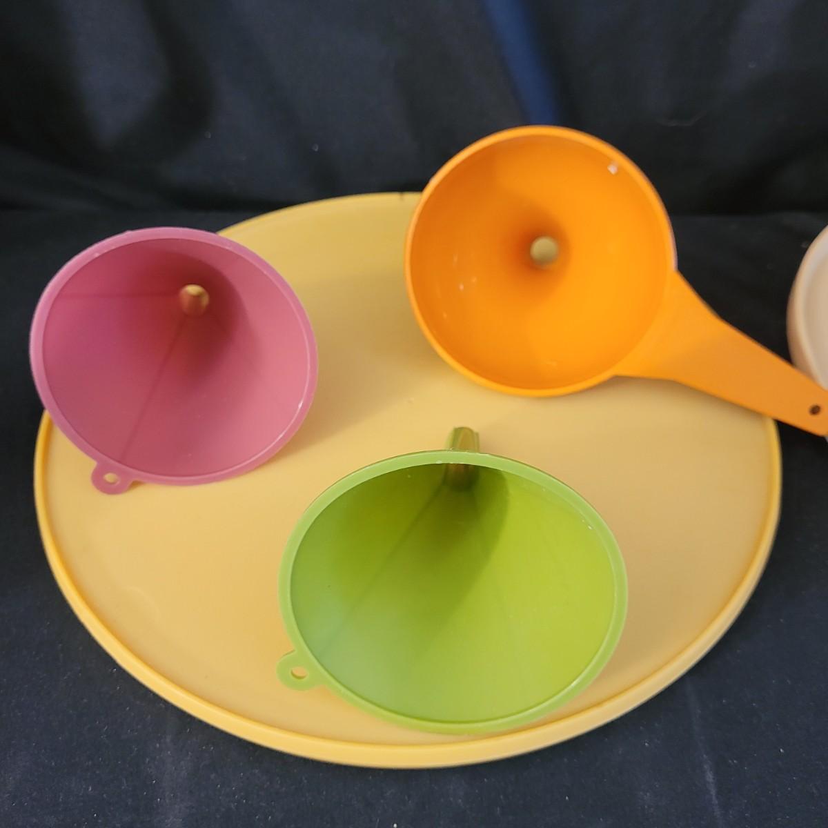 A fun collection of vintage kitchen items, including Tupperware bowls with lids, measuring cups large and small, funnels, lazy Susan trays, drink pitchers, and a trash bin. For reference, the trash bin measures 9”D x 10.5”H. Cork board has detached from the frame (see photos). Aprons come in a variety of full button down and waist wrap around. Shipping available.