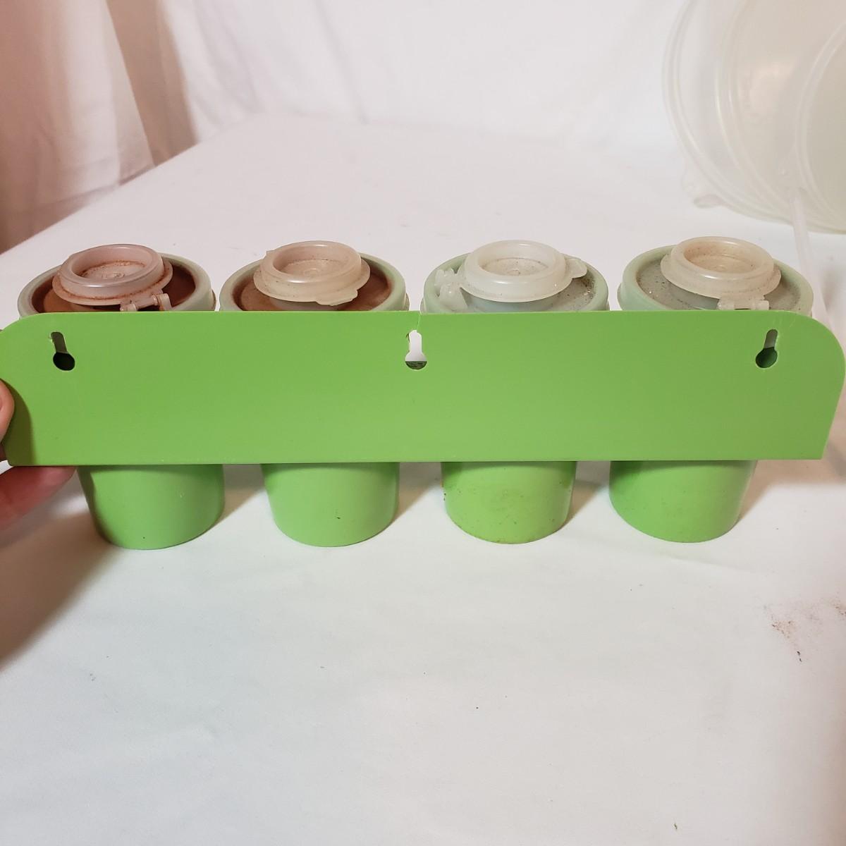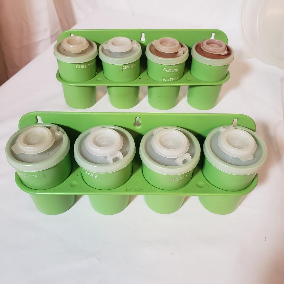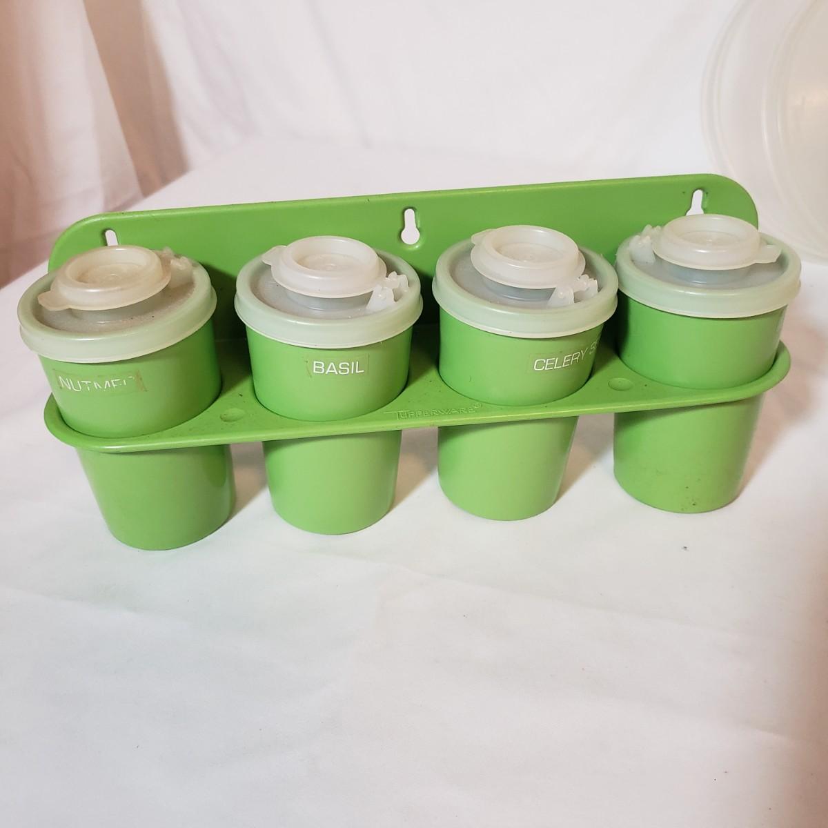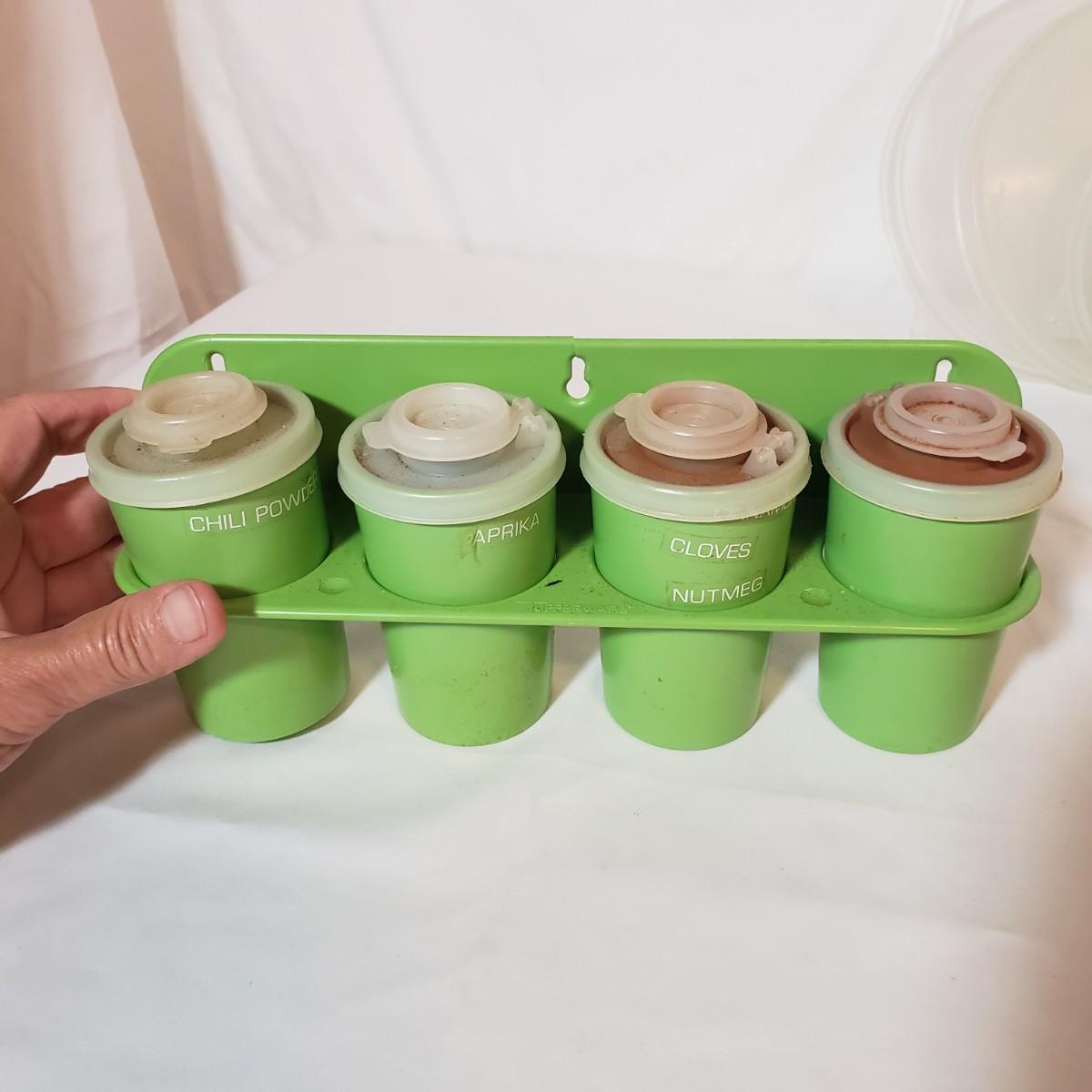 Vintage Tupperware, just like your Mom had! The gems are the green four piece spice racks! There are eight in total. They can hang inside a cabinet! One has the middle hole for hanging broke, but the two ends will work! The deviled egg holder measures 9" x 11" x 3"H. The powder sugar dispenser has a grinding handle for perfect power dusting. See pictures for details.