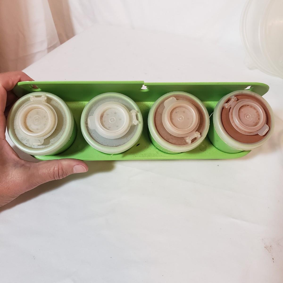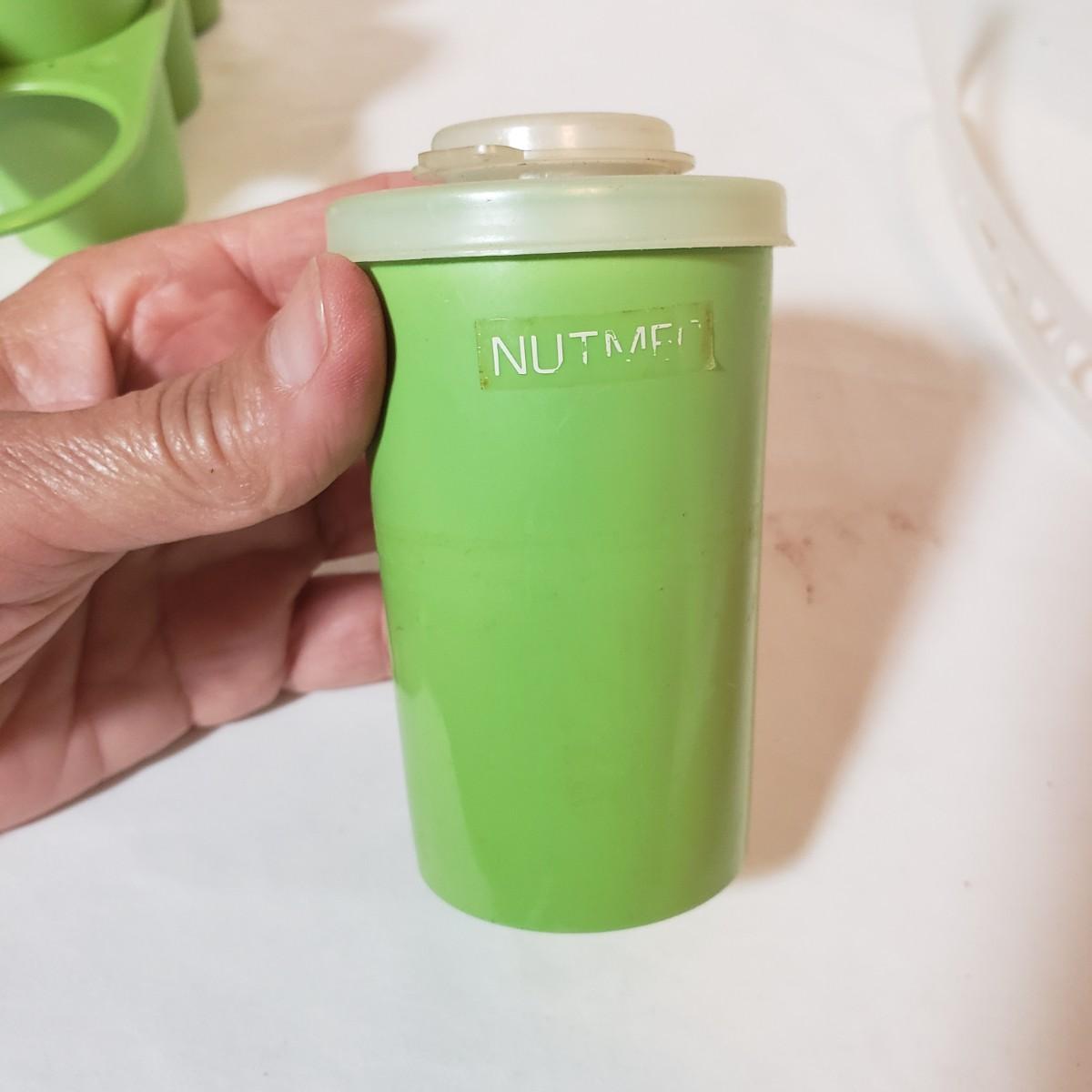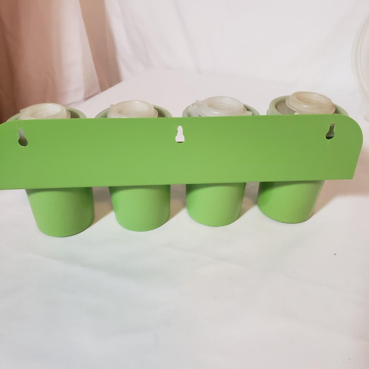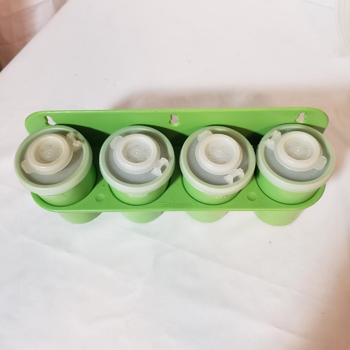 Vintage Tupperware, just like your Mom had! The gems are the green four piece spice racks! There are eight in total. They can hang inside a cabinet! One has the middle hole for hanging broke, but the two ends will work! The deviled egg holder measures 9" x 11" x 3"H. The powder sugar dispenser has a grinding handle for perfect power dusting. See pictures for details.