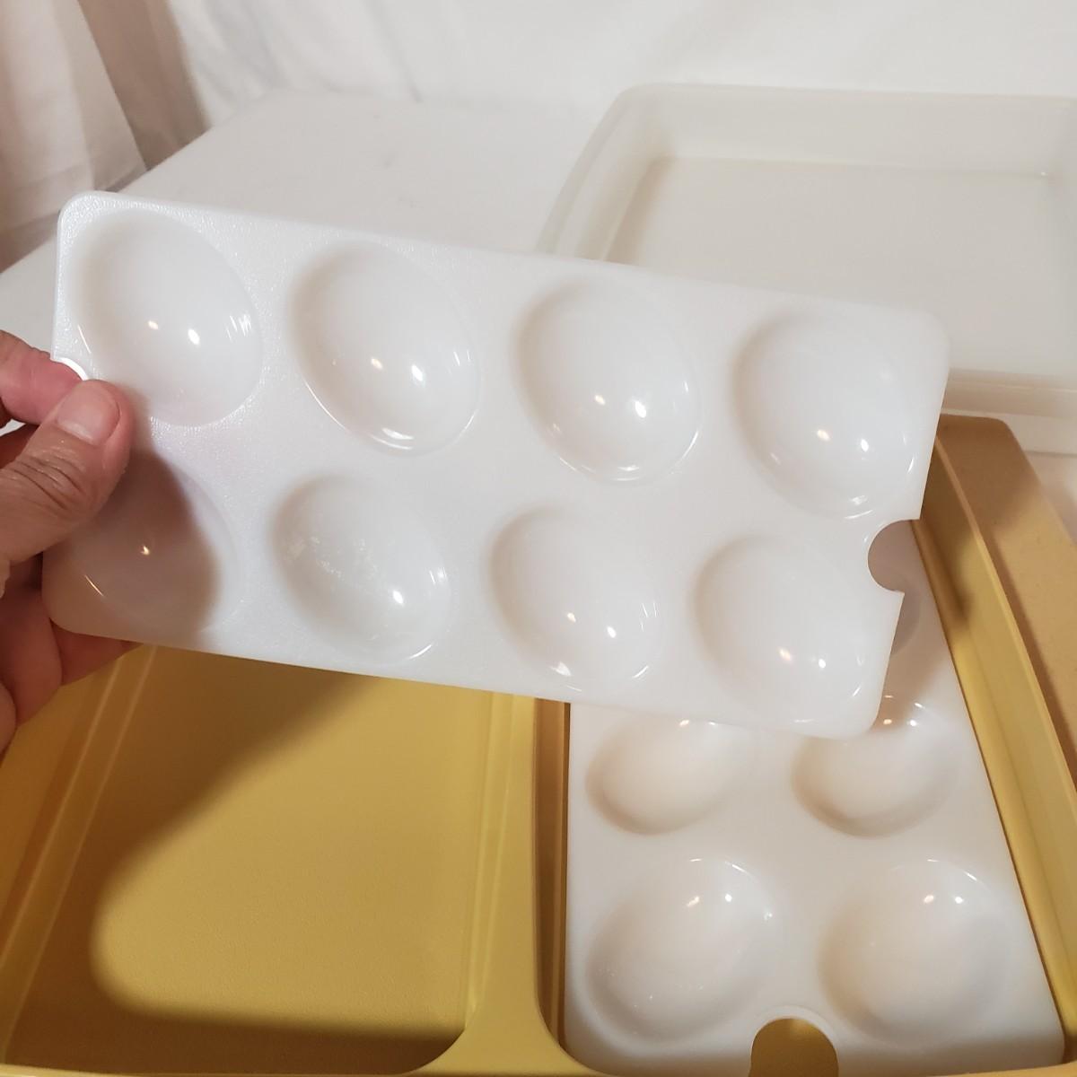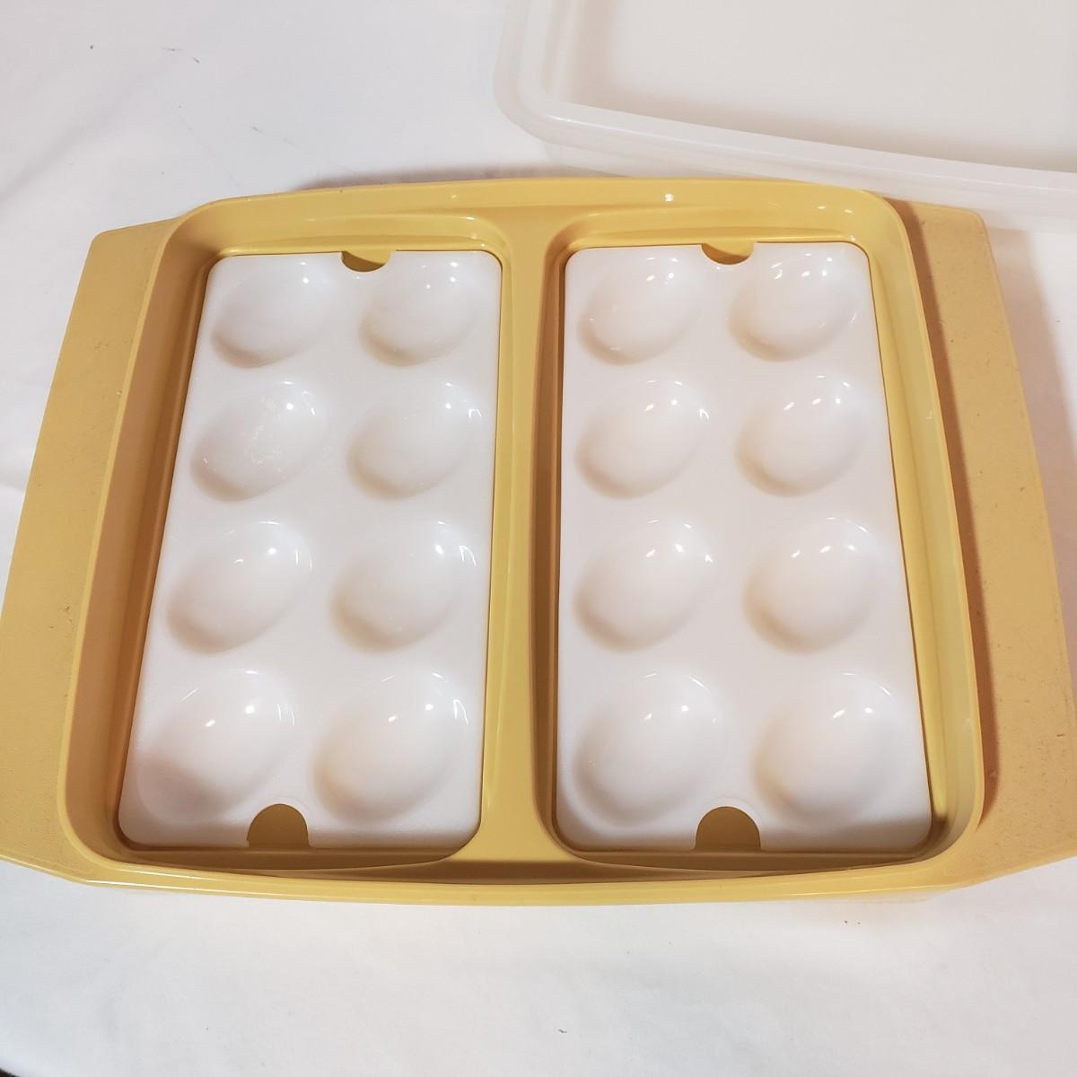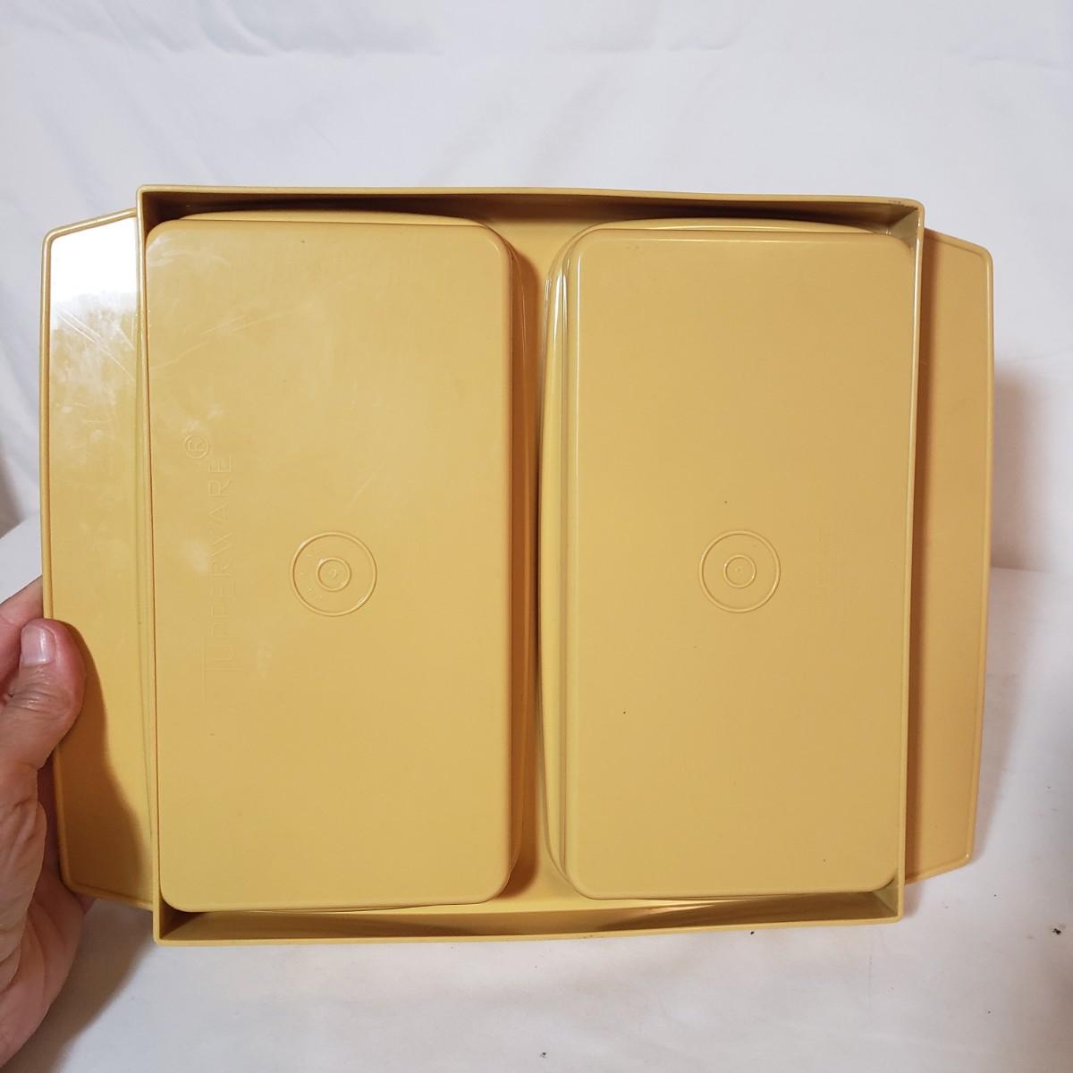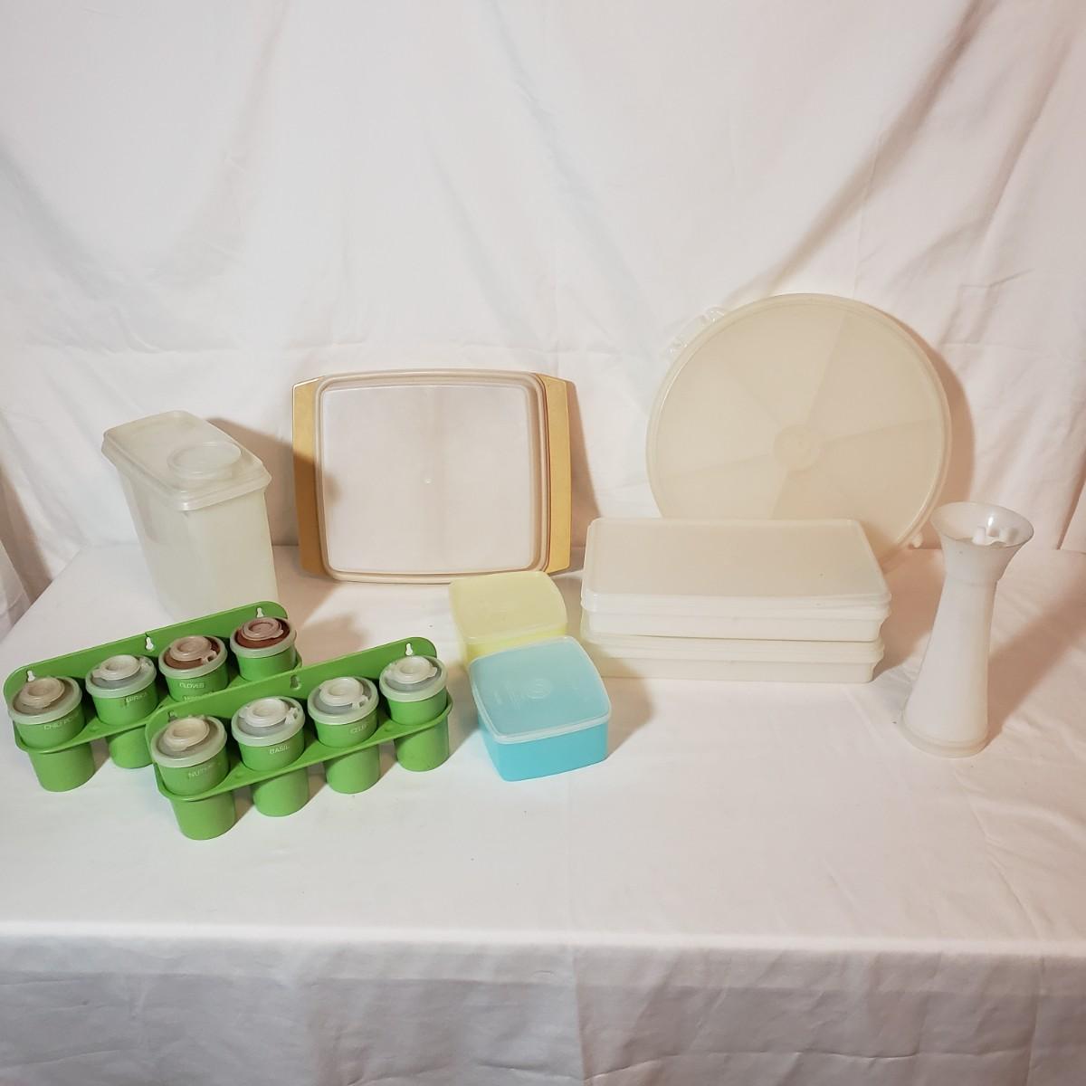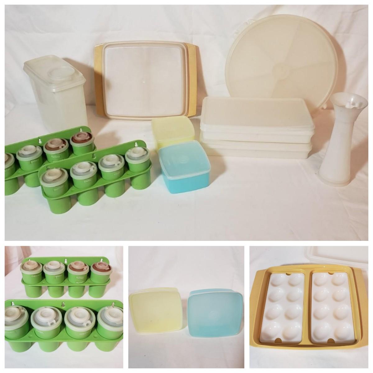 Vintage Tupperware, just like your Mom had! The gems are the green four piece spice racks! There are eight in total. They can hang inside a cabinet! One has the middle hole for hanging broke, but the two ends will work! The deviled egg holder measures 9" x 11" x 3"H. The powder sugar dispenser has a grinding handle for perfect power dusting. See pictures for details.