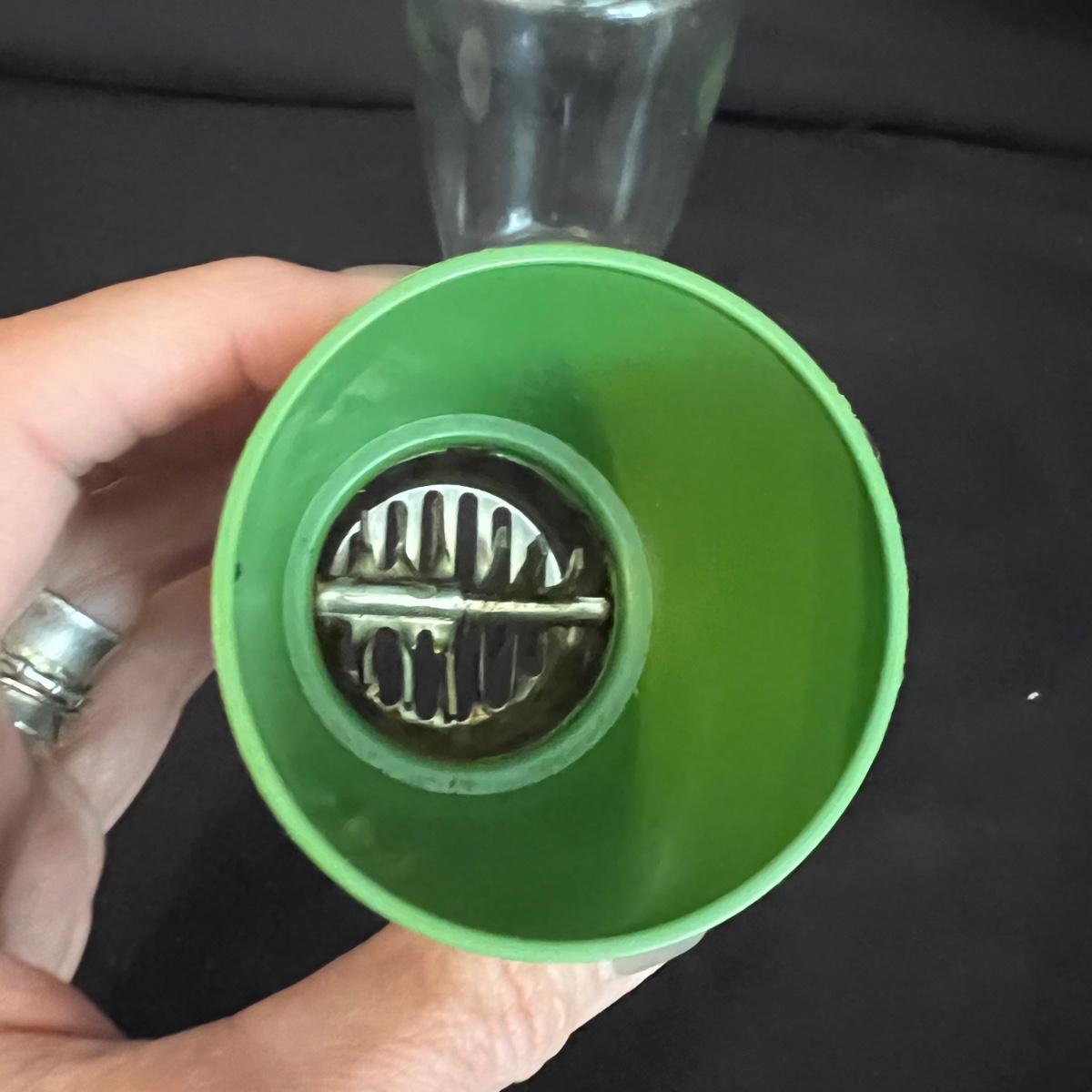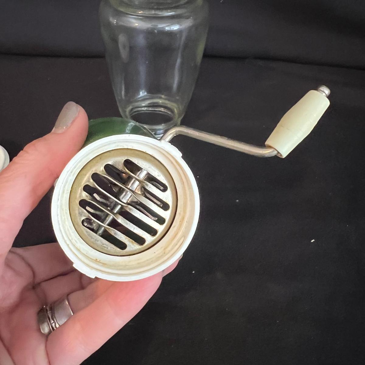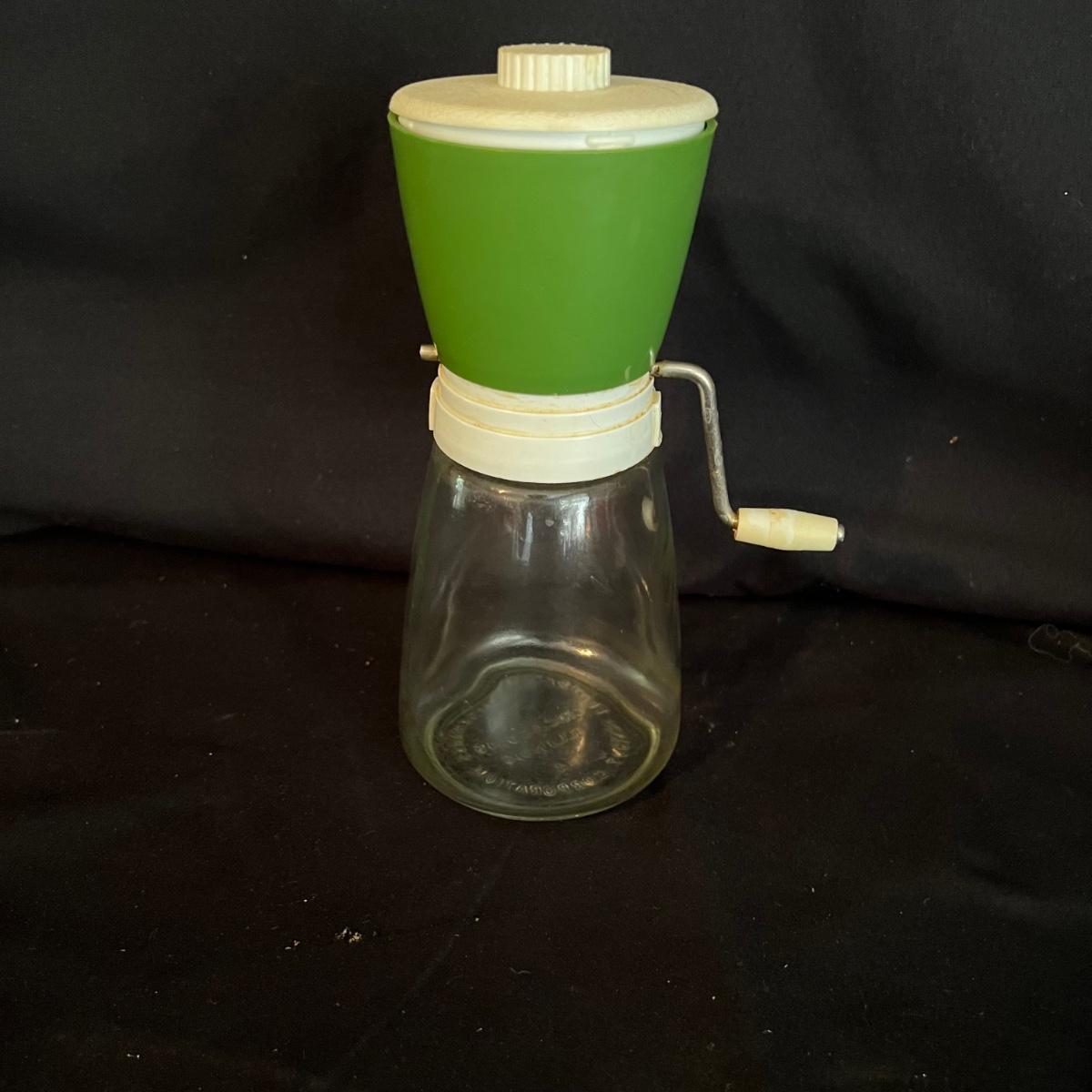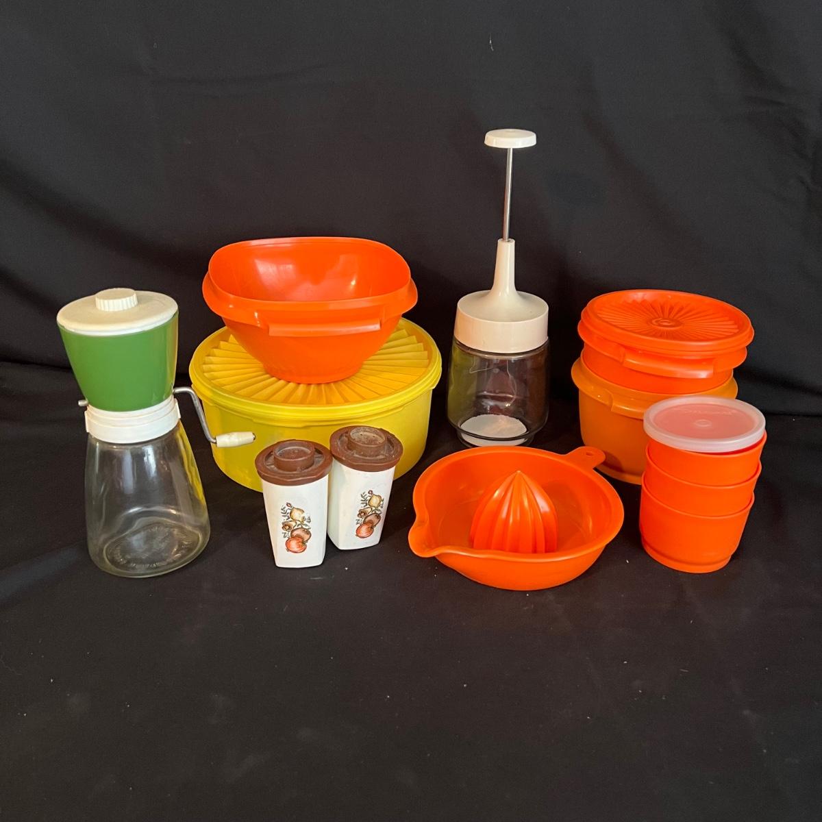 Vintage Federal House Chicago hand crank glass and plastic coffee grinder in green. Also seven vintage Tupperware storage containers. Two covered bowls 4.5”D x 3.5”H (one only one lid), three small cup containers measuring 2.75”D x 2”H (only one lid), one covered 8”D x 3.25”H round bowl and one uncovered 6” square by 3.5”H. Plastic salt and pepper shakers and a juicer. Also a glass and plastic chopper.