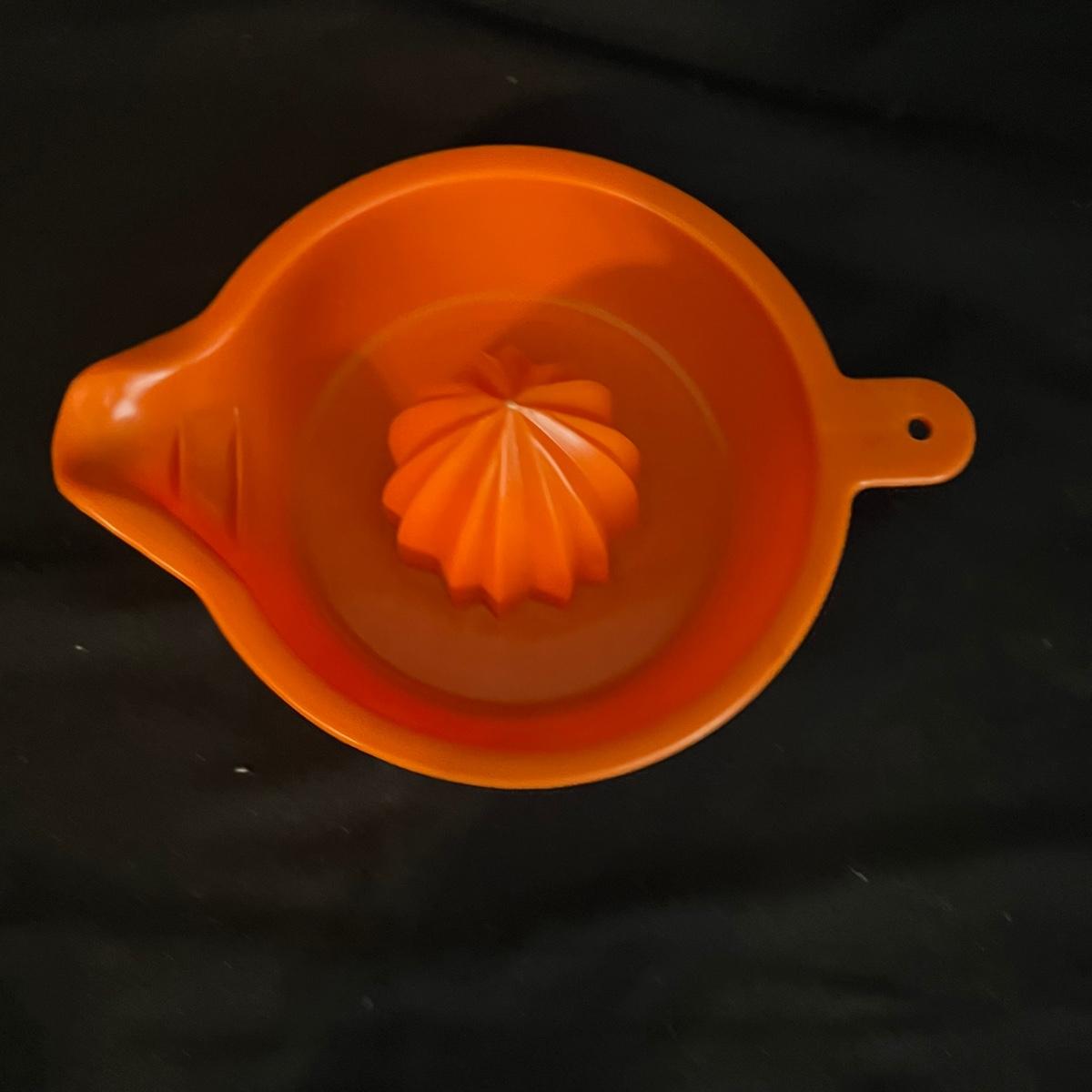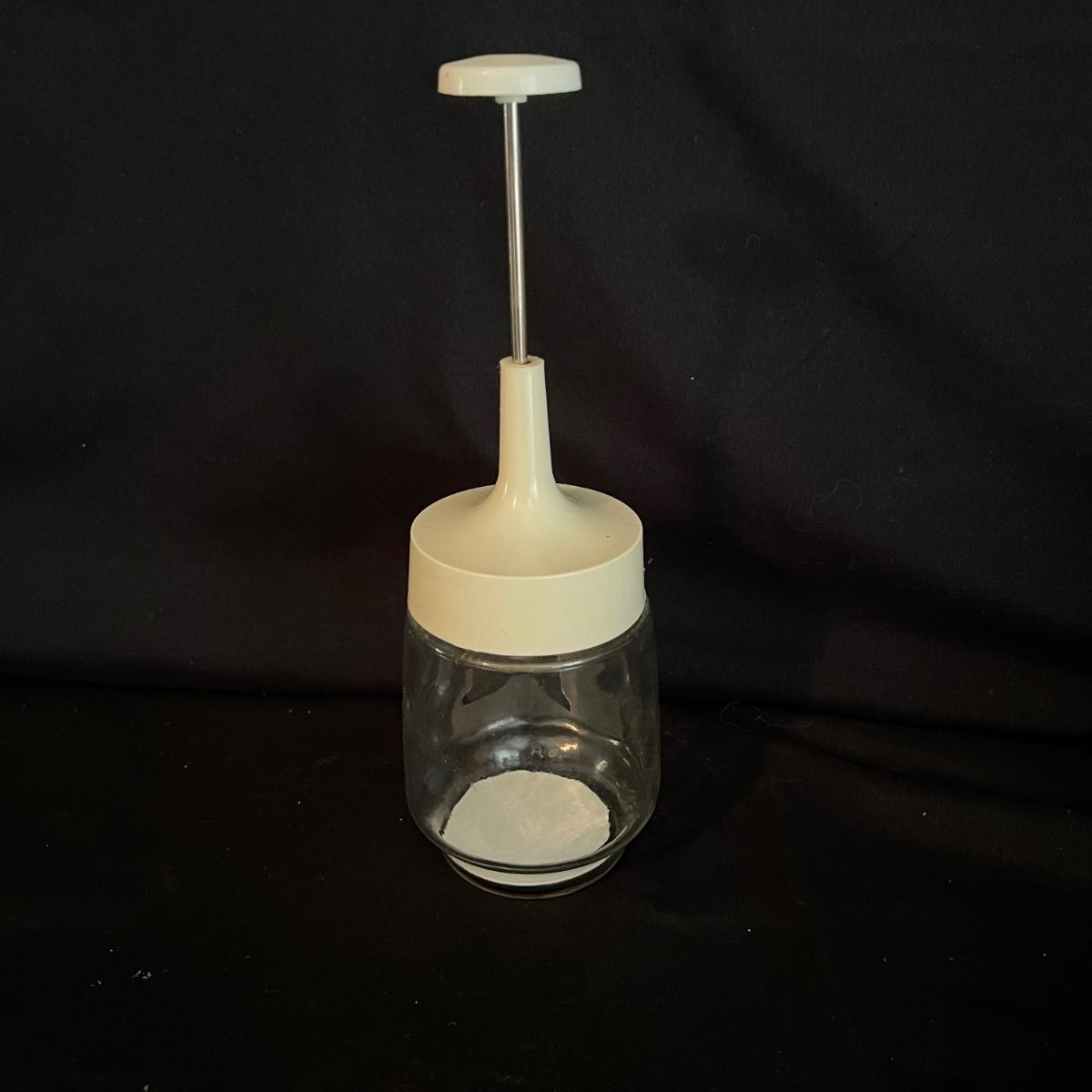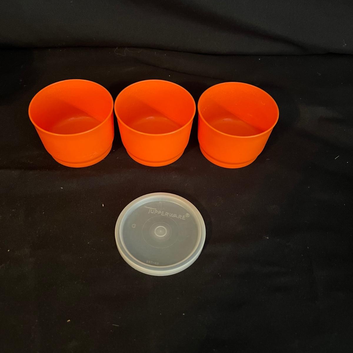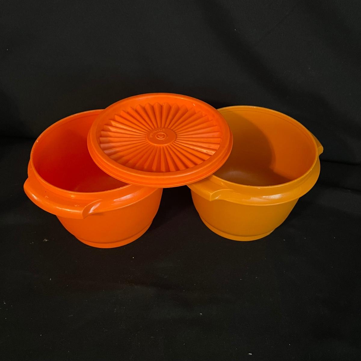 Vintage Federal House Chicago hand crank glass and plastic coffee grinder in green. Also seven vintage Tupperware storage containers. Two covered bowls 4.5”D x 3.5”H (one only one lid), three small cup containers measuring 2.75”D x 2”H (only one lid), one covered 8”D x 3.25”H round bowl and one uncovered 6” square by 3.5”H. Plastic salt and pepper shakers and a juicer. Also a glass and plastic chopper.