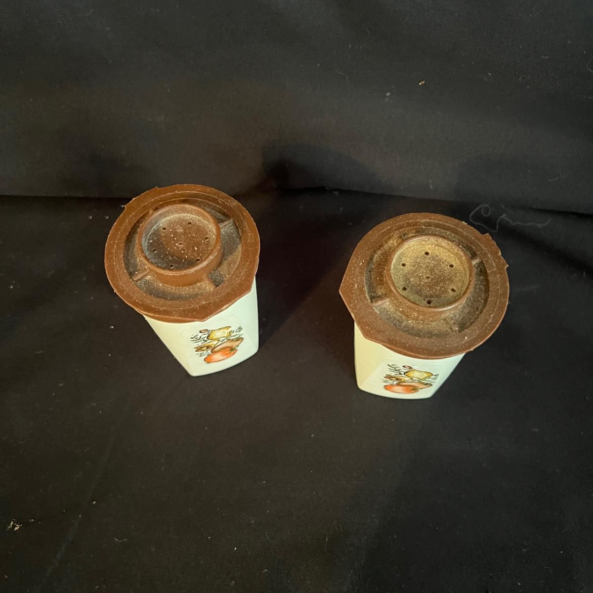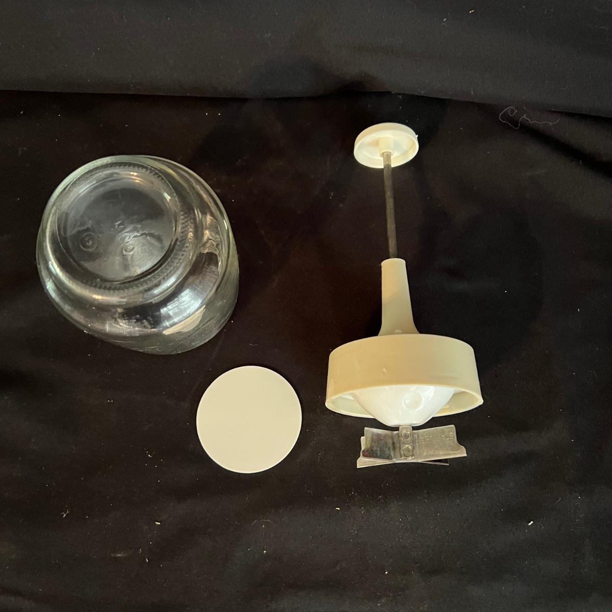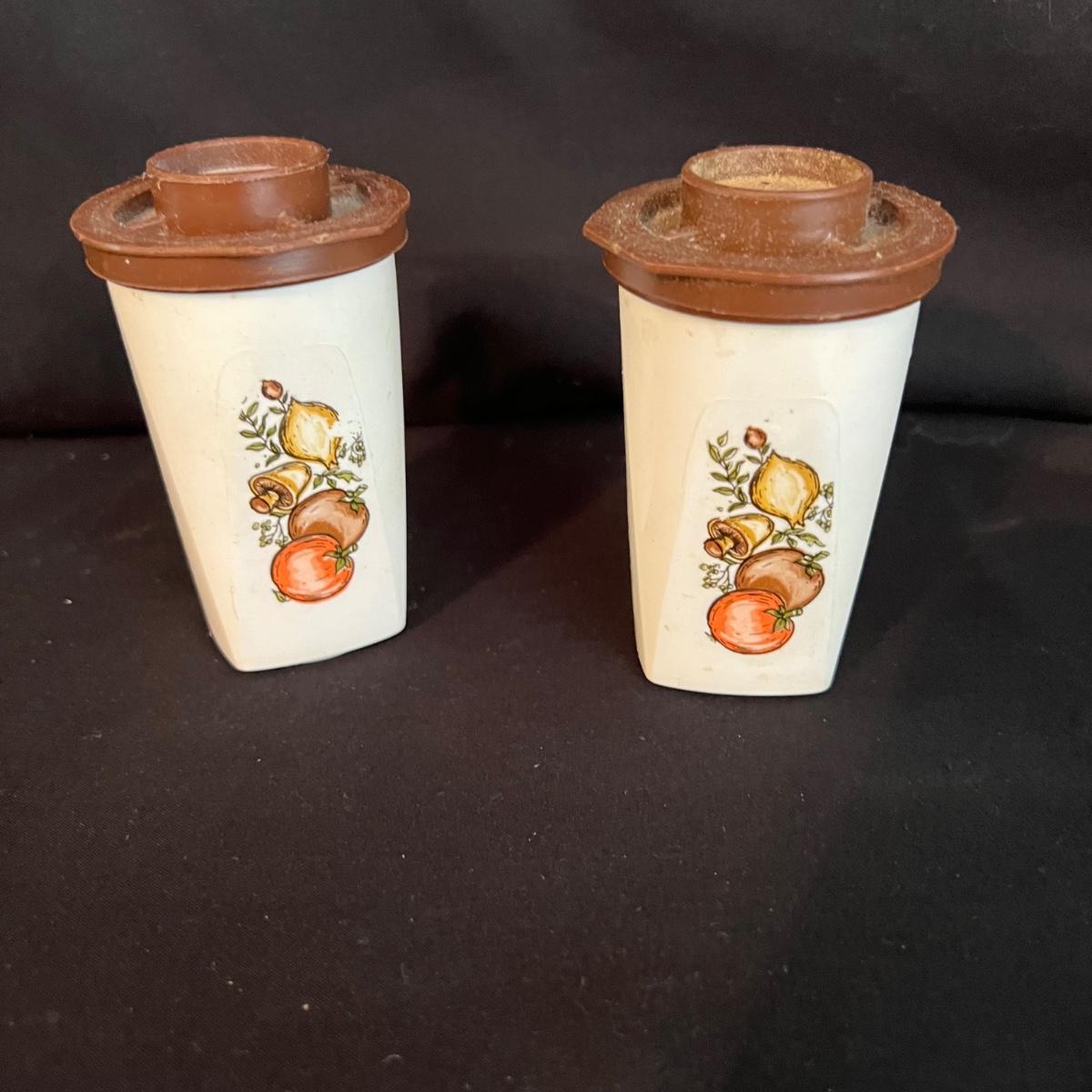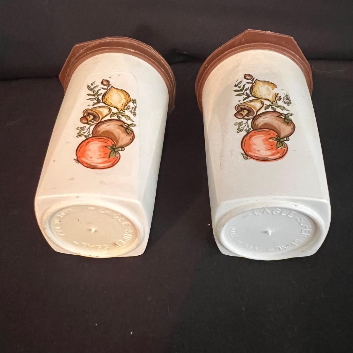 Vintage Federal House Chicago hand crank glass and plastic coffee grinder in green. Also seven vintage Tupperware storage containers. Two covered bowls 4.5”D x 3.5”H (one only one lid), three small cup containers measuring 2.75”D x 2”H (only one lid), one covered 8”D x 3.25”H round bowl and one uncovered 6” square by 3.5”H. Plastic salt and pepper shakers and a juicer. Also a glass and plastic chopper.