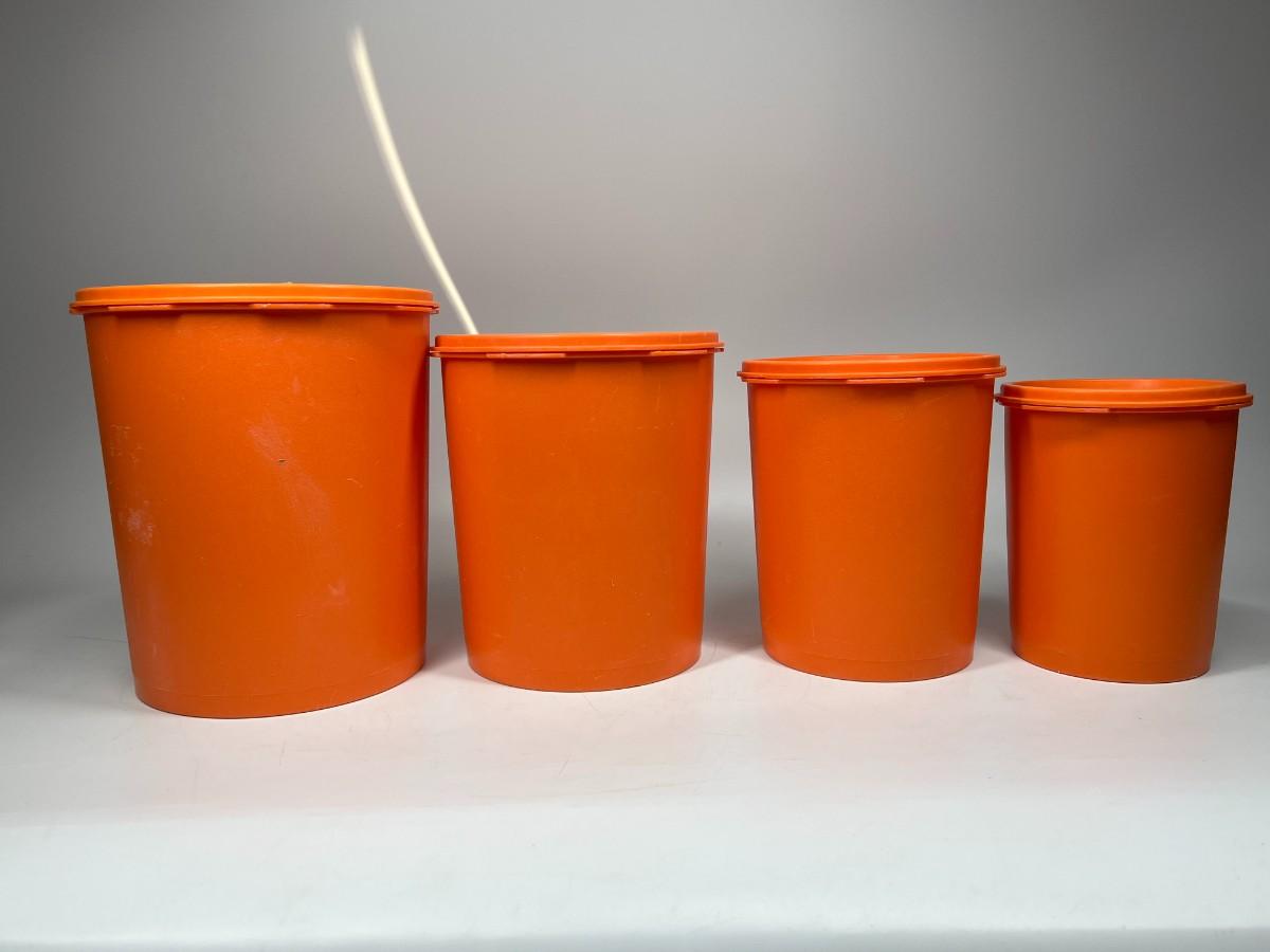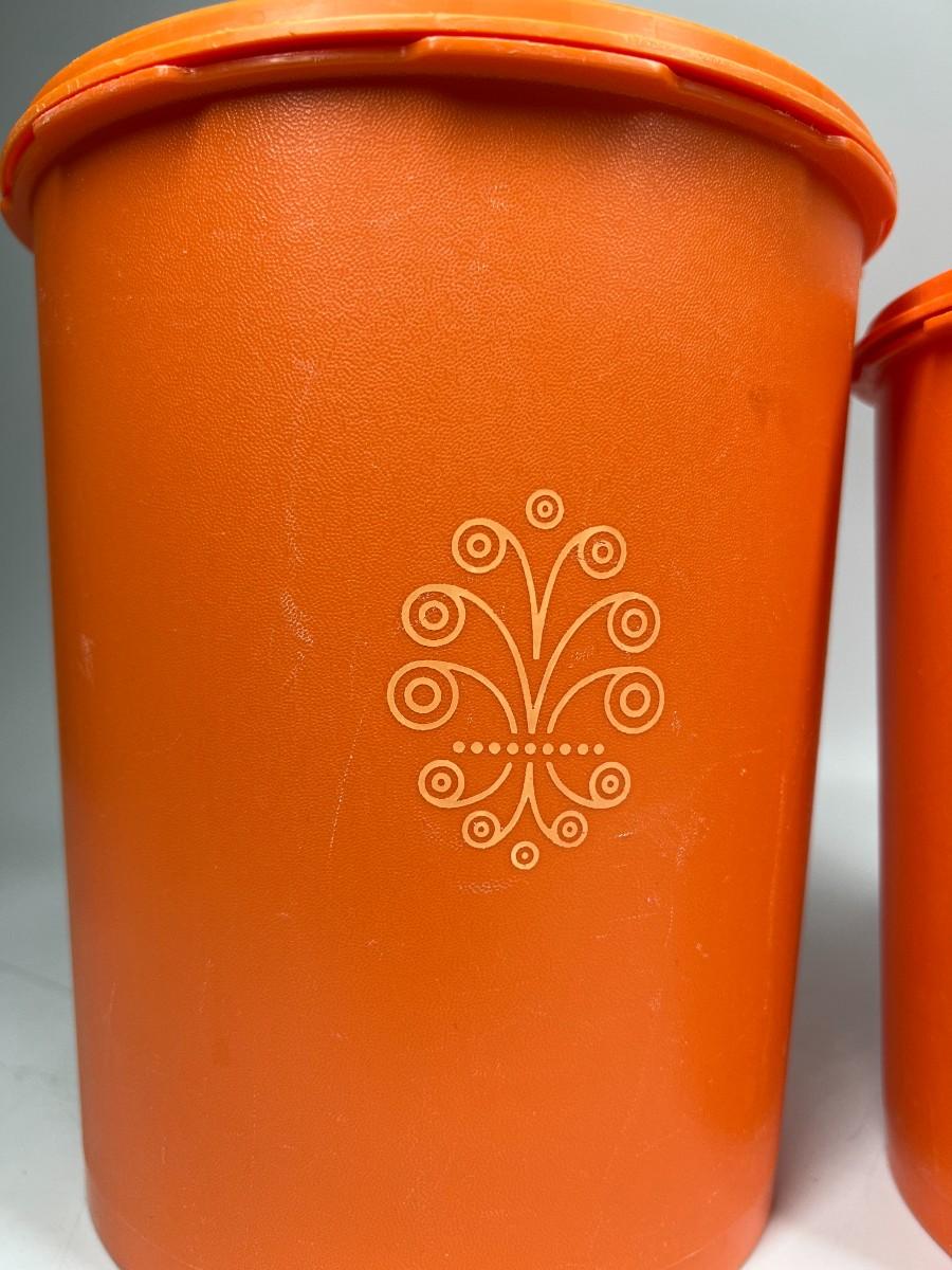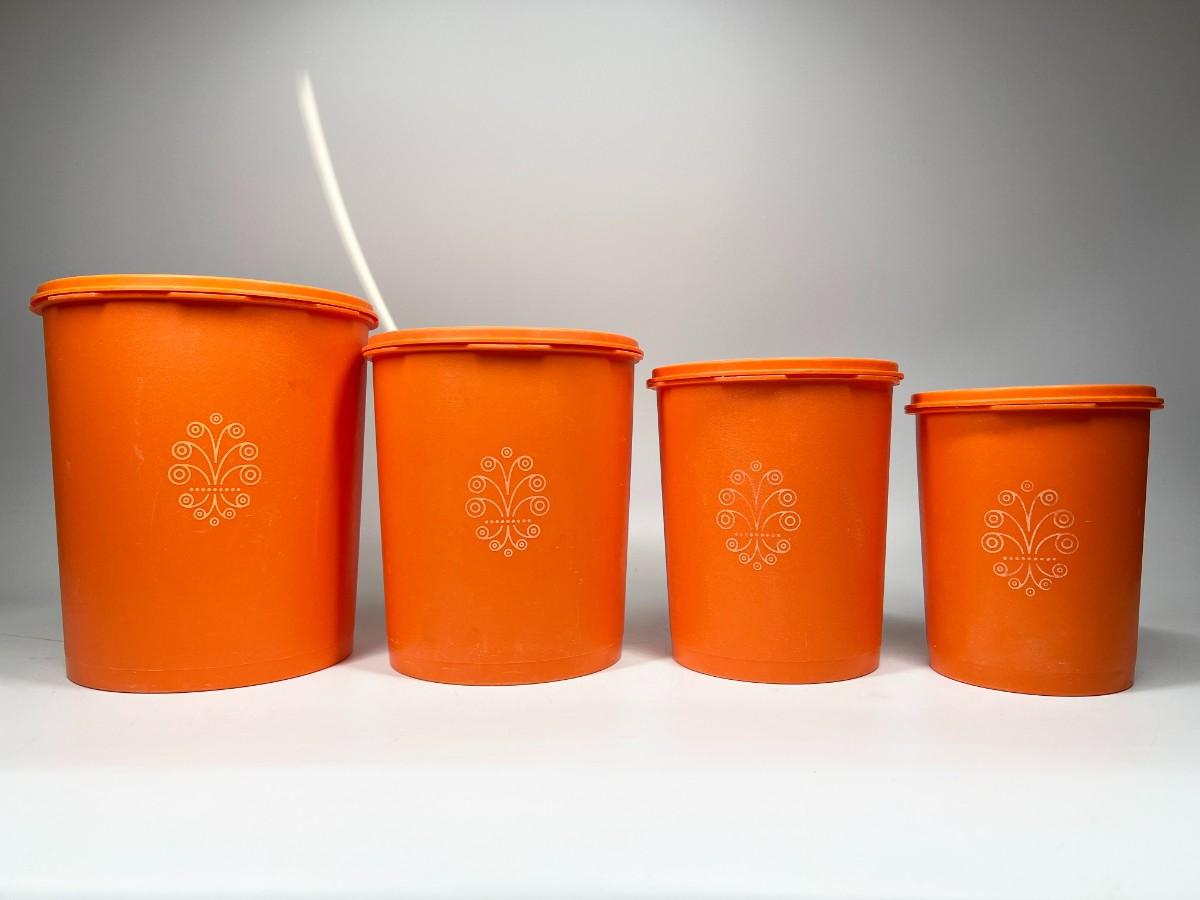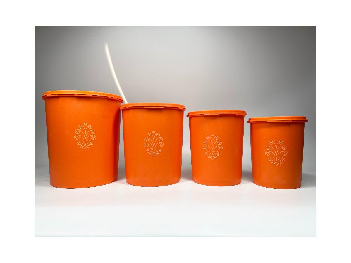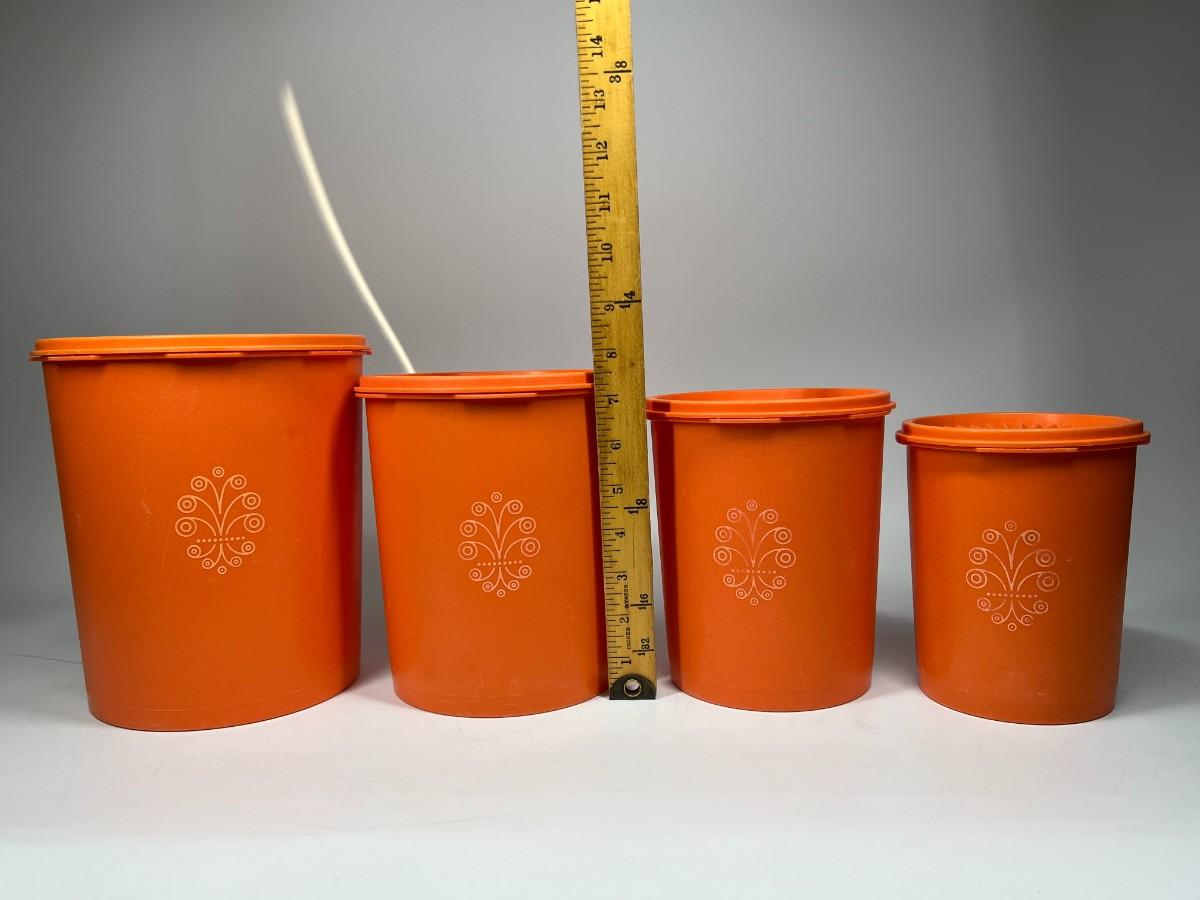 Vintage Tupperware Press Top Servailer Canister Storage Container Set, there is some vintage wear to the whole set and there is a small slice or cut on one of the lids, but is in overall fair vintage condition. Check pictures for more details and for sizing.