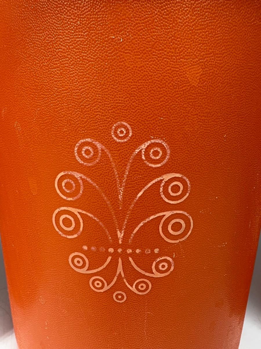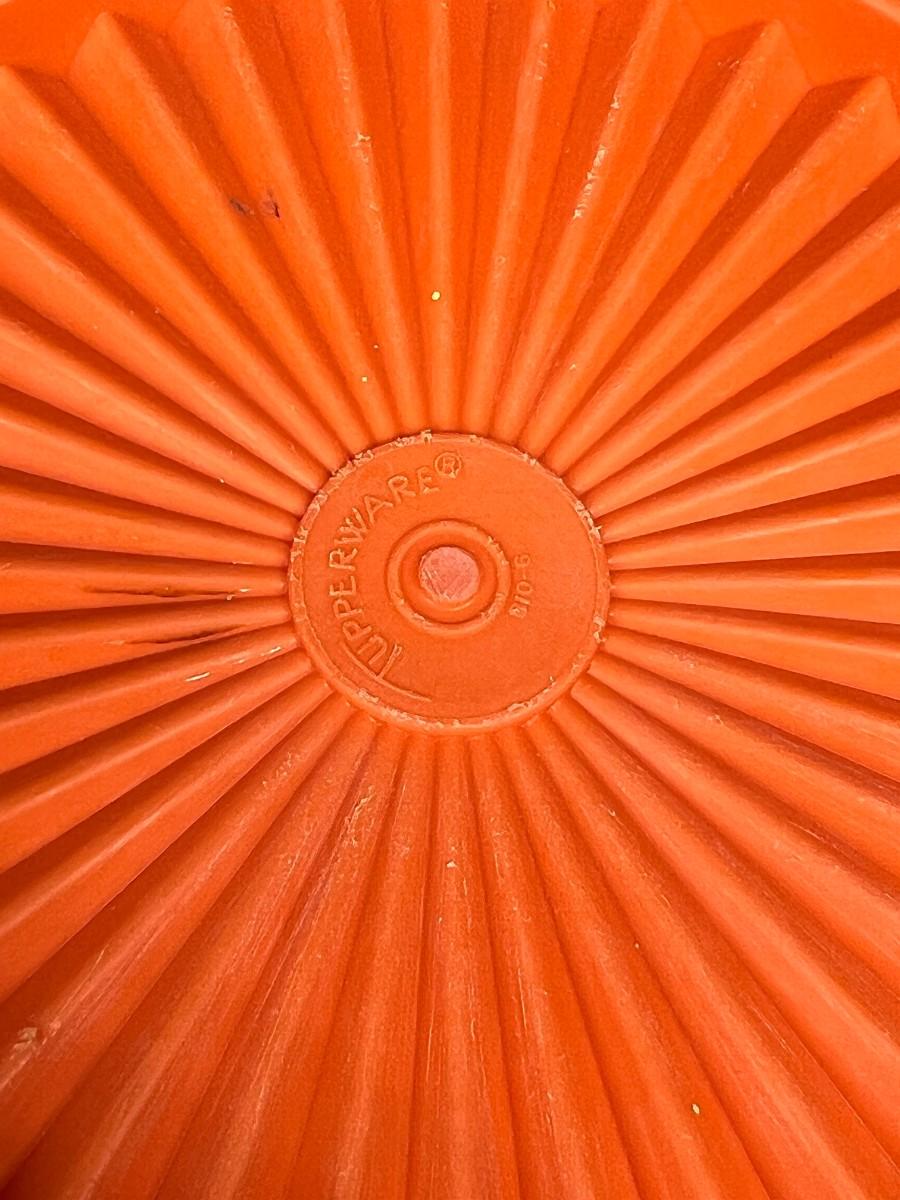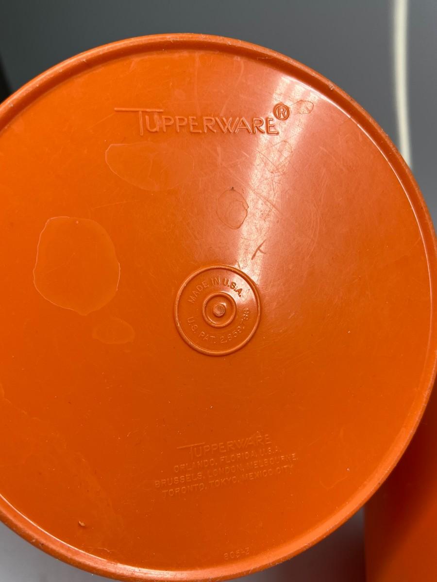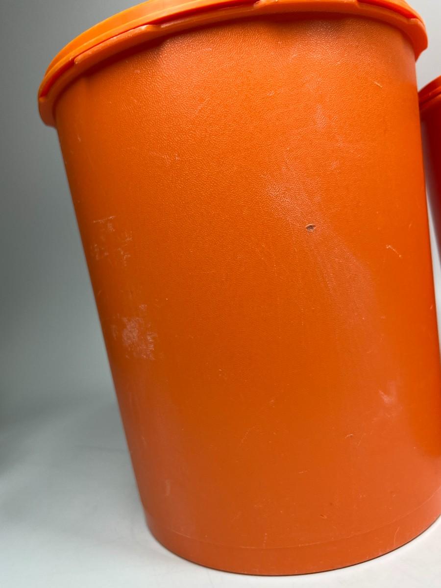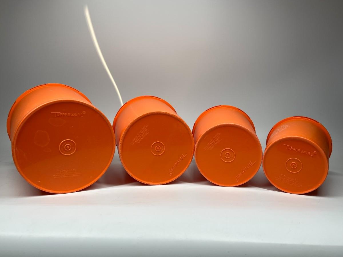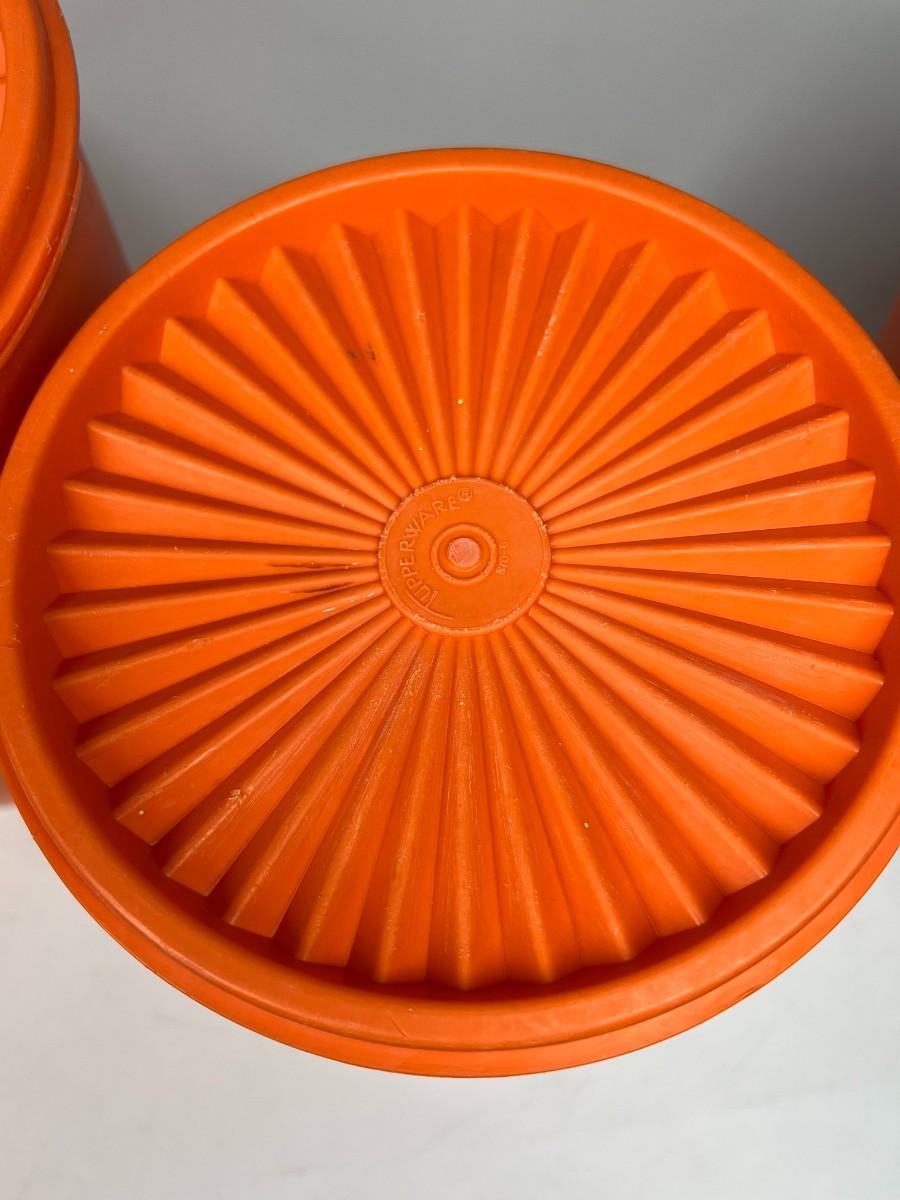Vintage Tupperware Press Top Servailer Canister Storage Container Set, there is some vintage wear to the whole set and there is a small slice or cut on one of the lids, but is in overall fair vintage condition. Check pictures for more details and for sizing.