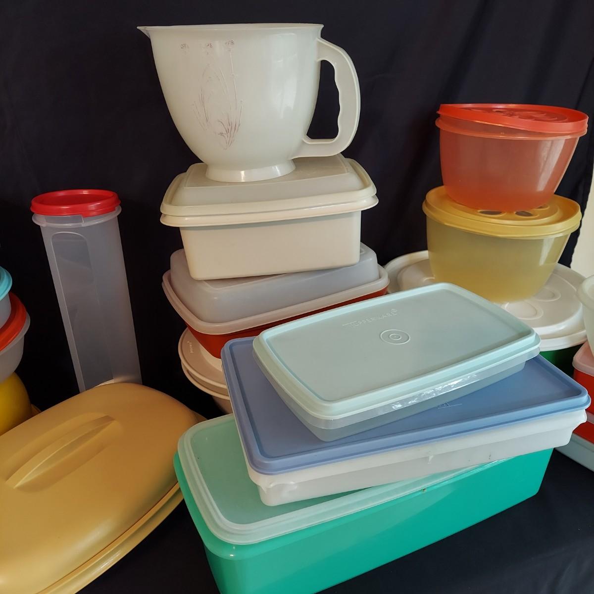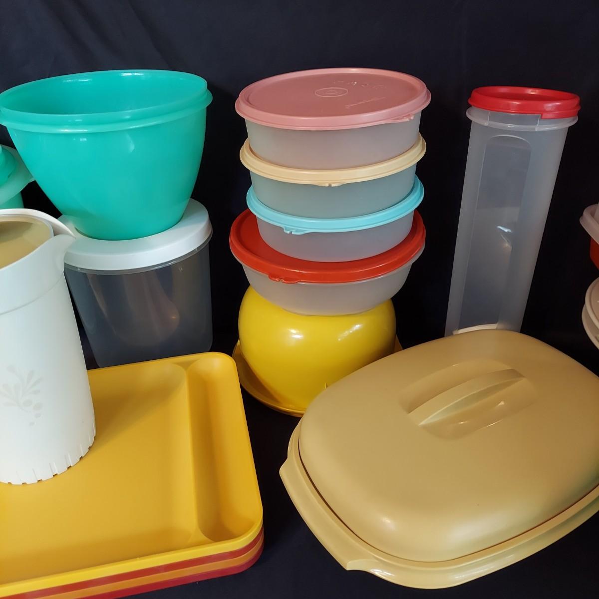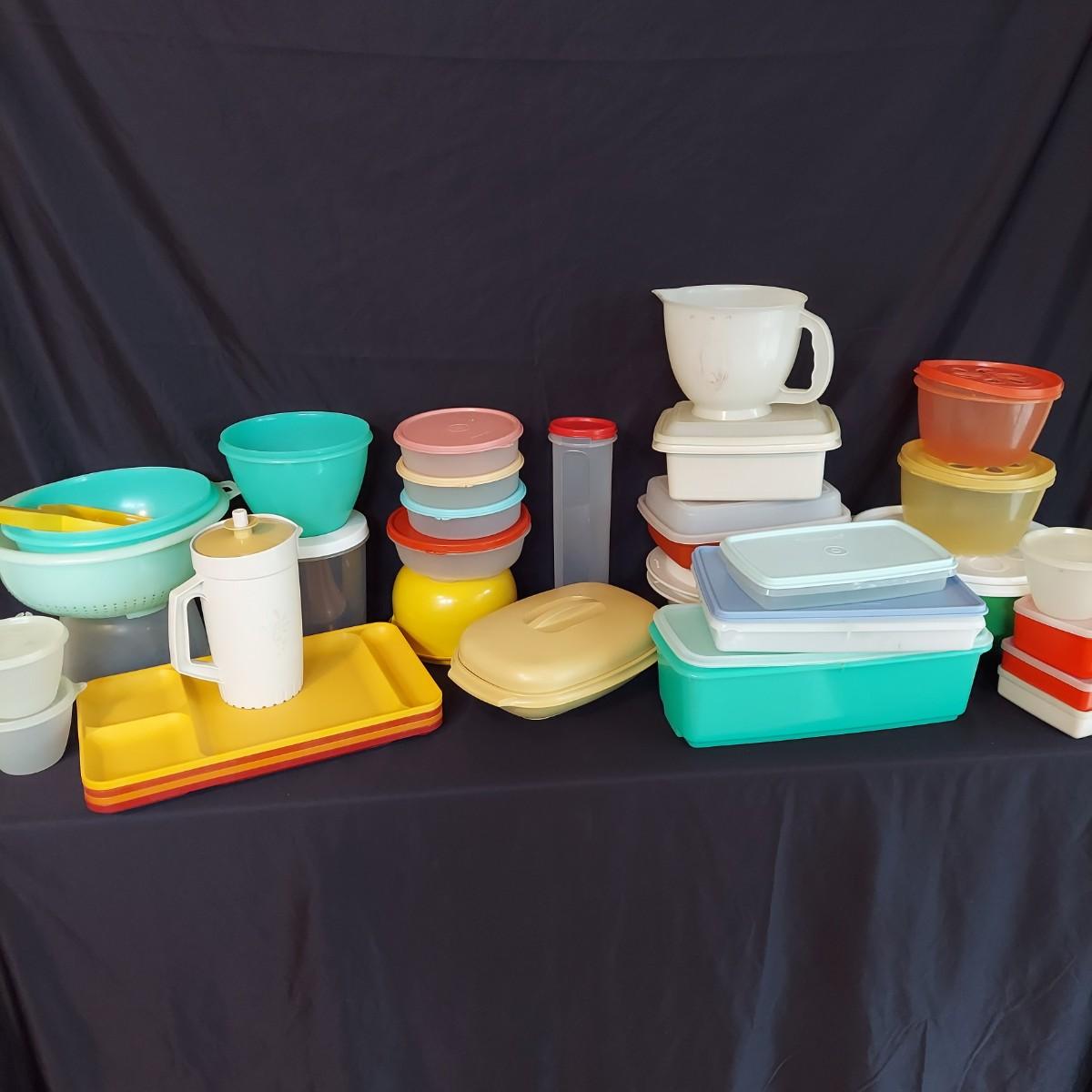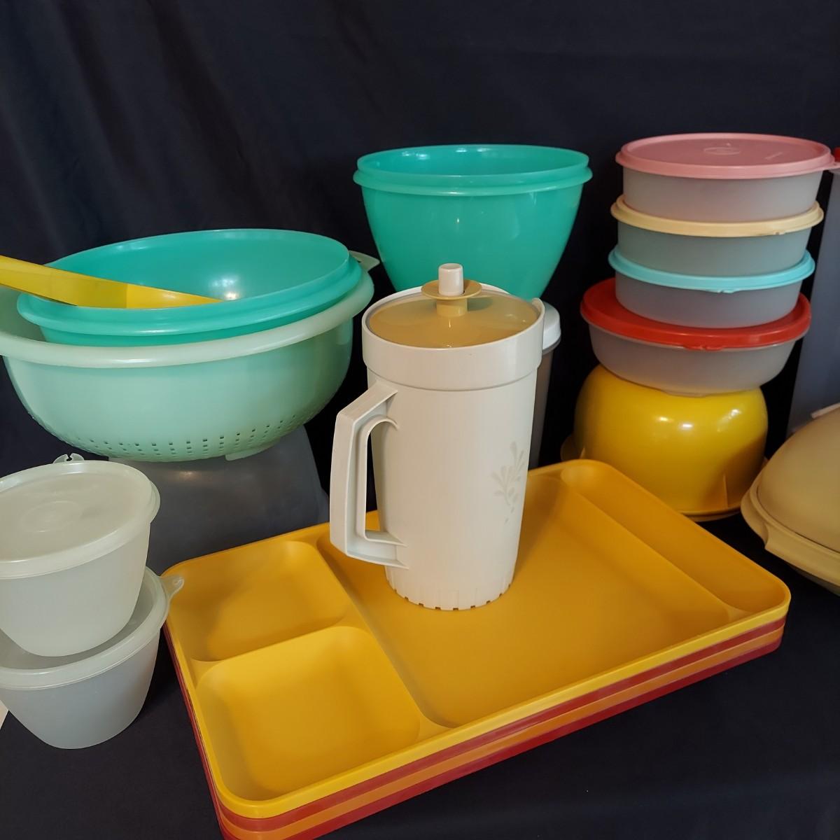 Several pieces of vintage Tupperware in various shades. Some overall wear due to age. The trays 15" x 9" x 1"H. This is a large lot with 30+ items. Local Pickup Only.