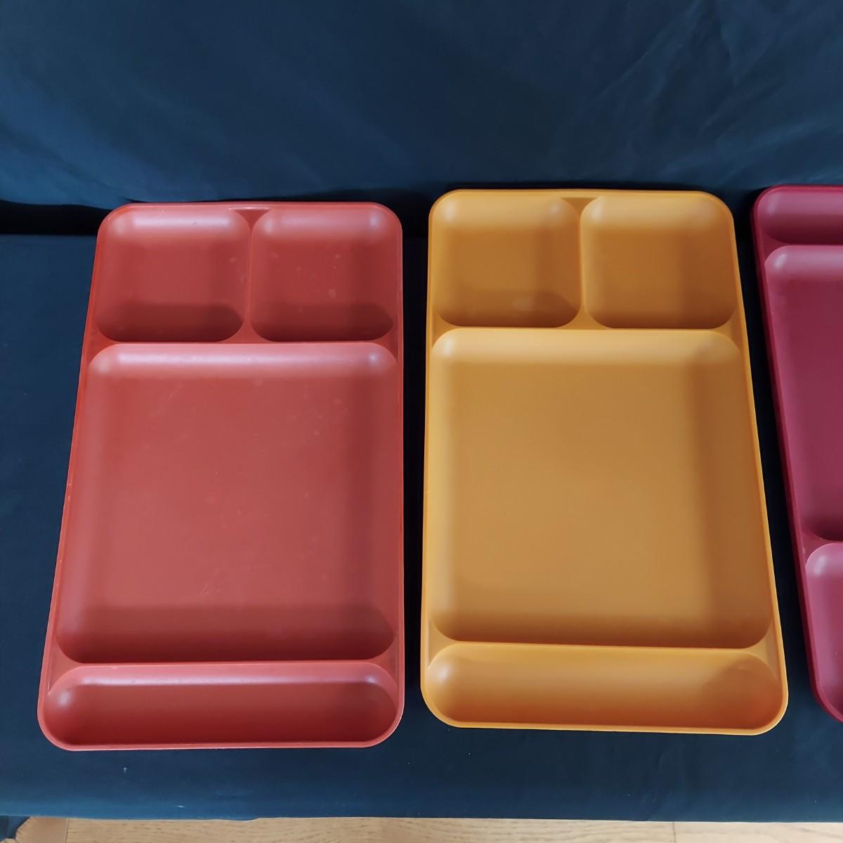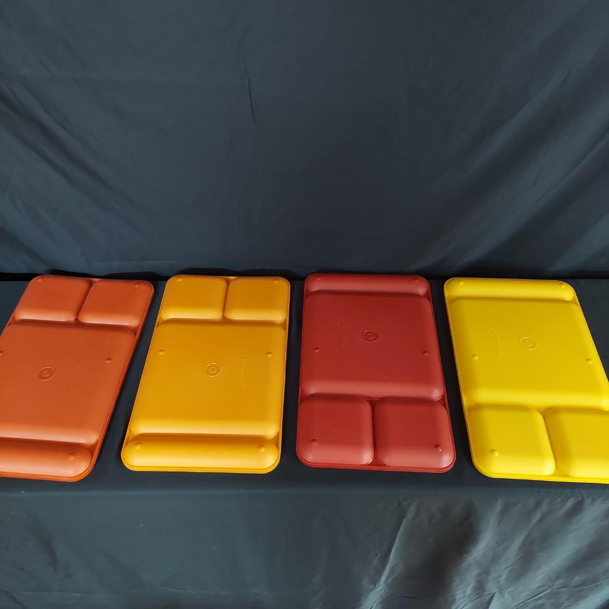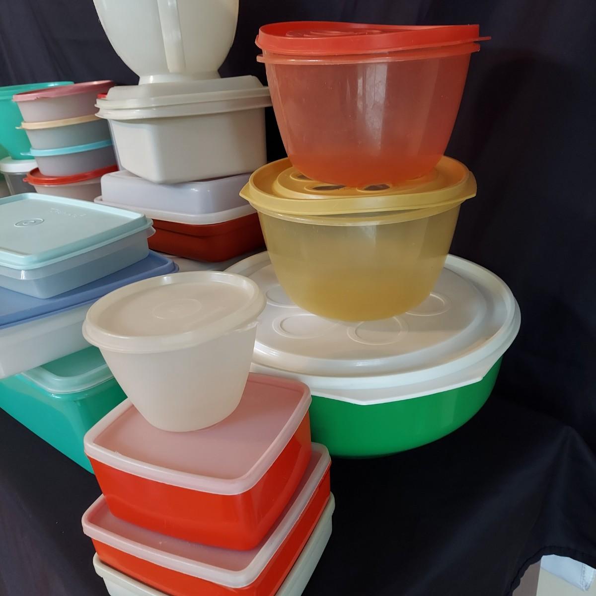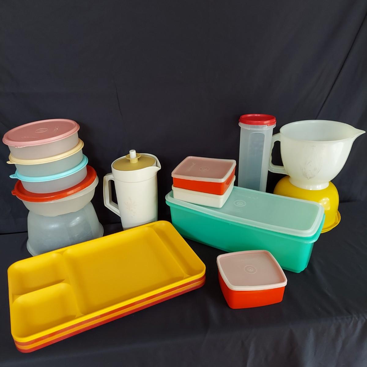 Several pieces of vintage Tupperware in various shades. Some overall wear due to age. The trays 15" x 9" x 1"H. This is a large lot with 30+ items. Local Pickup Only.