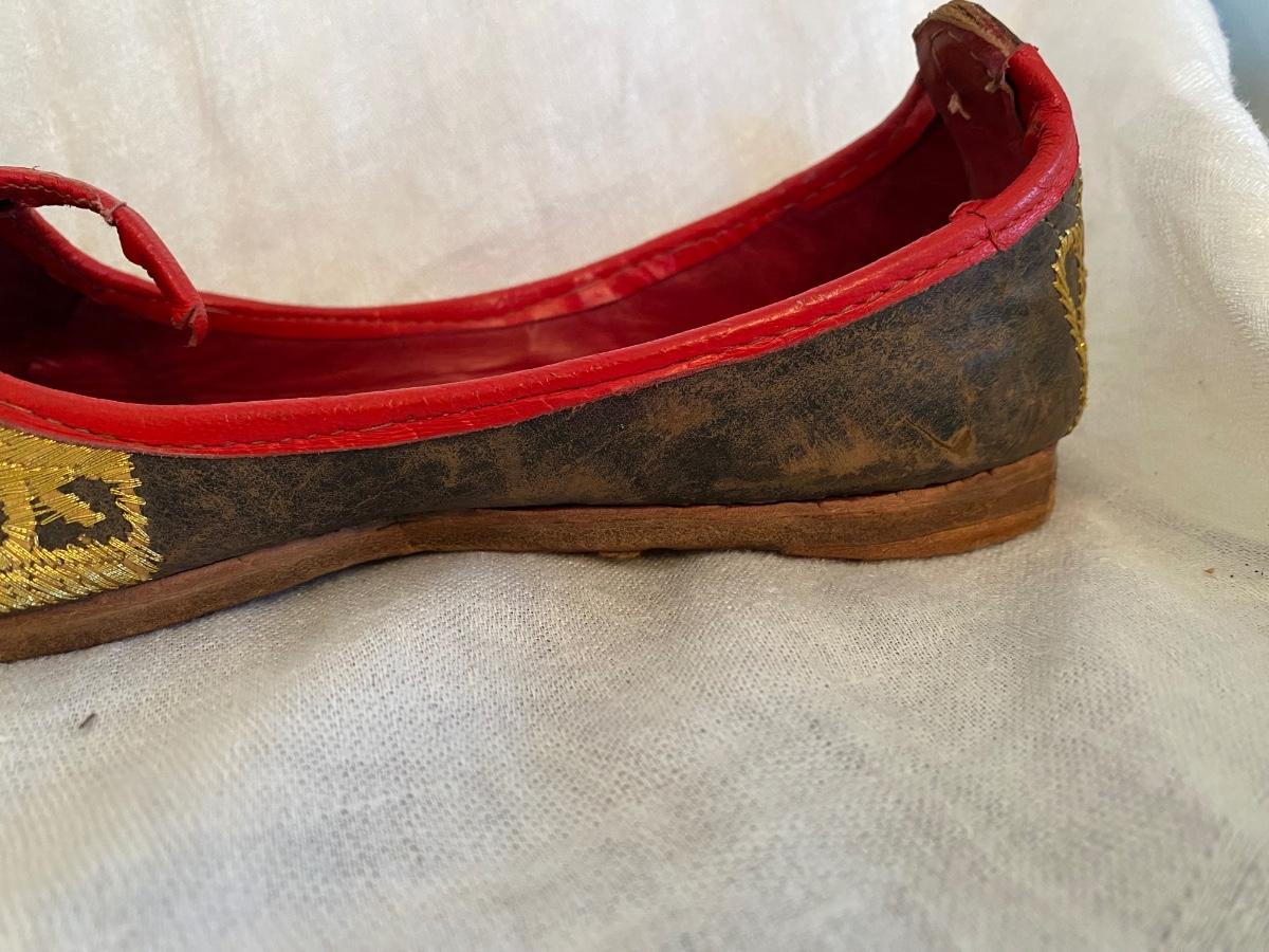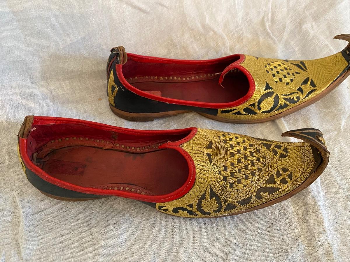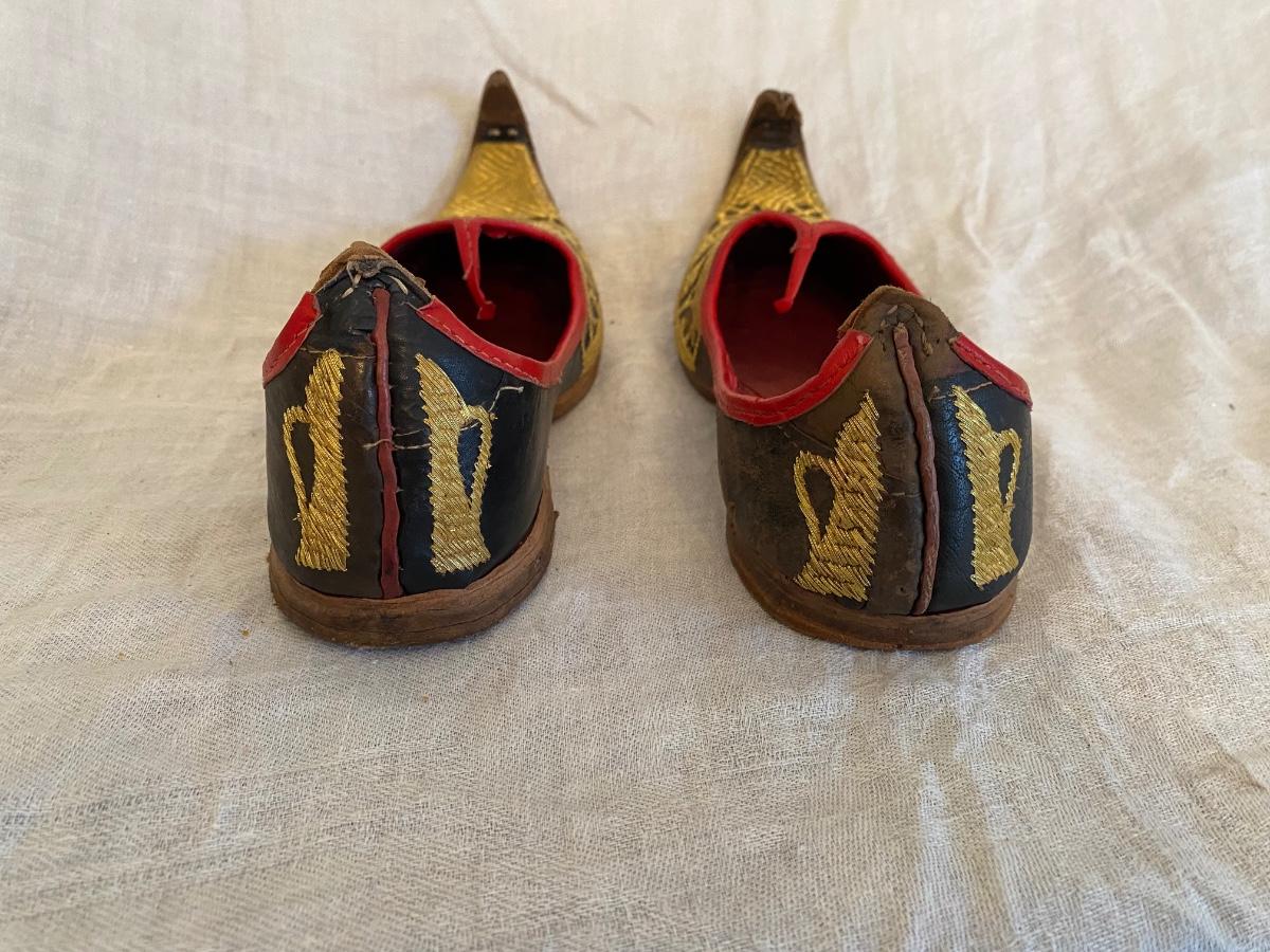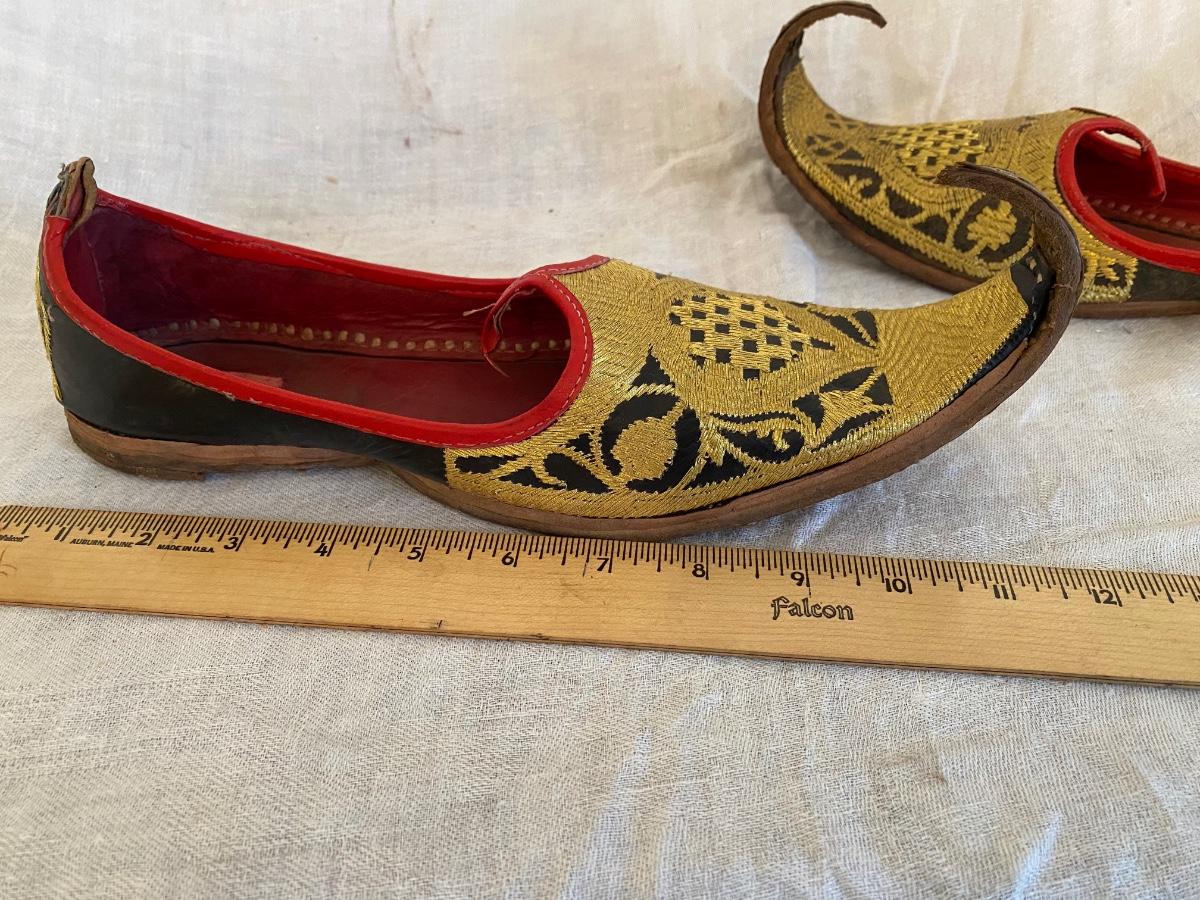 Vintage Turkish handstitched leather slippers with gold thread embriodery. Souvenirs . In good vintage condition. Minor wear. Sticker says 8.5 size but also ruler for size approximation