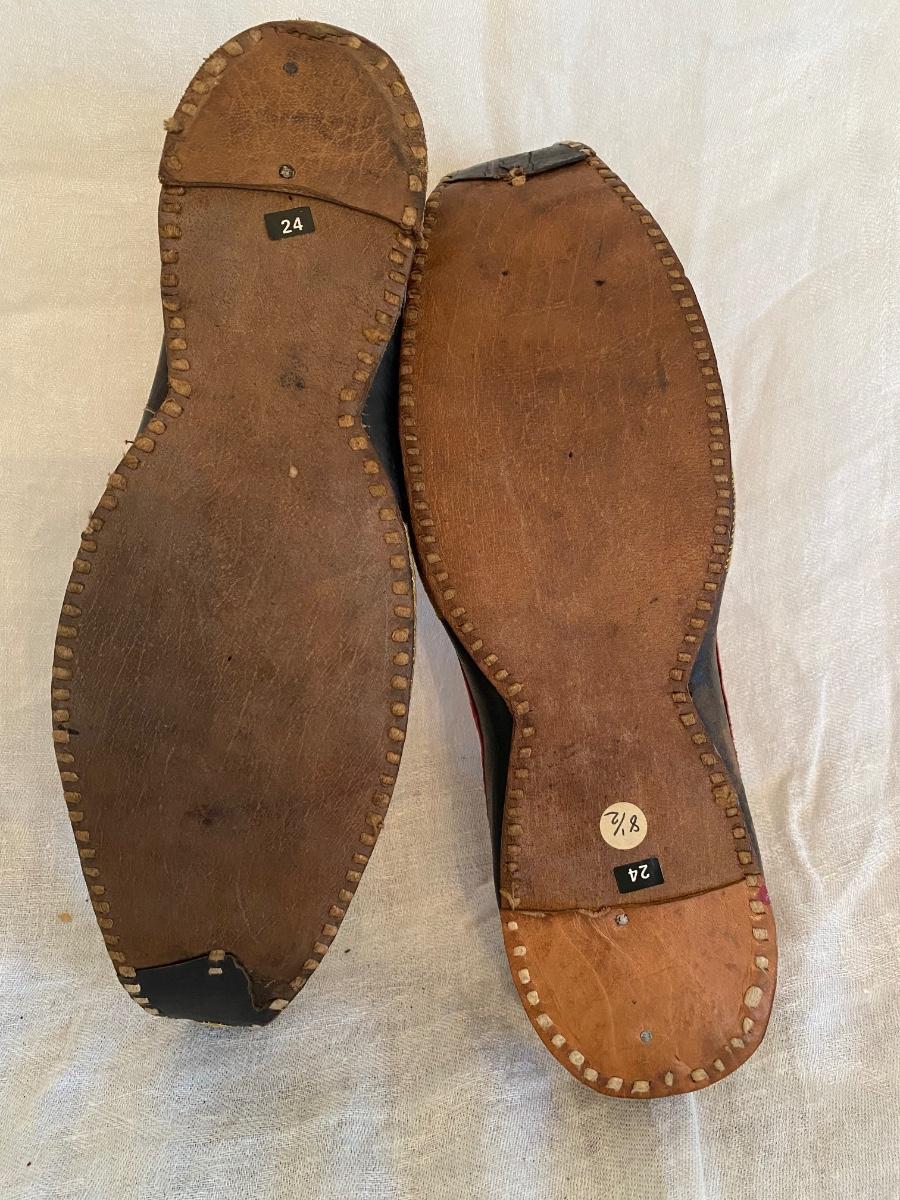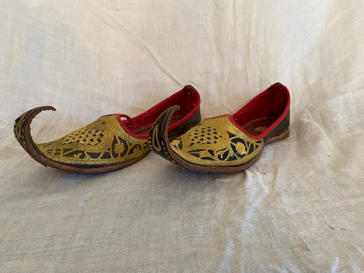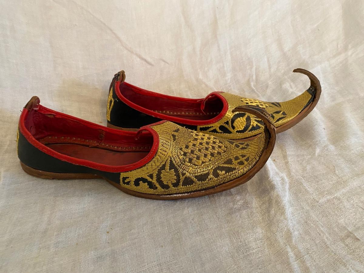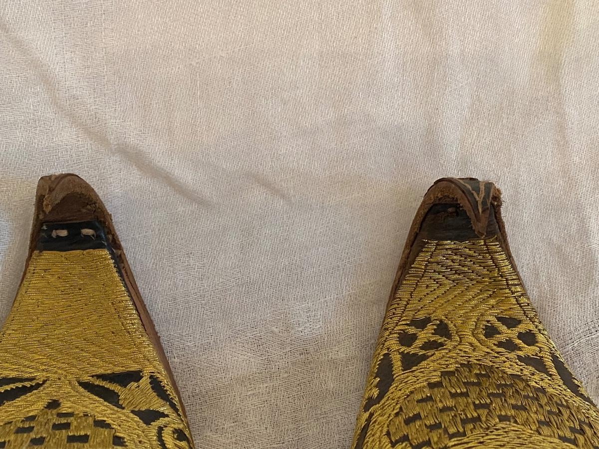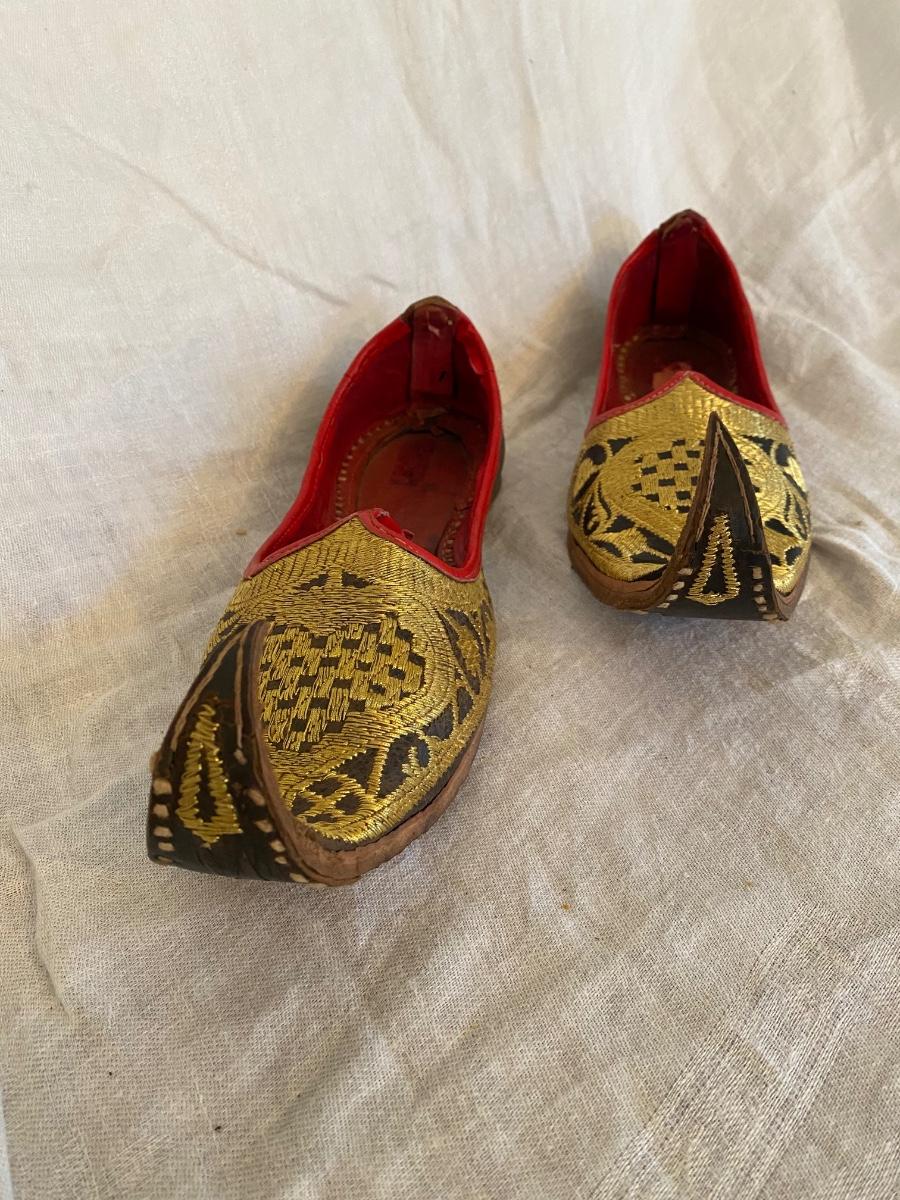 Vintage Turkish handstitched leather slippers with gold thread embriodery. Souvenirs . In good vintage condition. Minor wear. Sticker says 8.5 size but also ruler for size approximation
