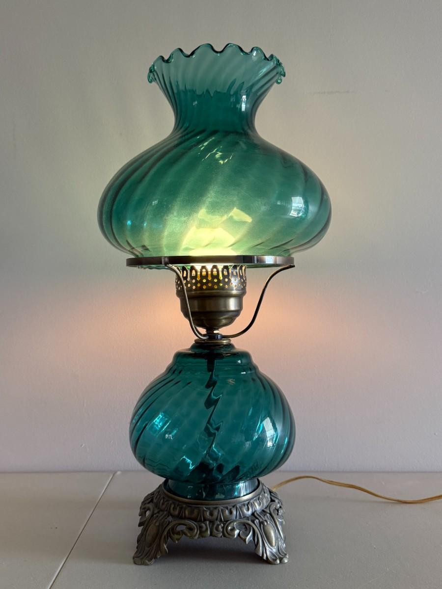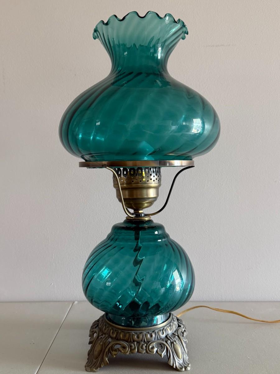 Vintage Turquoise Carnival Glass Hurricane Lamp