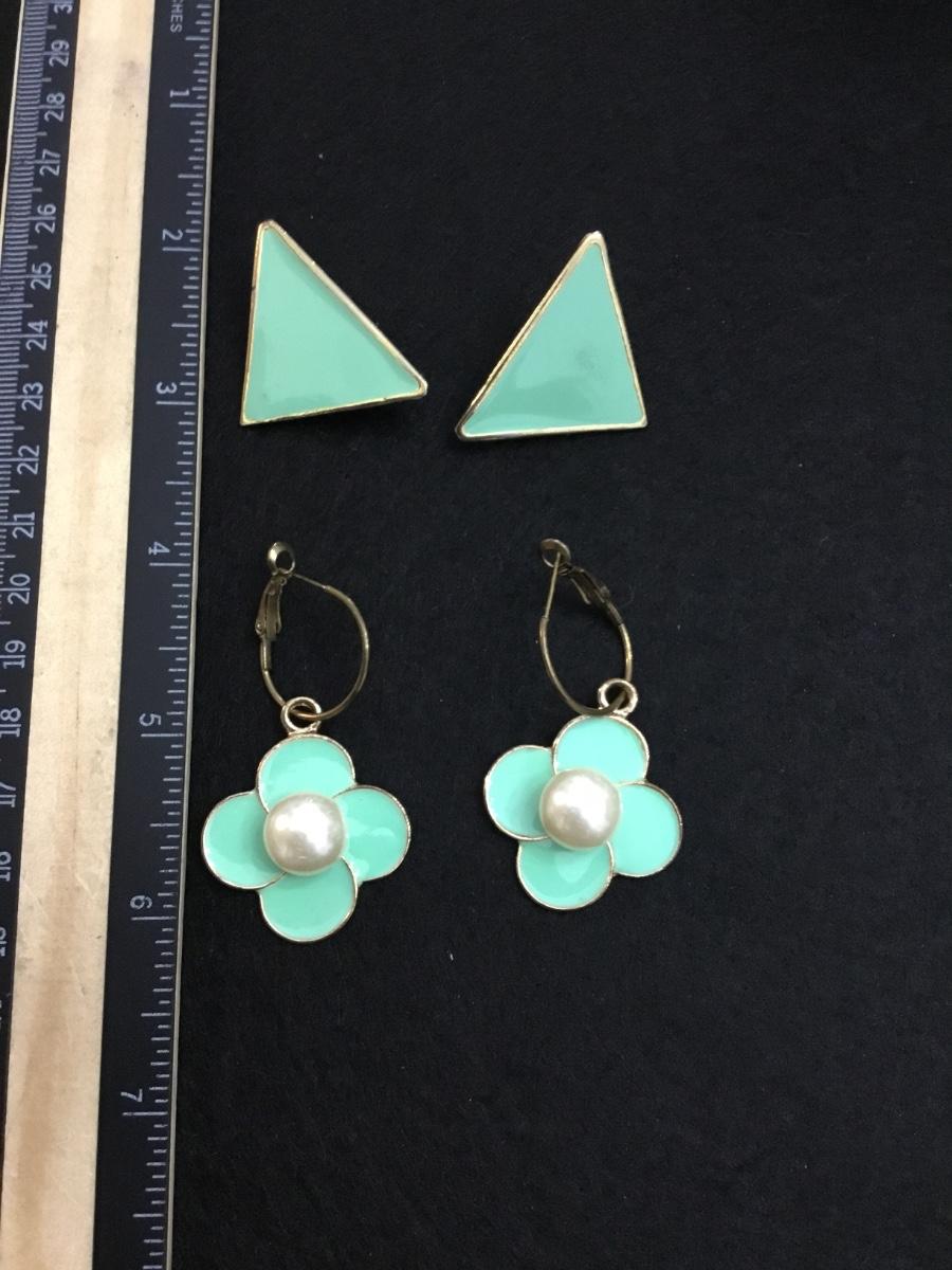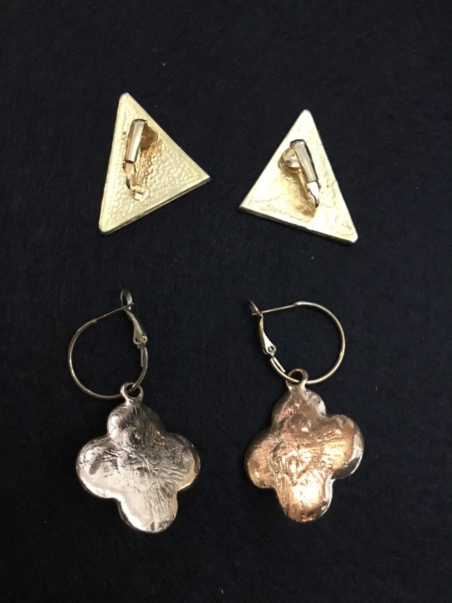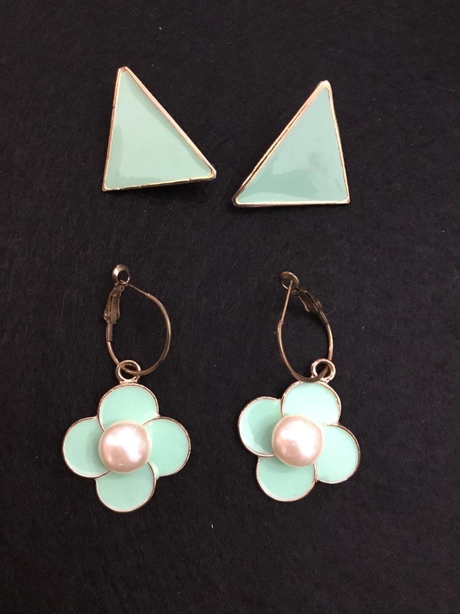 Vintage, turquoise, enamel triangle and flower clip on earrings and dangle earrings, gold toned