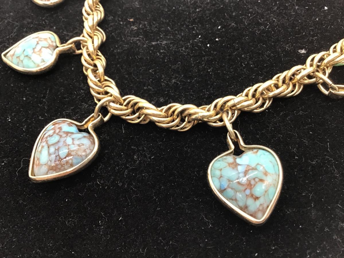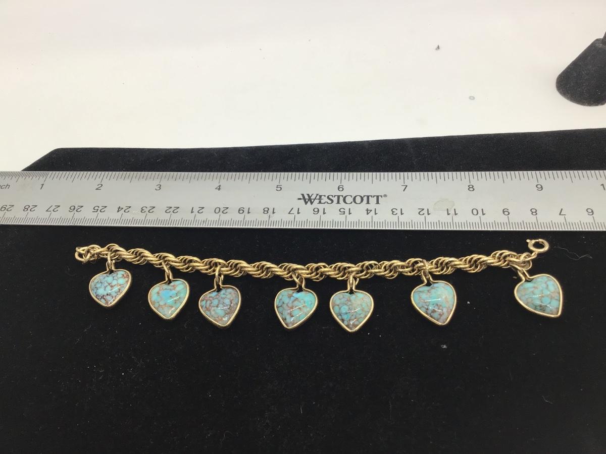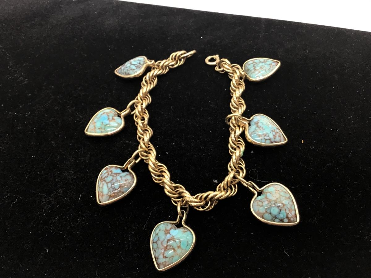 Vintage turquoise, heart type charm bracelet, gold tone