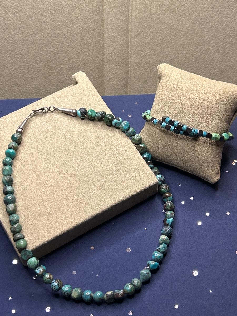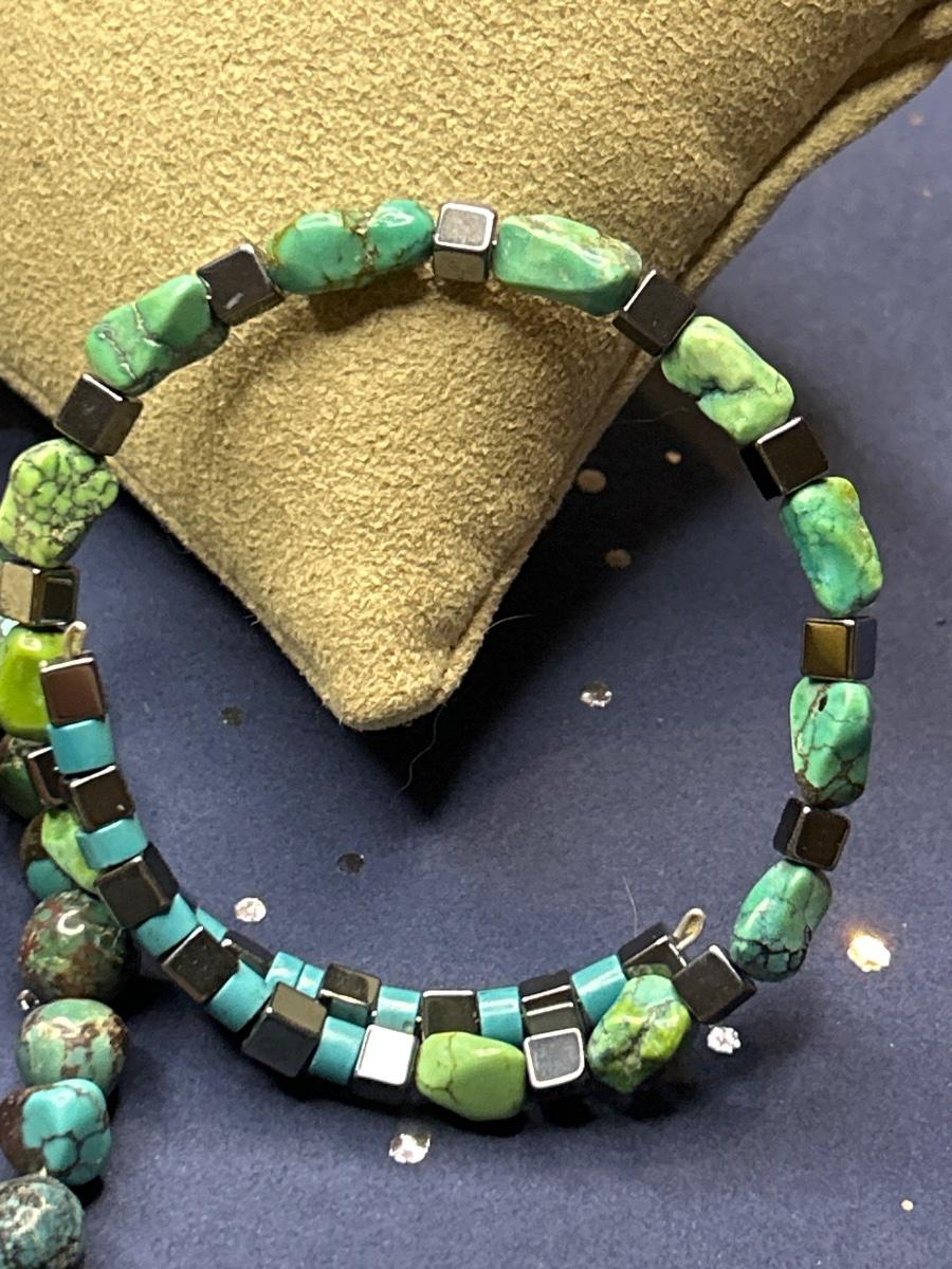 Clasps not stamped but I think it’s sterling. The cute bracelet is hematite, a bead & Gaspeite.