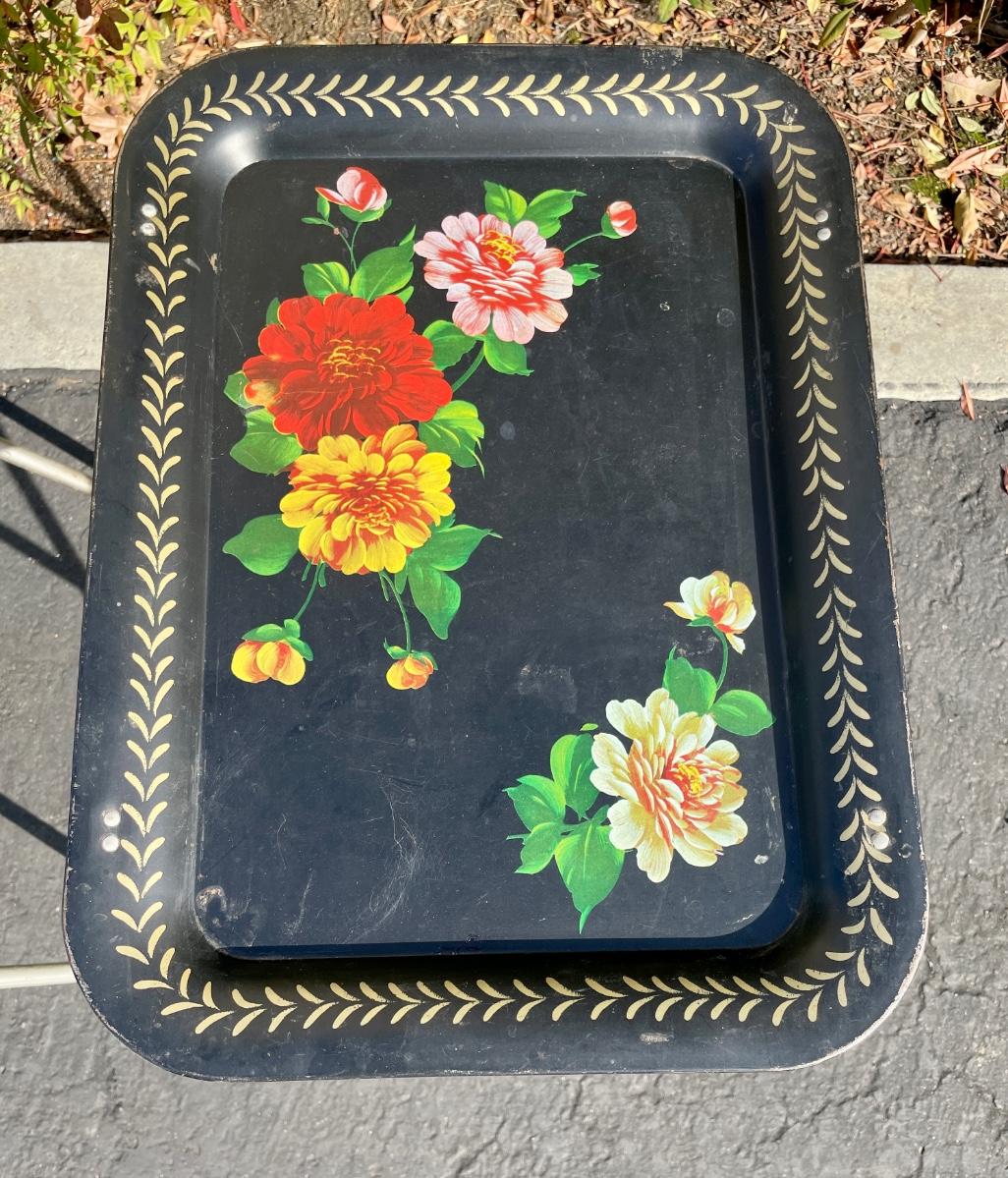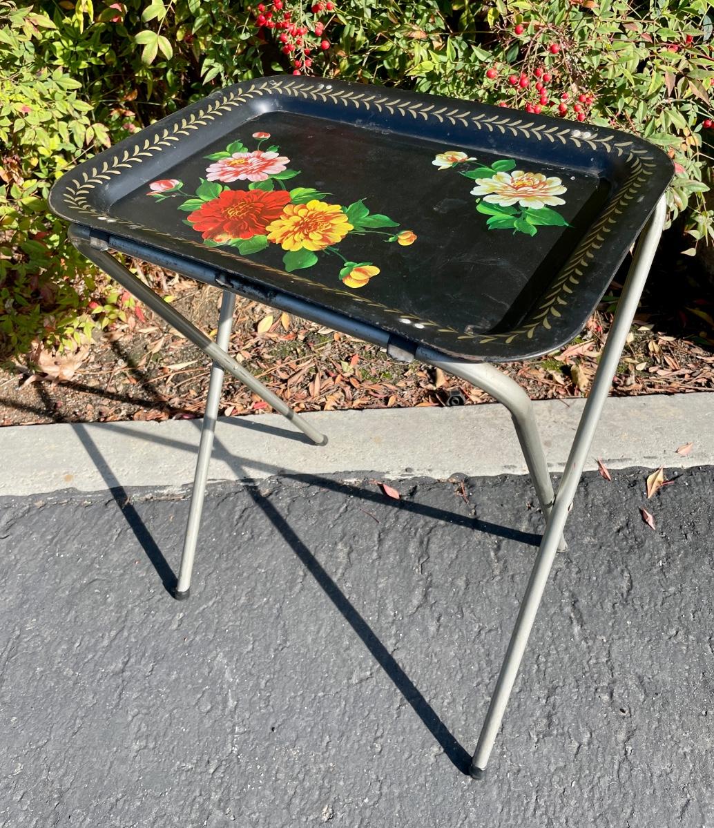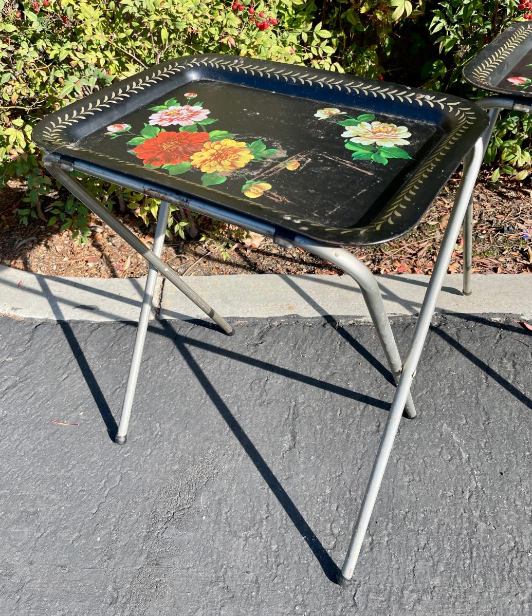 2 Vintage Mid Century Metal Folding Dinner TV Trays Tole Painted Roses Flowers