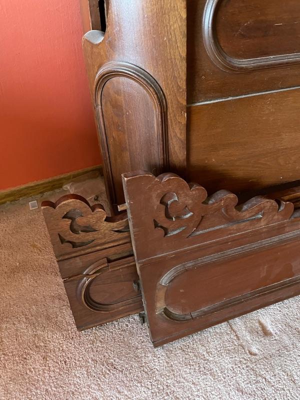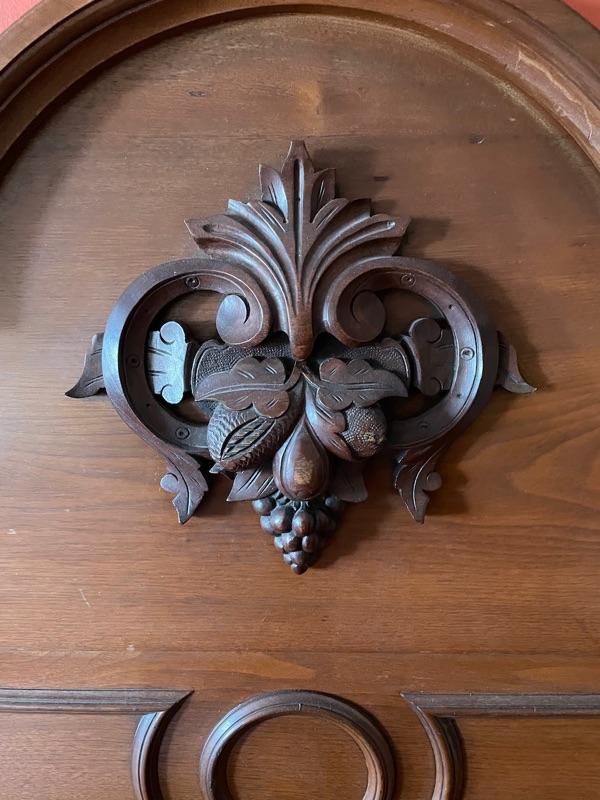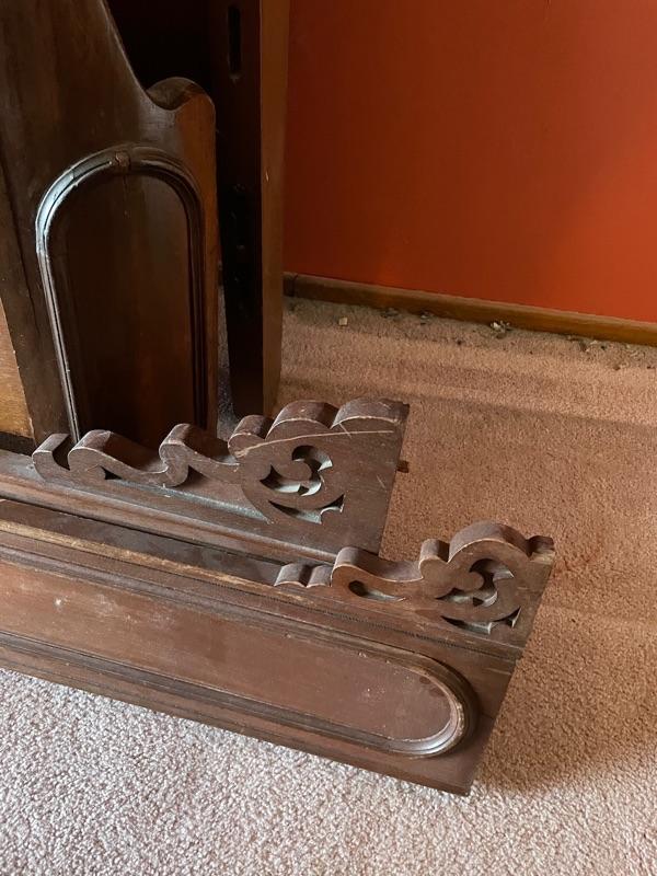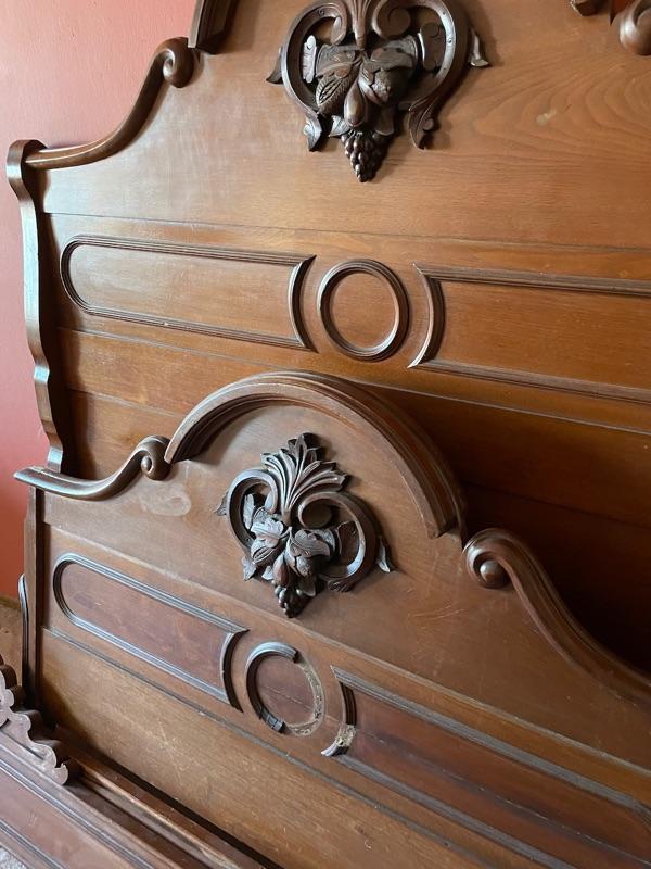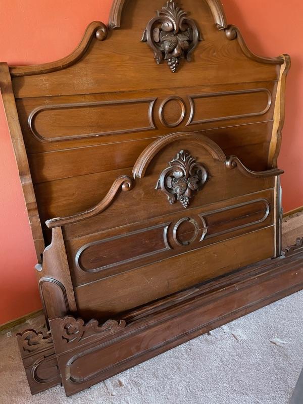 Wooden bedframe with fruit detailing on headboard and footboard. Headboard: 64” x 58”, Footboard 36” x 58”
