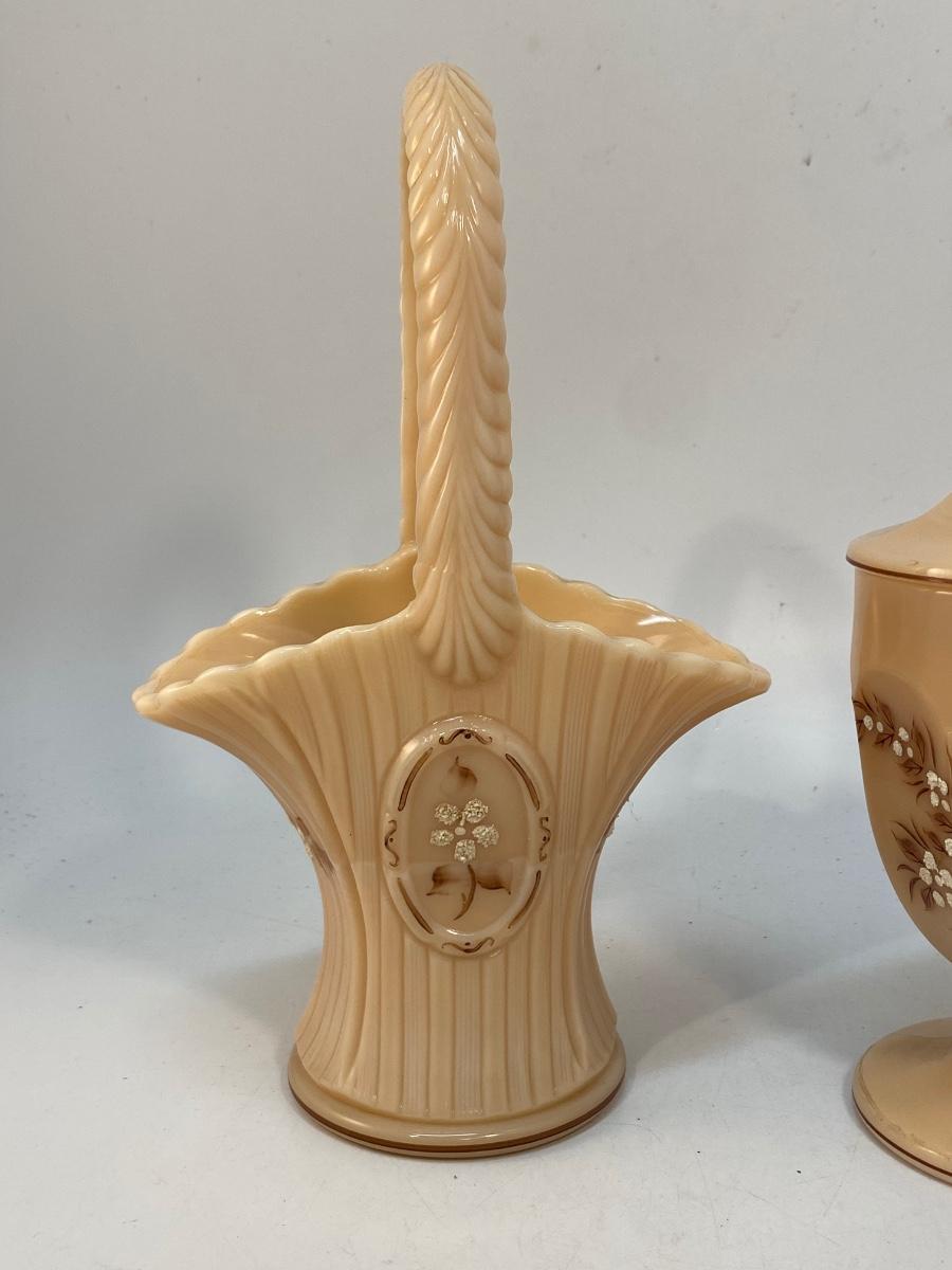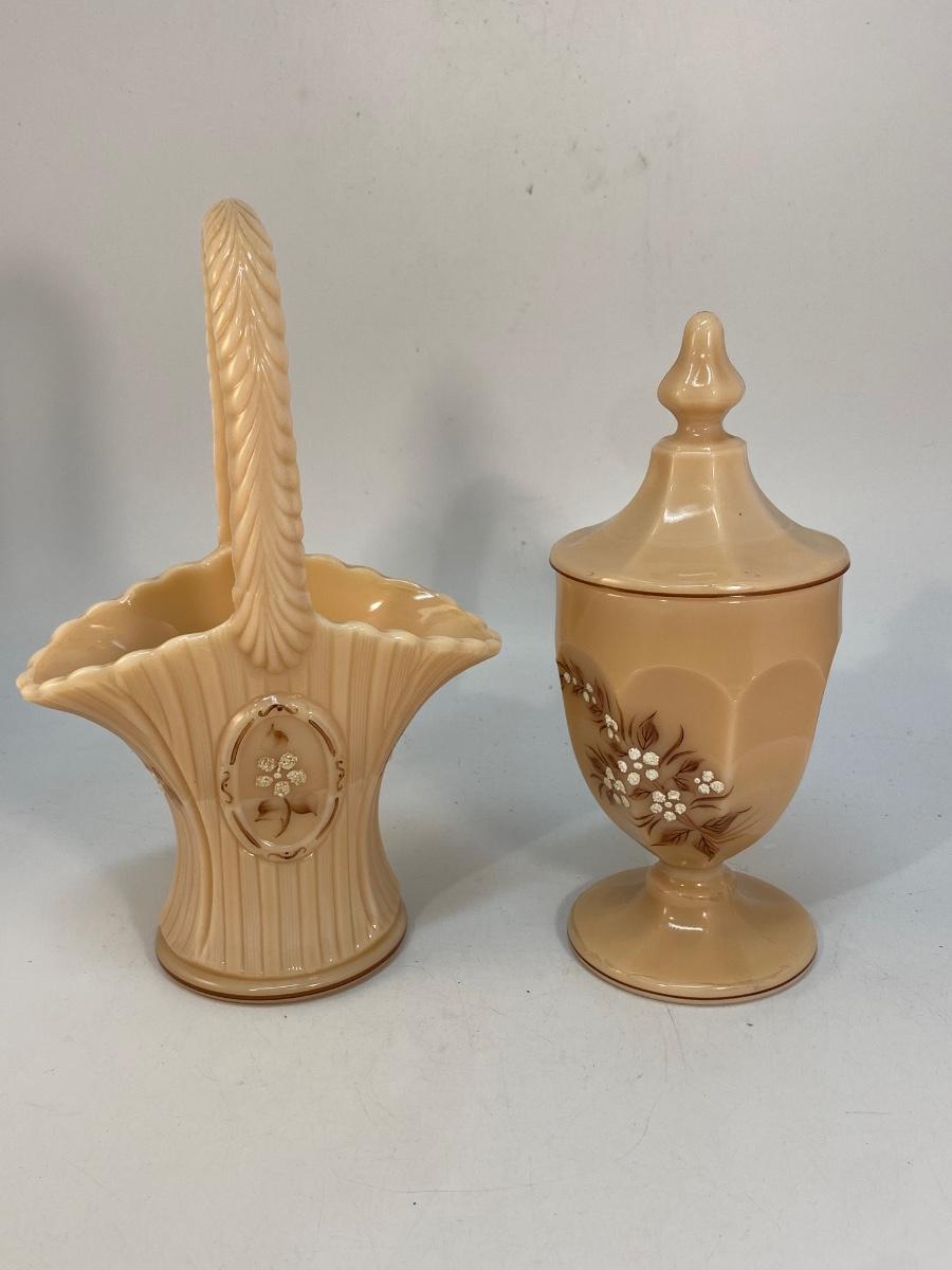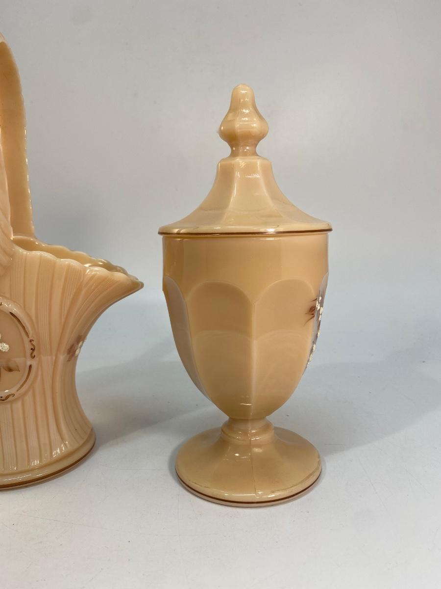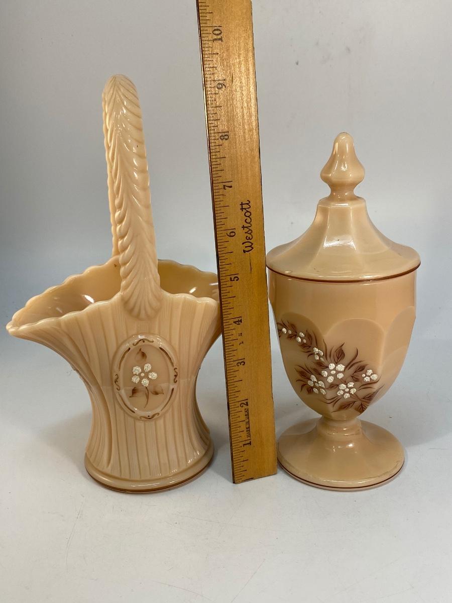 Vintage Two Piece Set Westmoreland Almond Glass Bridal Basket Lidded Apothecary Candy Dish