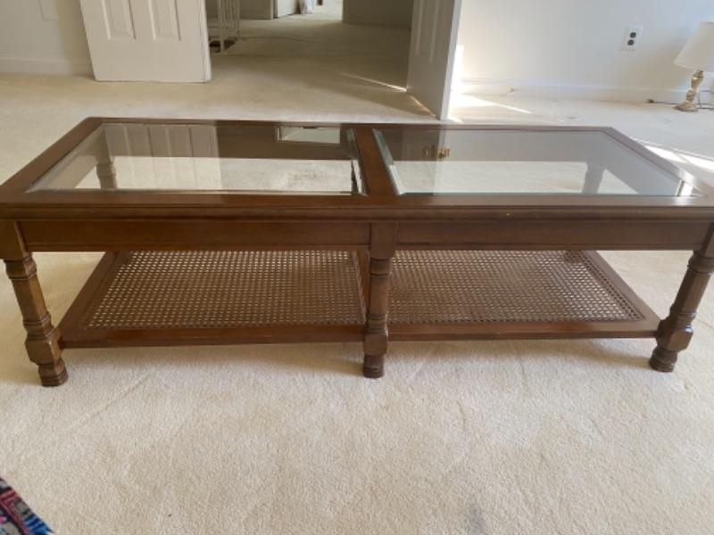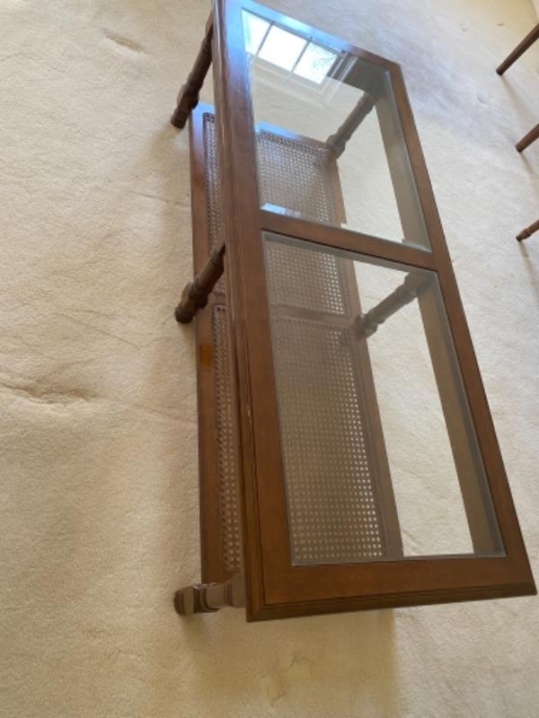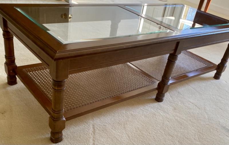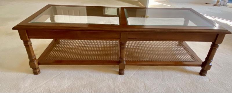 Vintage Two Tier Wood Coffee Table Glass and Cane