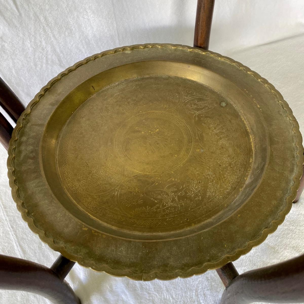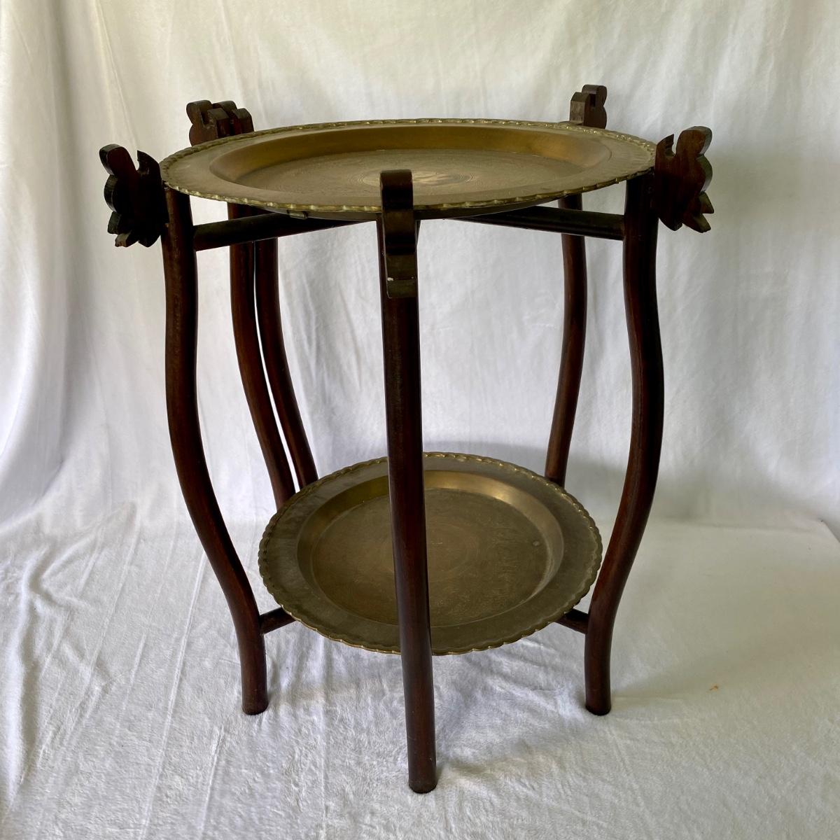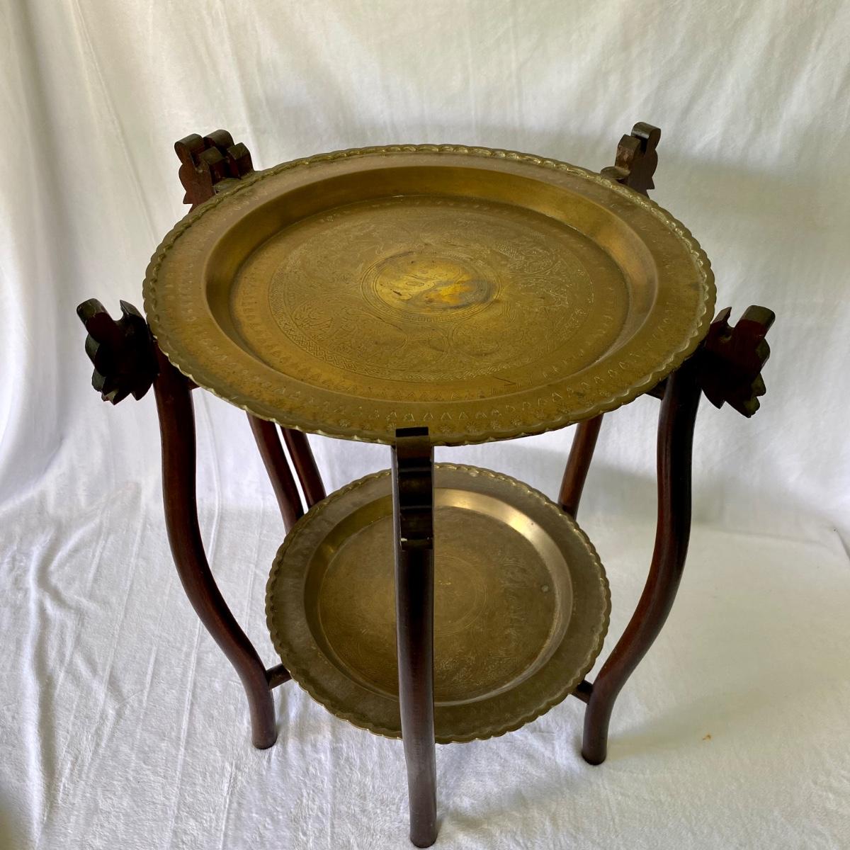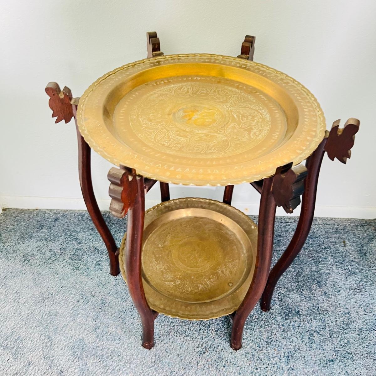 Vintage two tiered brass tray table with folding base. Asian decor, etched brass trays. Additional silver tray included. Large tray measure 16”D and smaller tray measures 14”D. Folding tray table measures 21”H. Good condition.