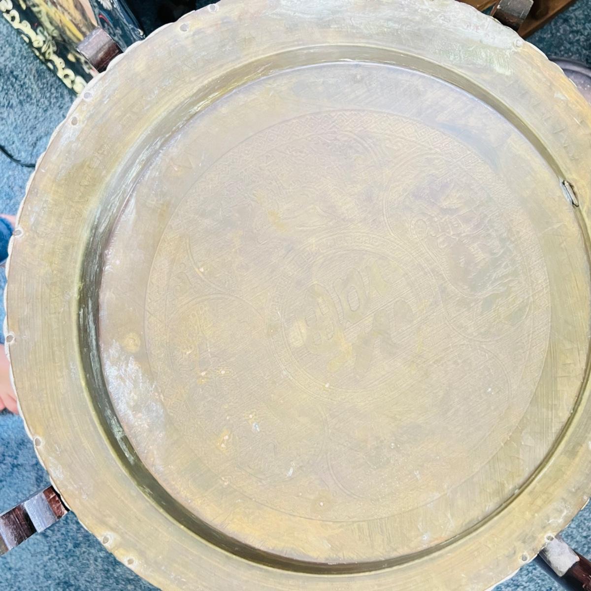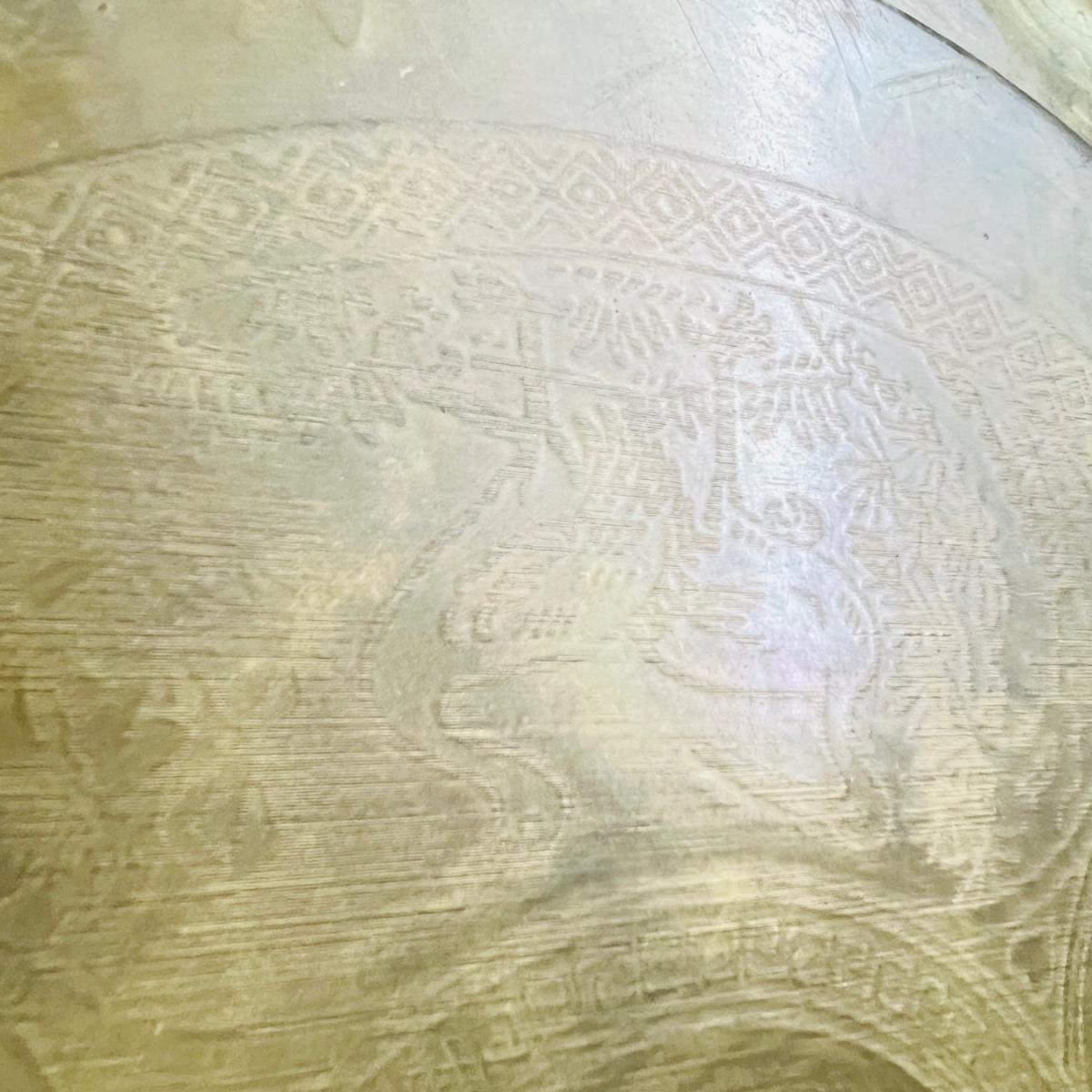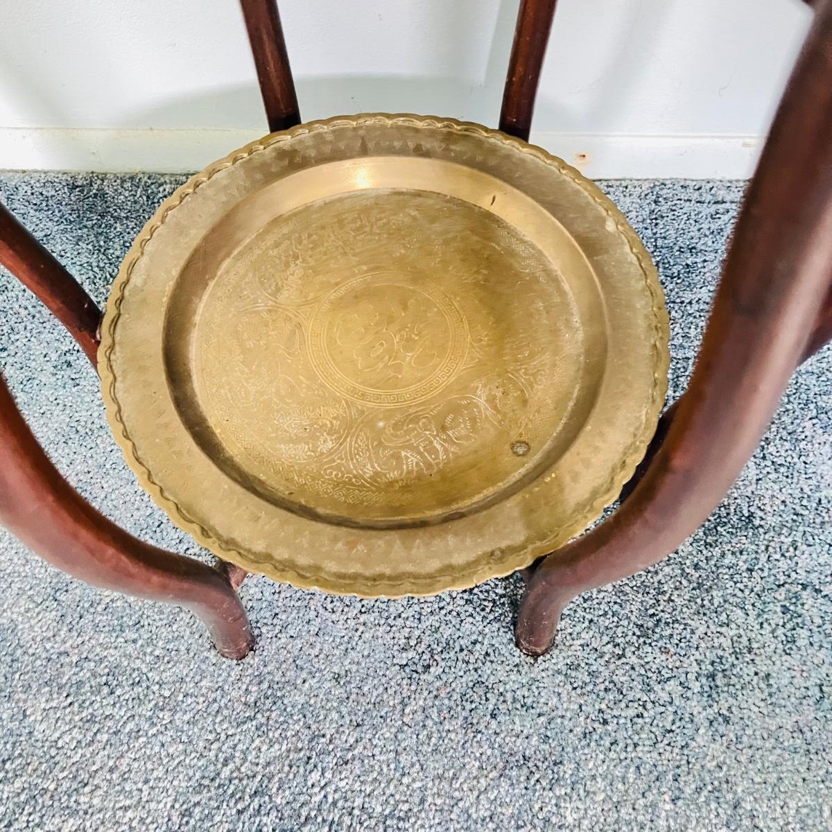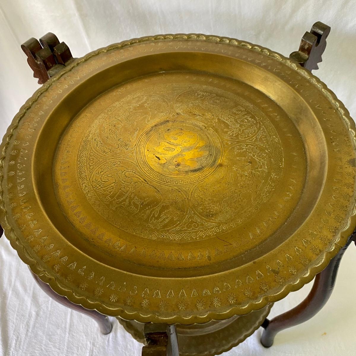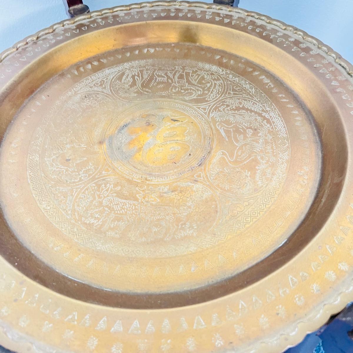 Vintage two tiered brass tray table with folding base. Asian decor, etched brass trays. Additional silver tray included. Large tray measure 16”D and smaller tray measures 14”D. Folding tray table measures 21”H. Good condition.