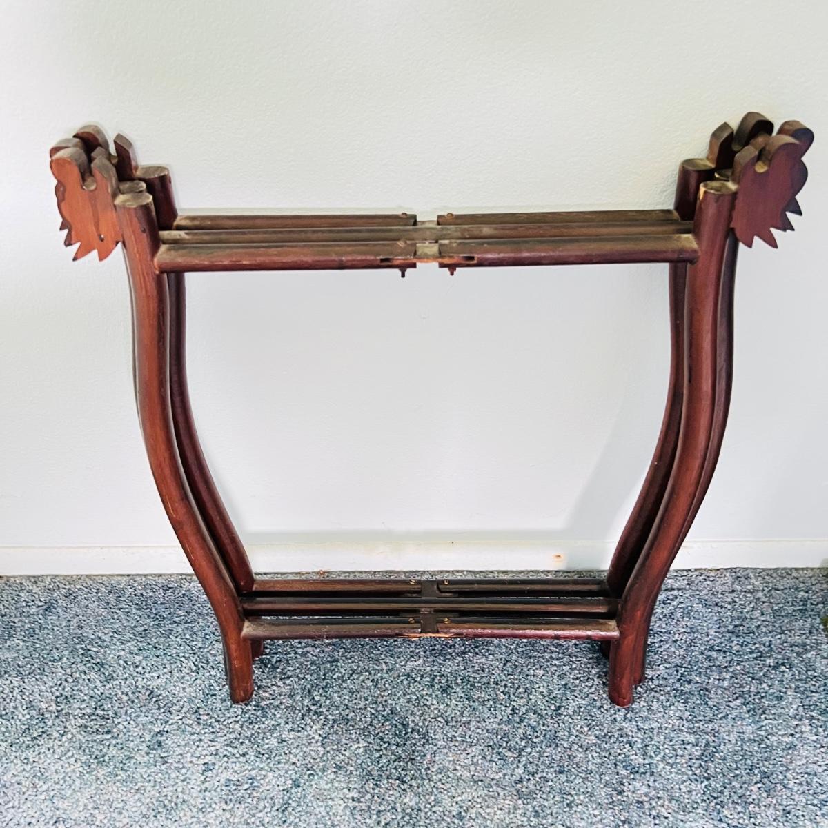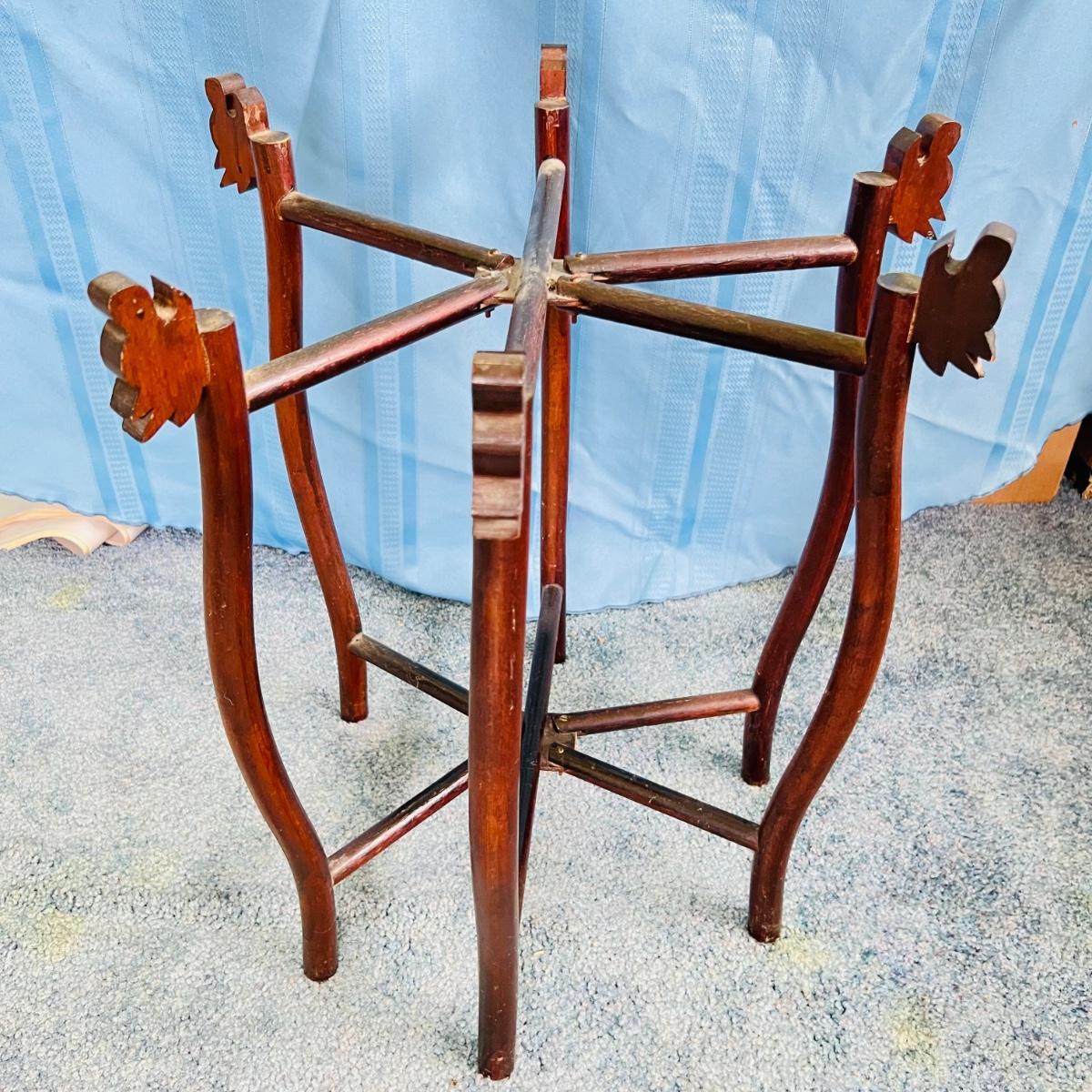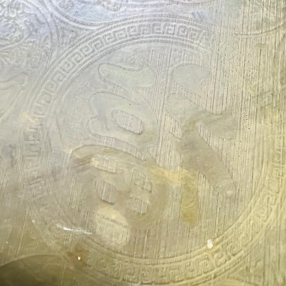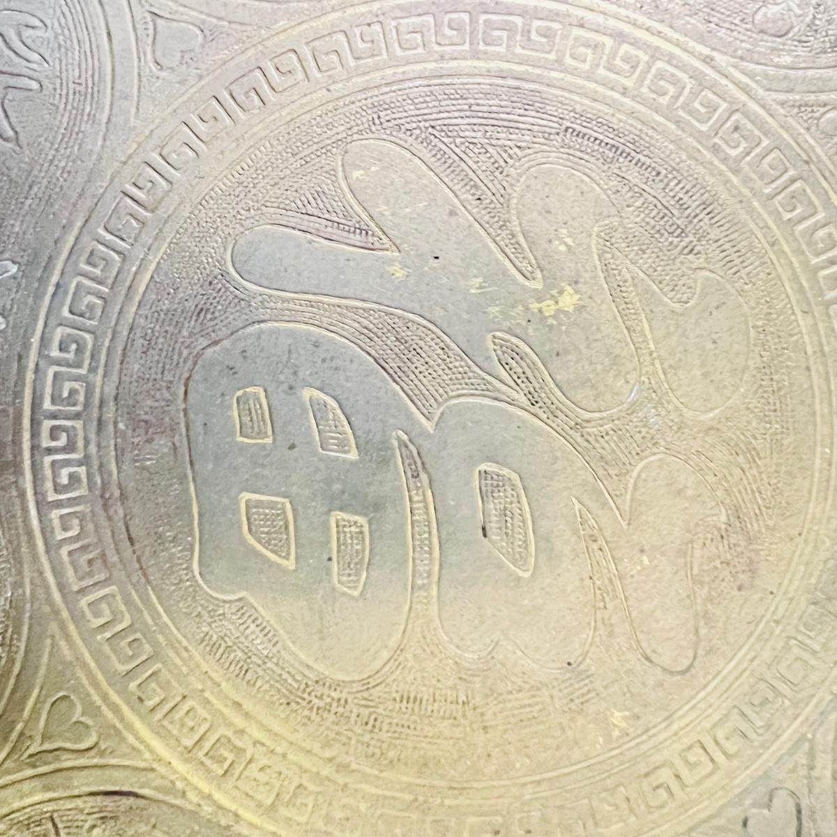 Vintage two tiered brass tray table with folding base. Asian decor, etched brass trays. Additional silver tray included. Large tray measure 16”D and smaller tray measures 14”D. Folding tray table measures 21”H. Good condition.