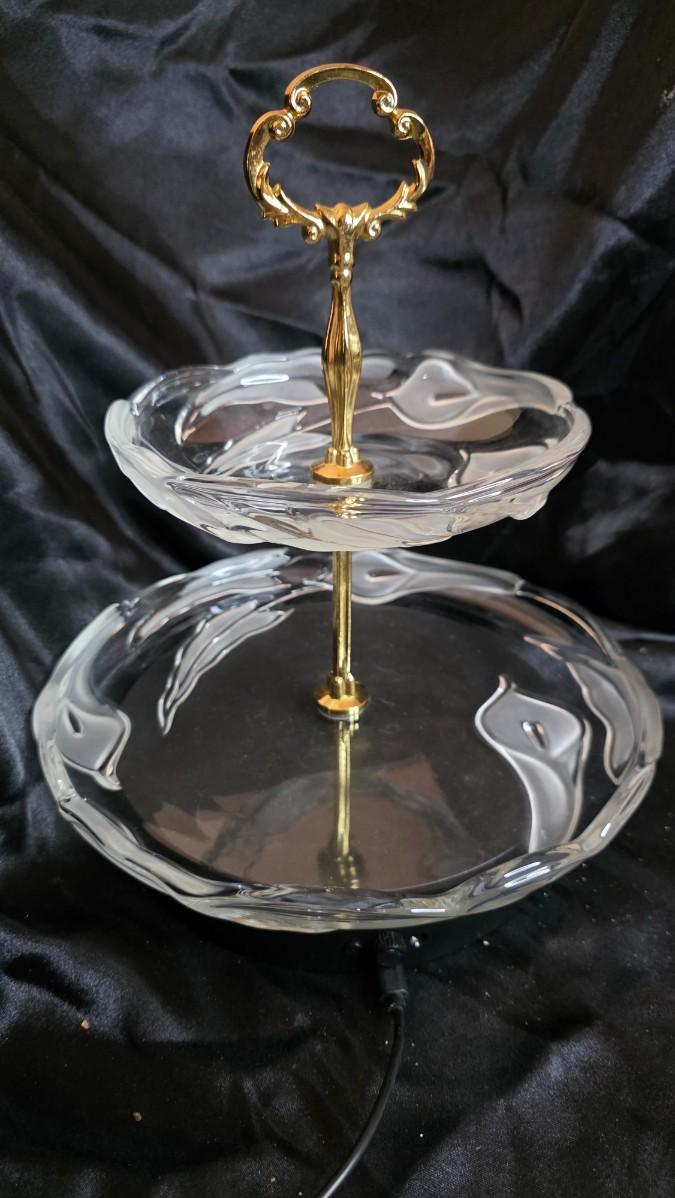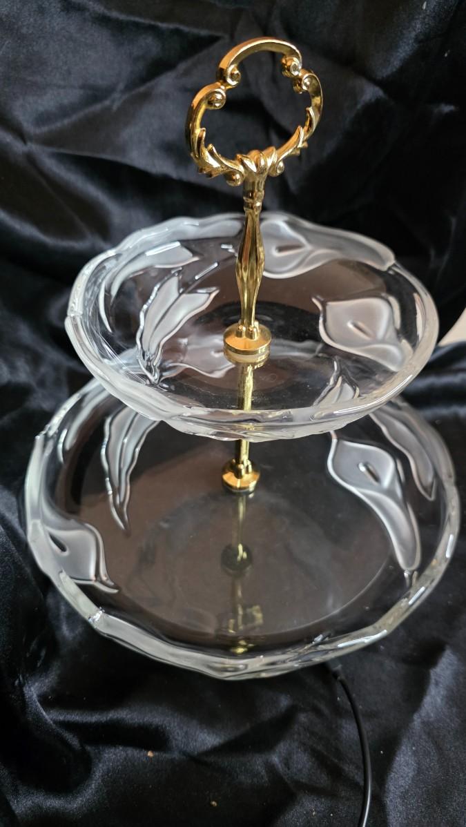 Buy early on our website at: https://treasuresofbako.com/products/vintage-two-tier-glass-serving-stand-with-ornate-gold-handle-elegant-entertaining-display?utm_source=copyToPasteBoard&utm_medium=product-links&utm_content=web