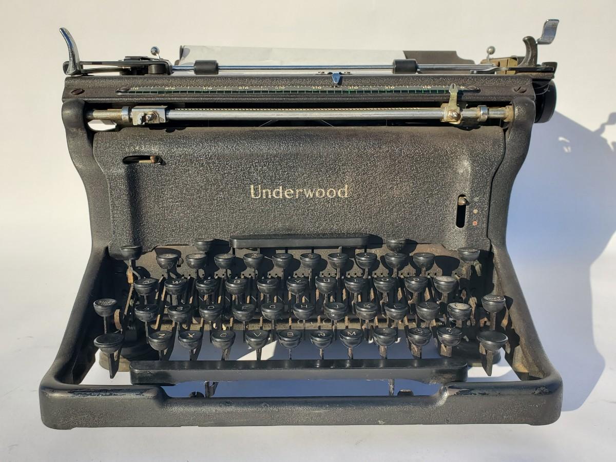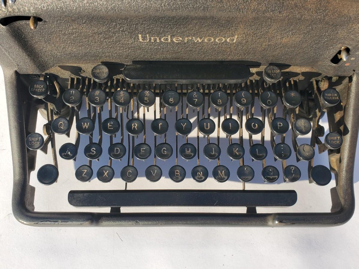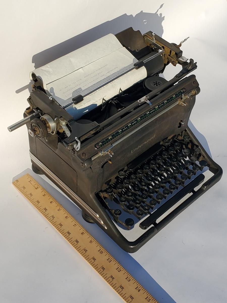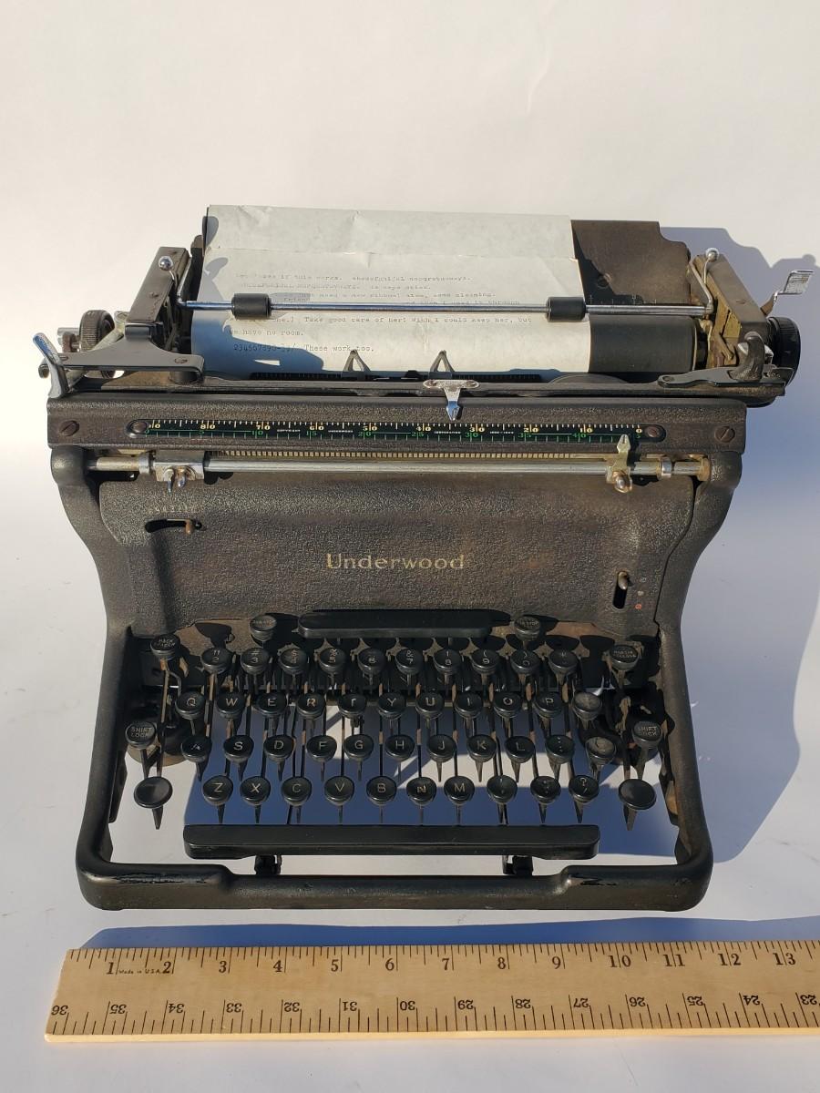 Underwood typewriter that still works (see close up image of the note in the typewriter); likely needs new ribbon. 12 inches wide by 12 inches deep. Made in the USA.
