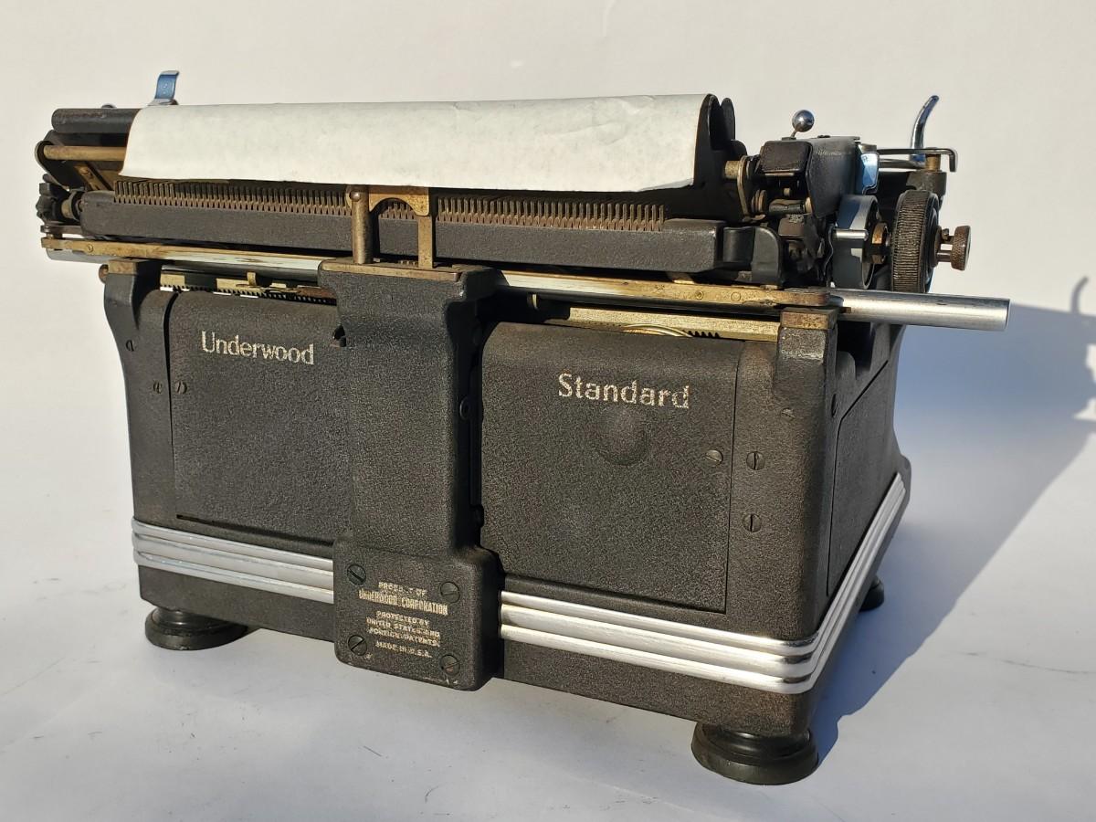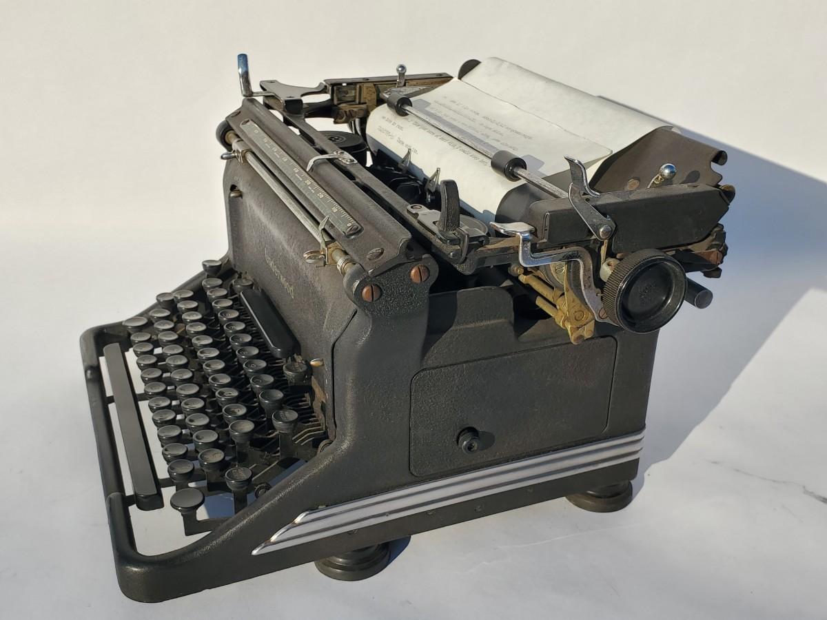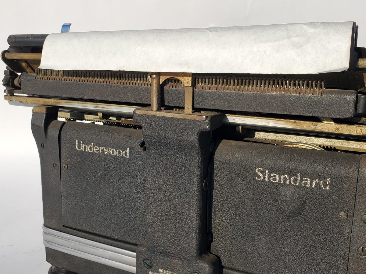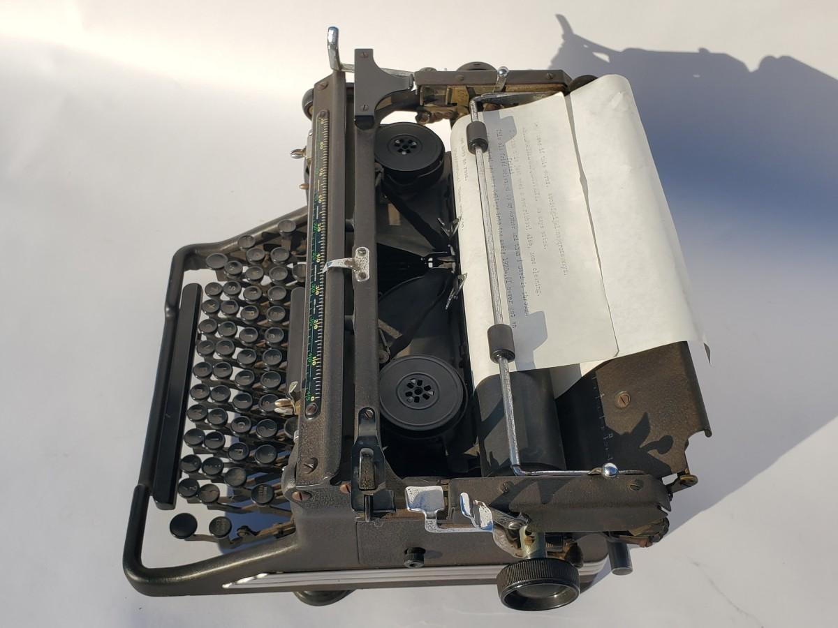 Underwood typewriter that still works (see close up image of the note in the typewriter); likely needs new ribbon. 12 inches wide by 12 inches deep. Made in the USA.