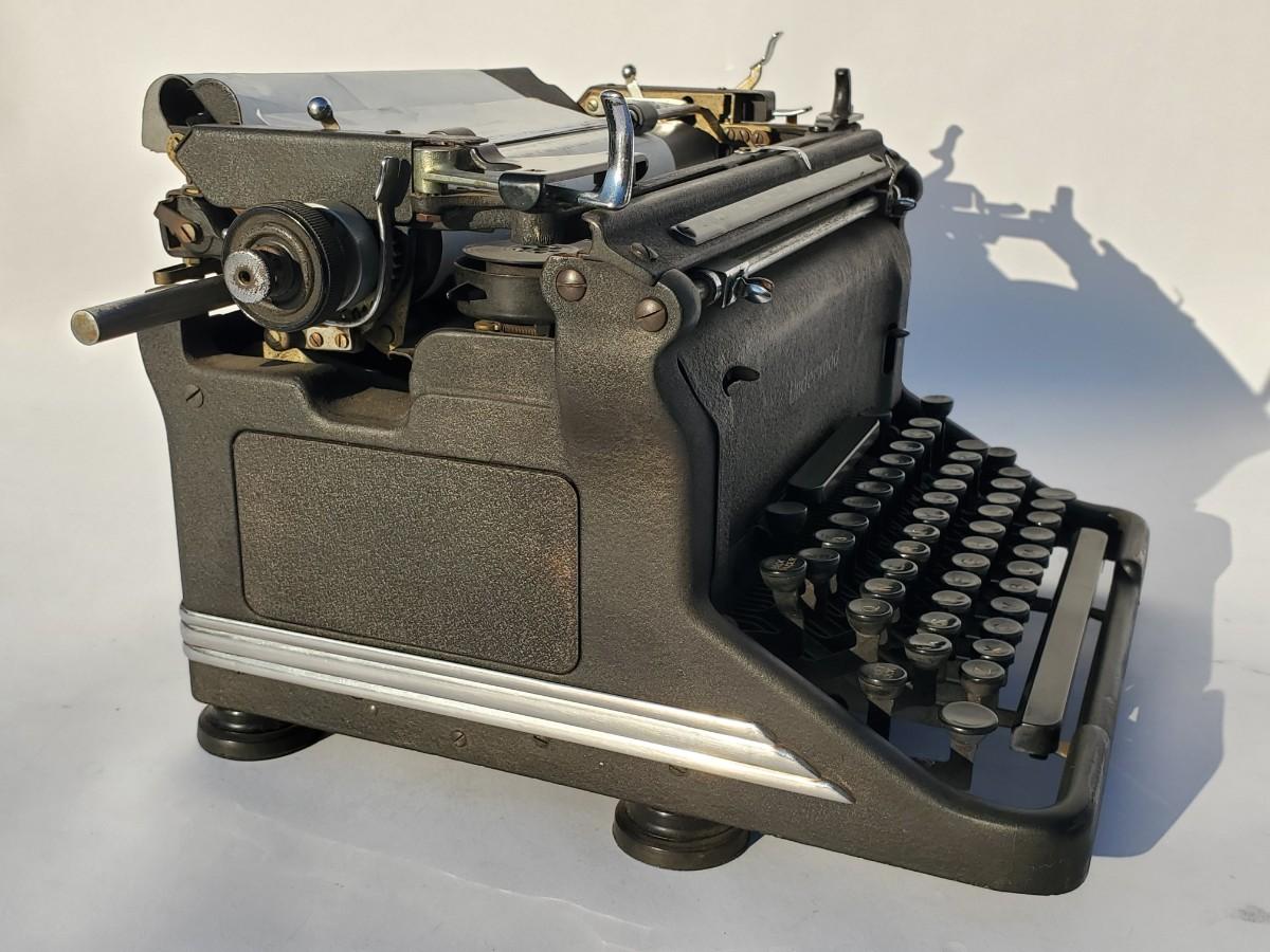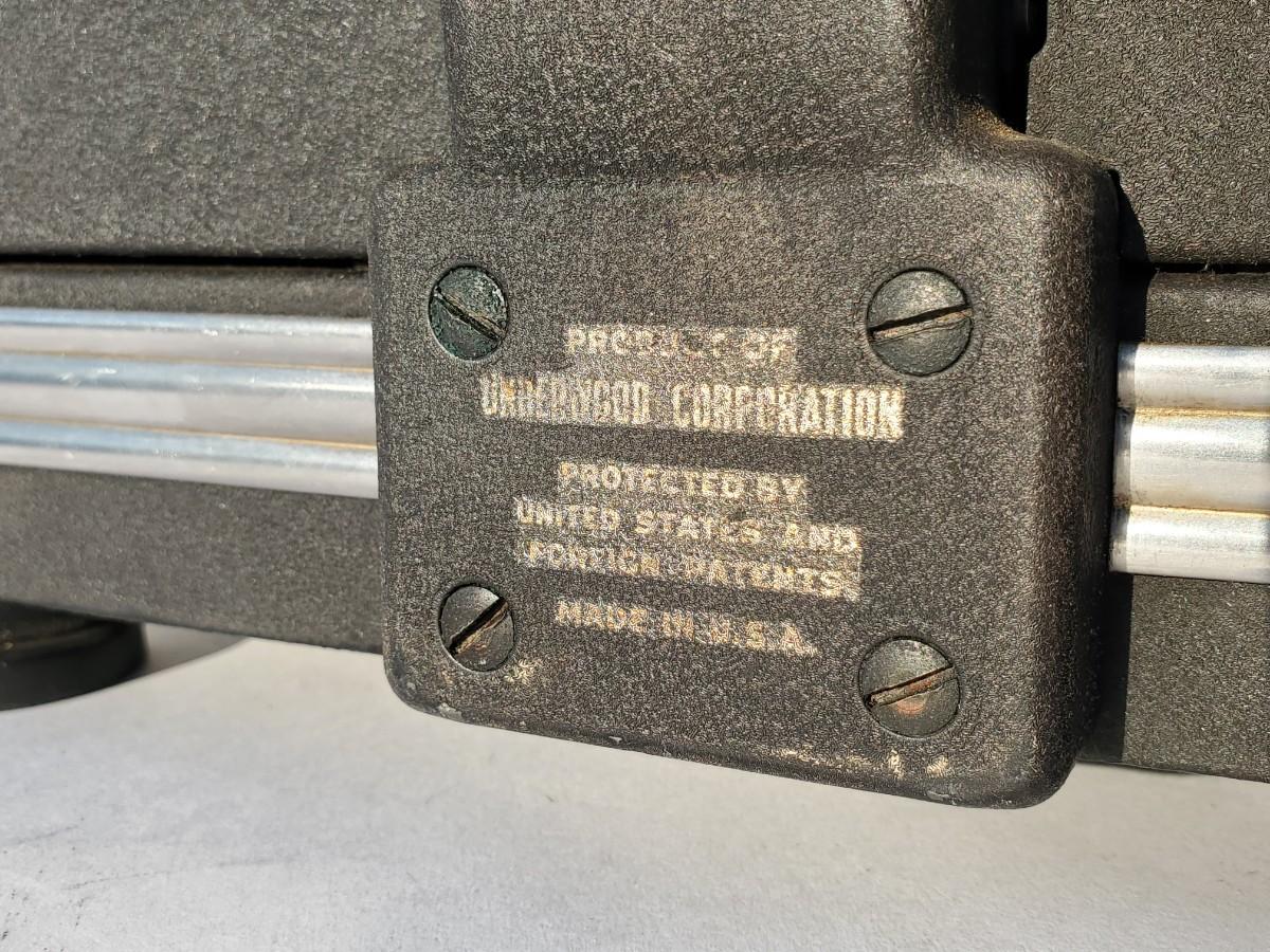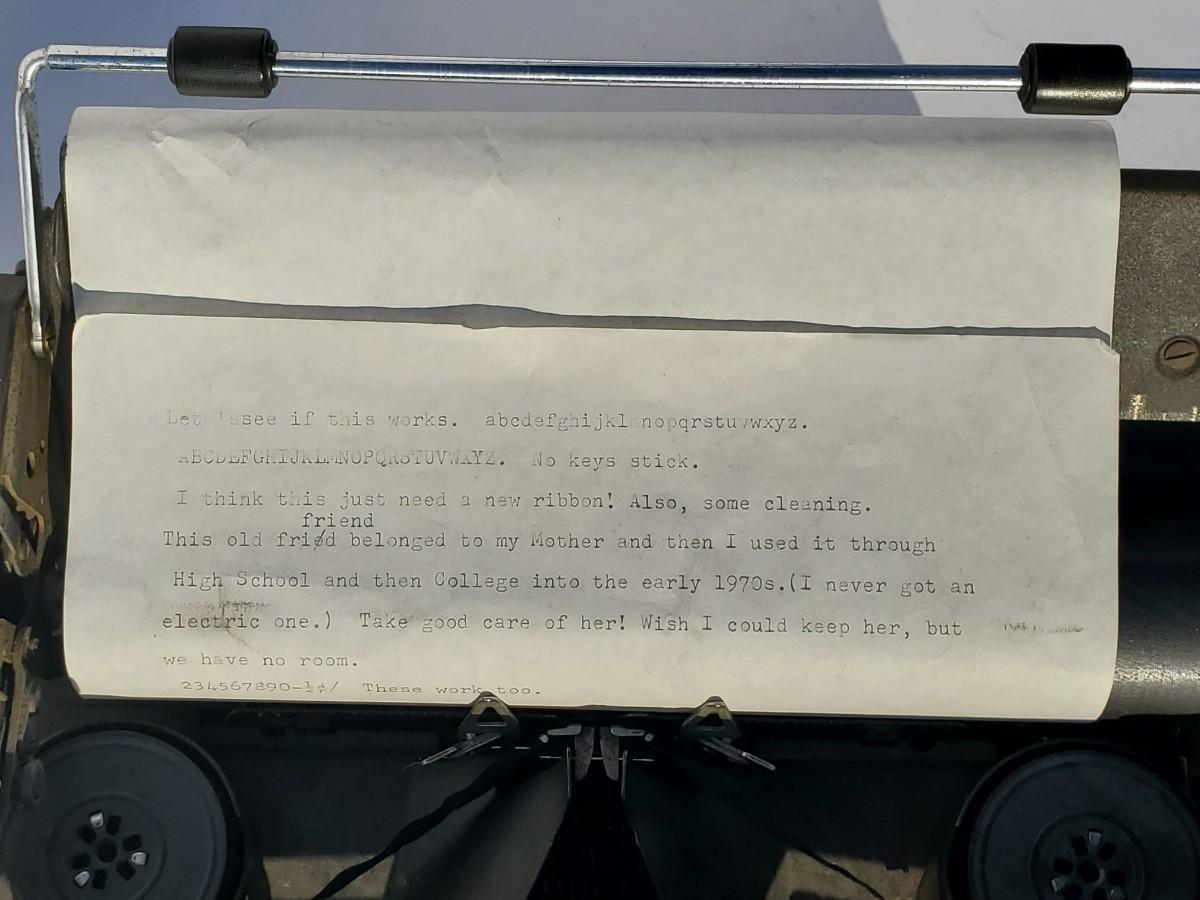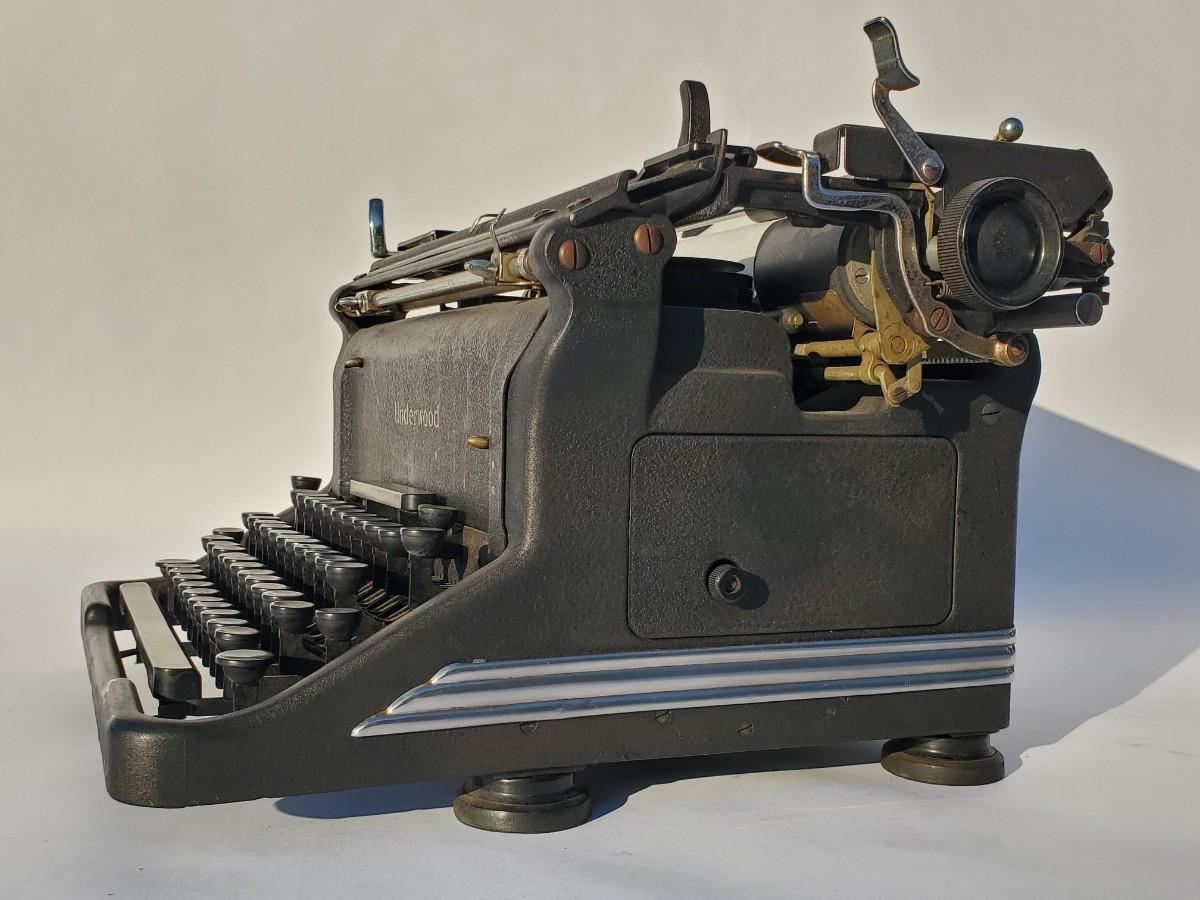 Underwood typewriter that still works (see close up image of the note in the typewriter); likely needs new ribbon. 12 inches wide by 12 inches deep. Made in the USA.