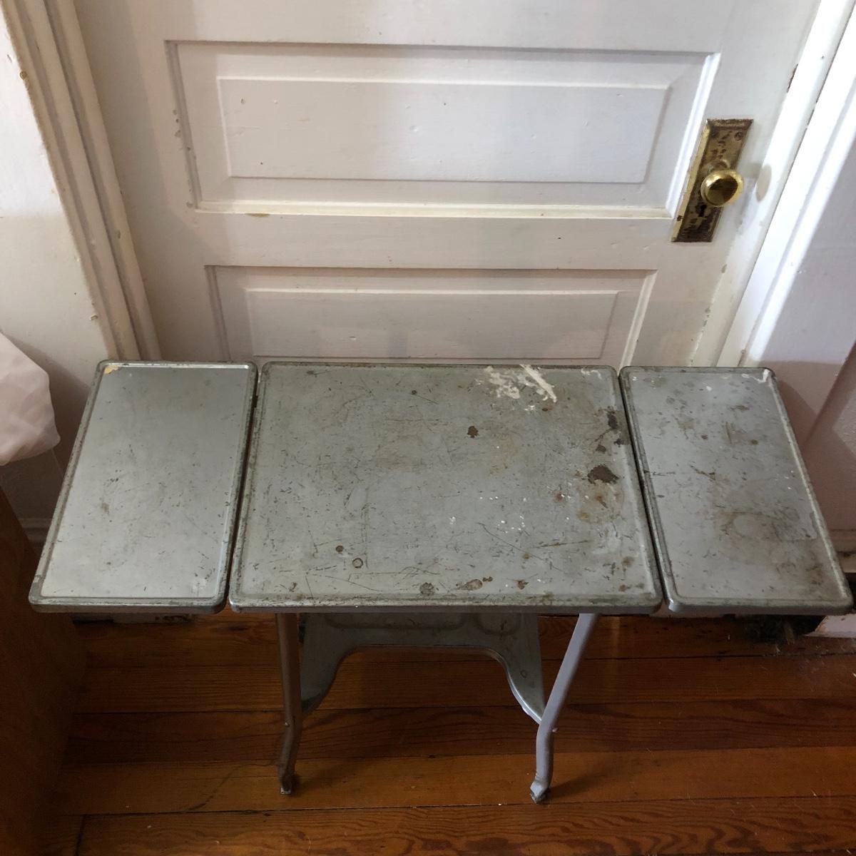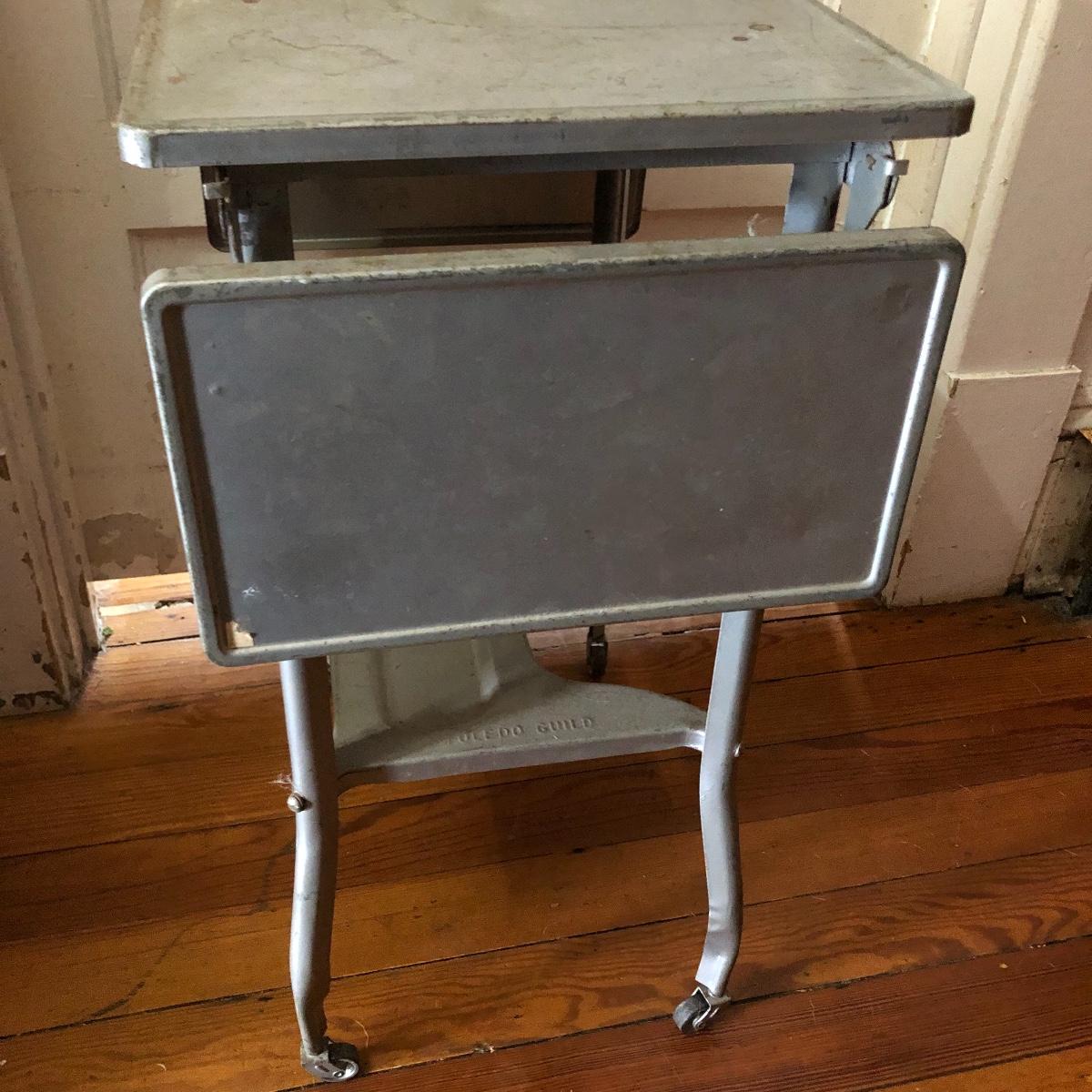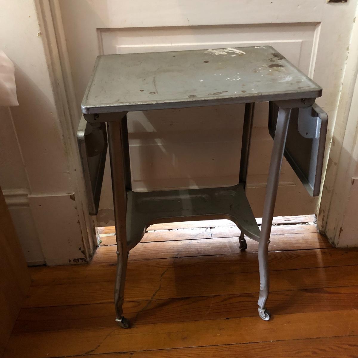 Lot includes vintage metal drop leaf typewriter table on wheels with a shelf underneath. Table has scratches and small spots of rust, see pictures. Table measures 14” x 34” x 26” when open and 14” x 19.75” x 26” when leaves are dropped