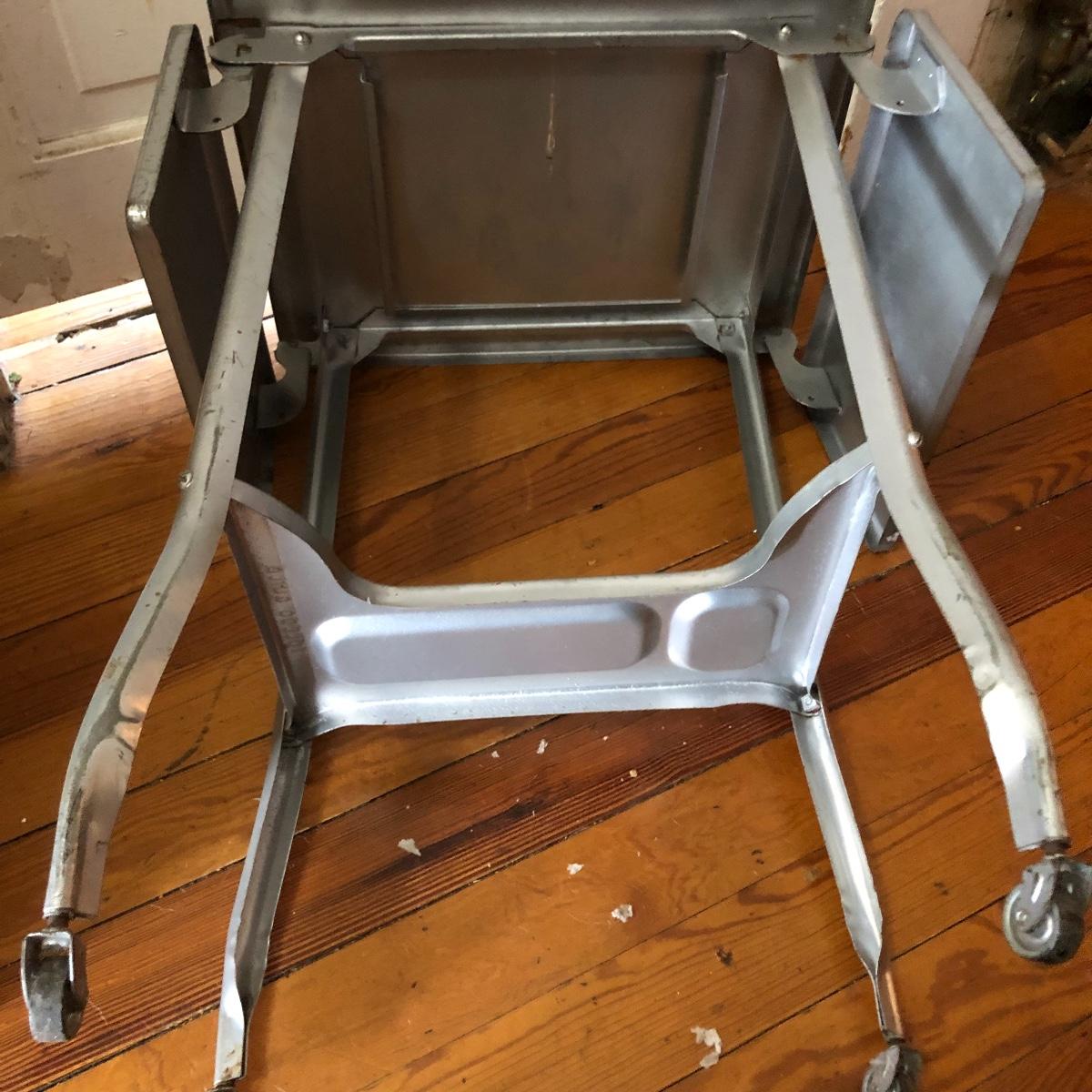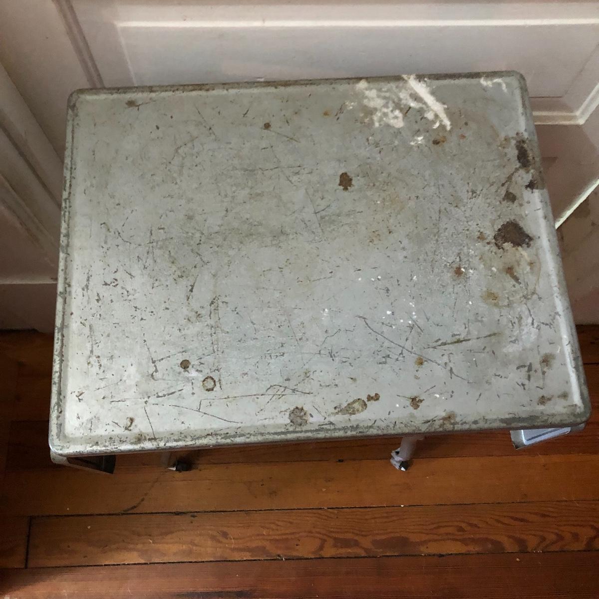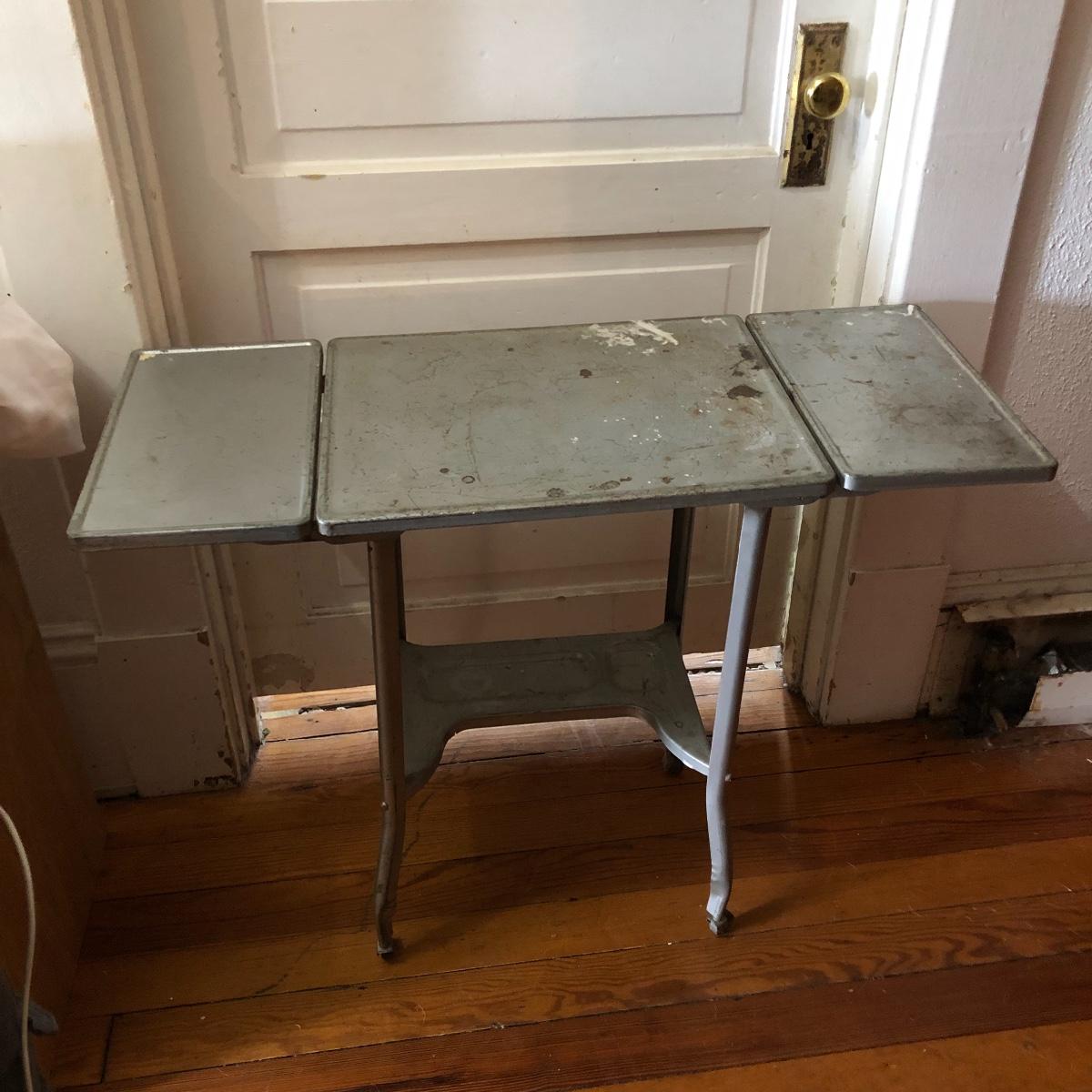 Lot includes vintage metal drop leaf typewriter table on wheels with a shelf underneath. Table has scratches and small spots of rust, see pictures. Table measures 14” x 34” x 26” when open and 14” x 19.75” x 26” when leaves are dropped
