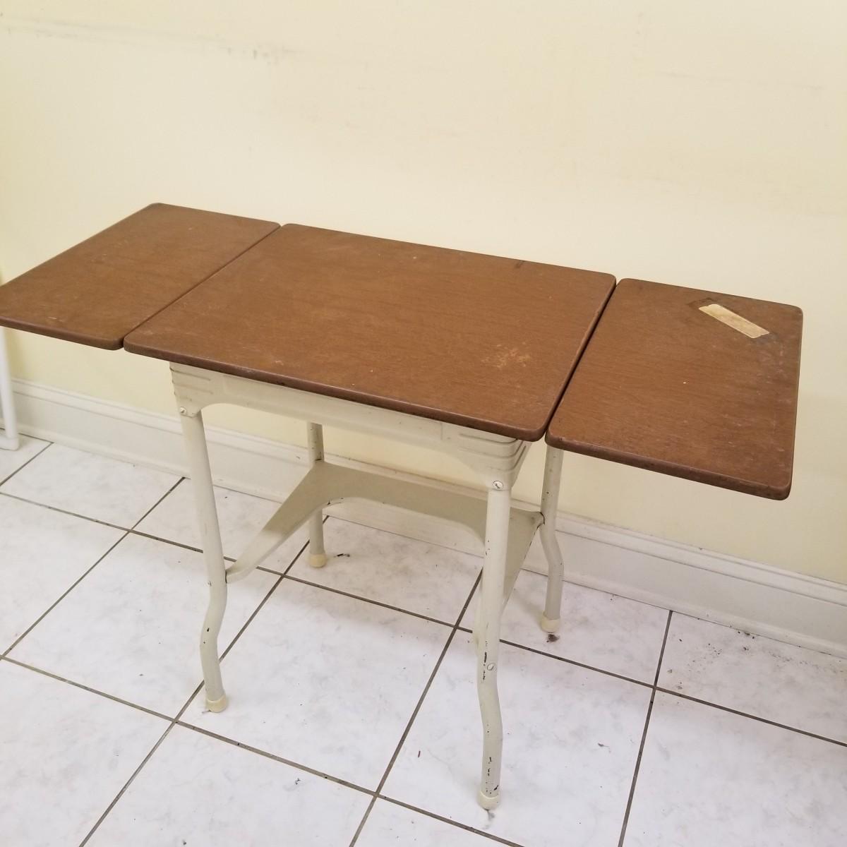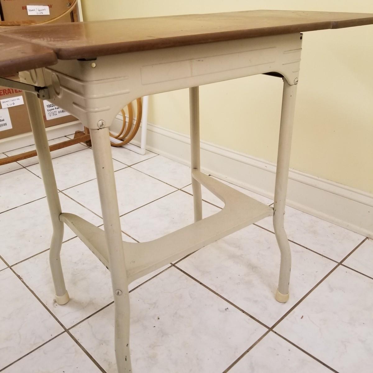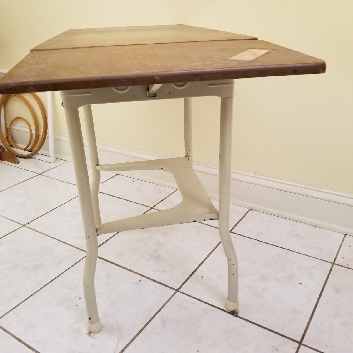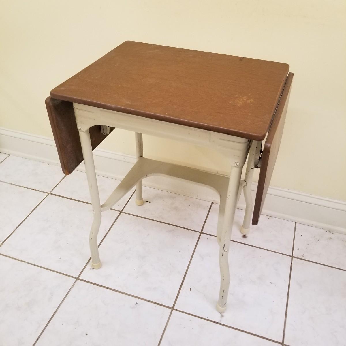 A metal leg/wood top vintage style typing table. Top and sides in fair shape, one extension arm is broken but functional. Measures 21"x15.5"x25.5" closed, 37.5" open. See photos for details. Local pickup only.