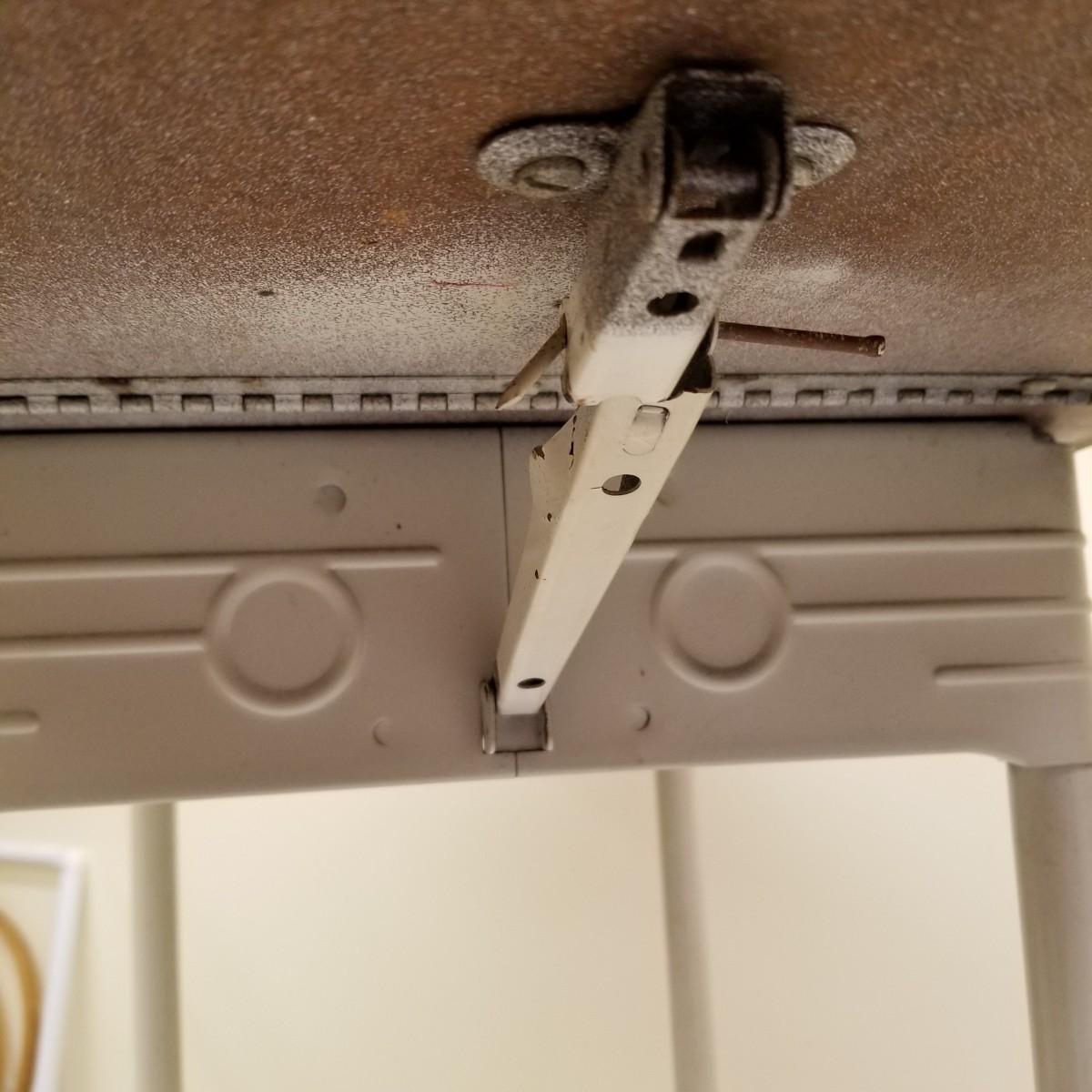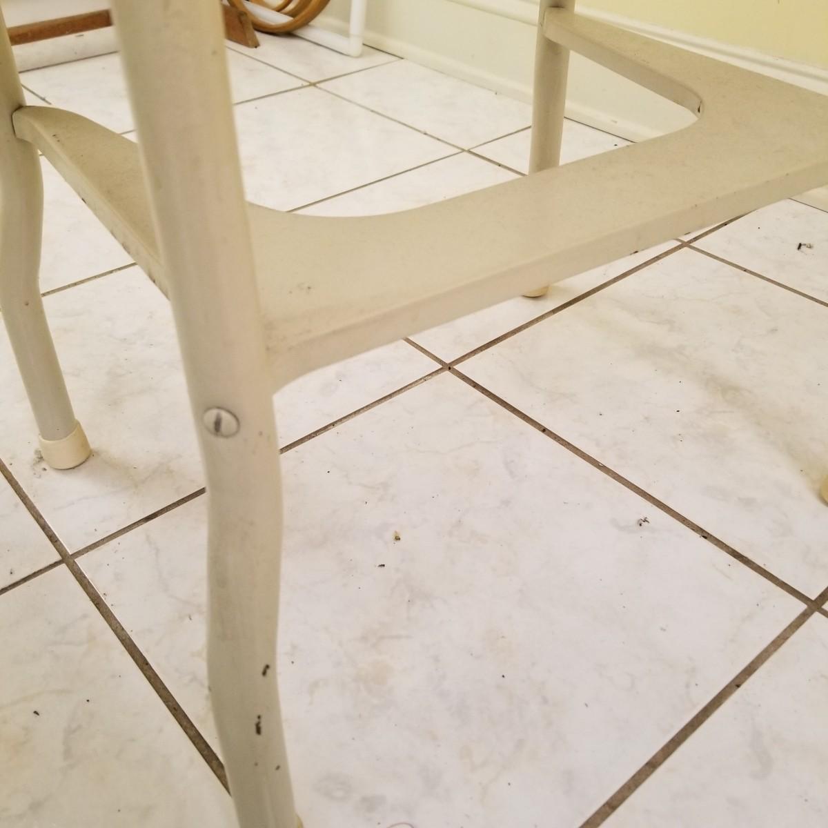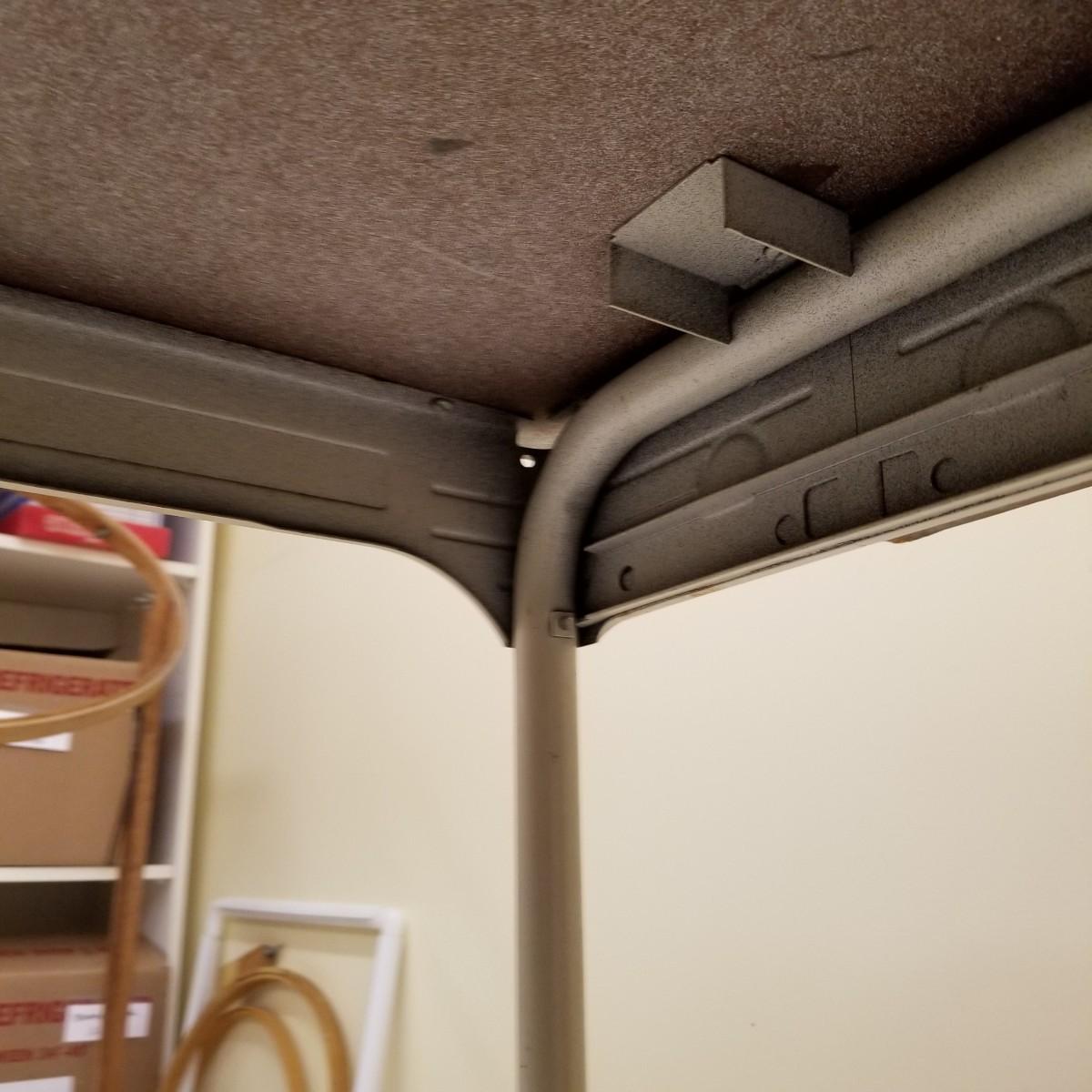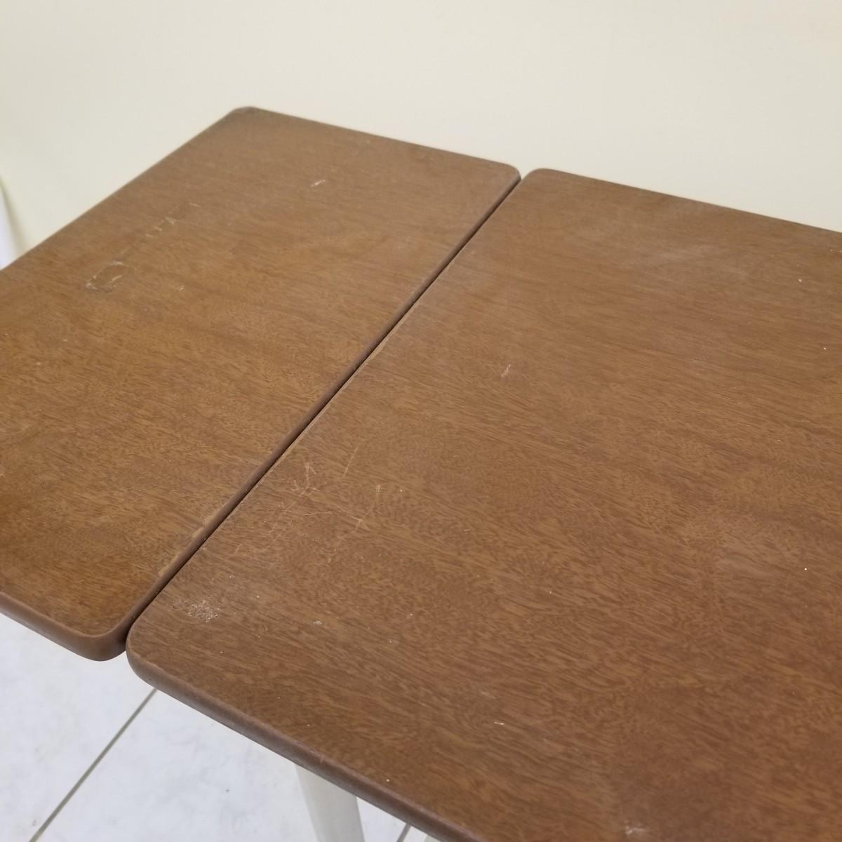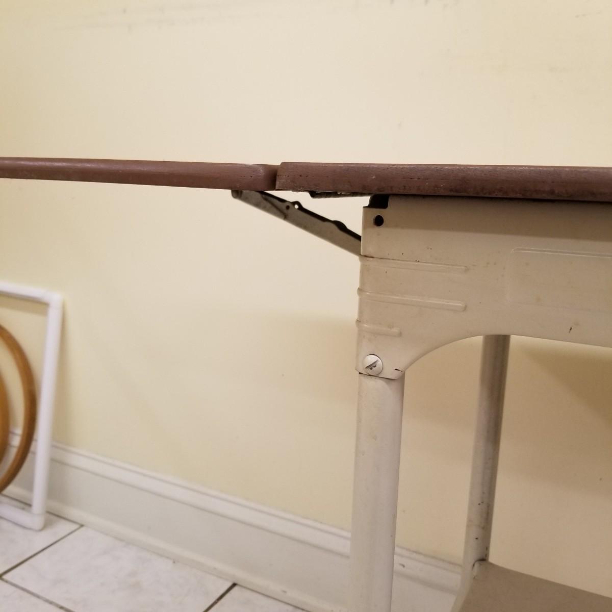 A metal leg/wood top vintage style typing table. Top and sides in fair shape, one extension arm is broken but functional. Measures 21"x15.5"x25.5" closed, 37.5" open. See photos for details. Local pickup only.