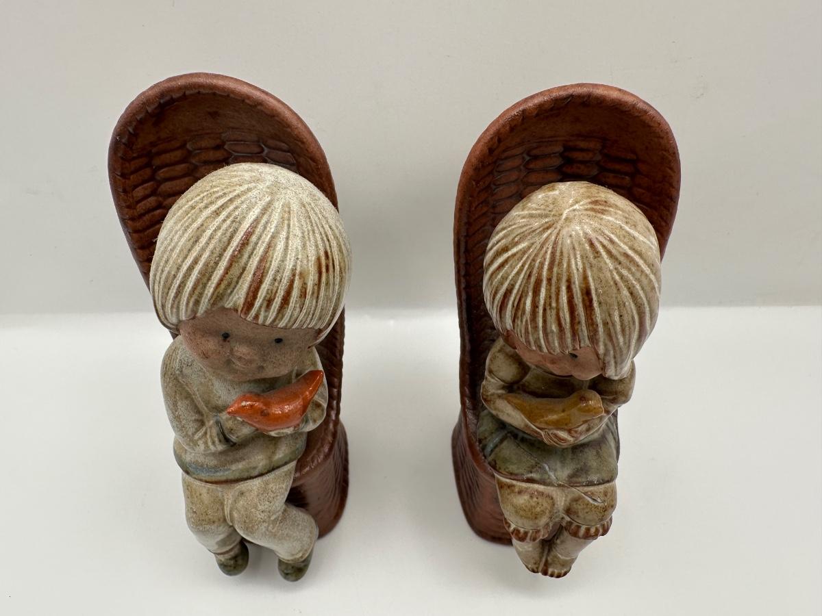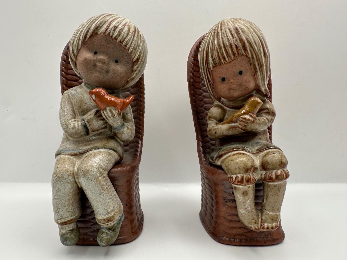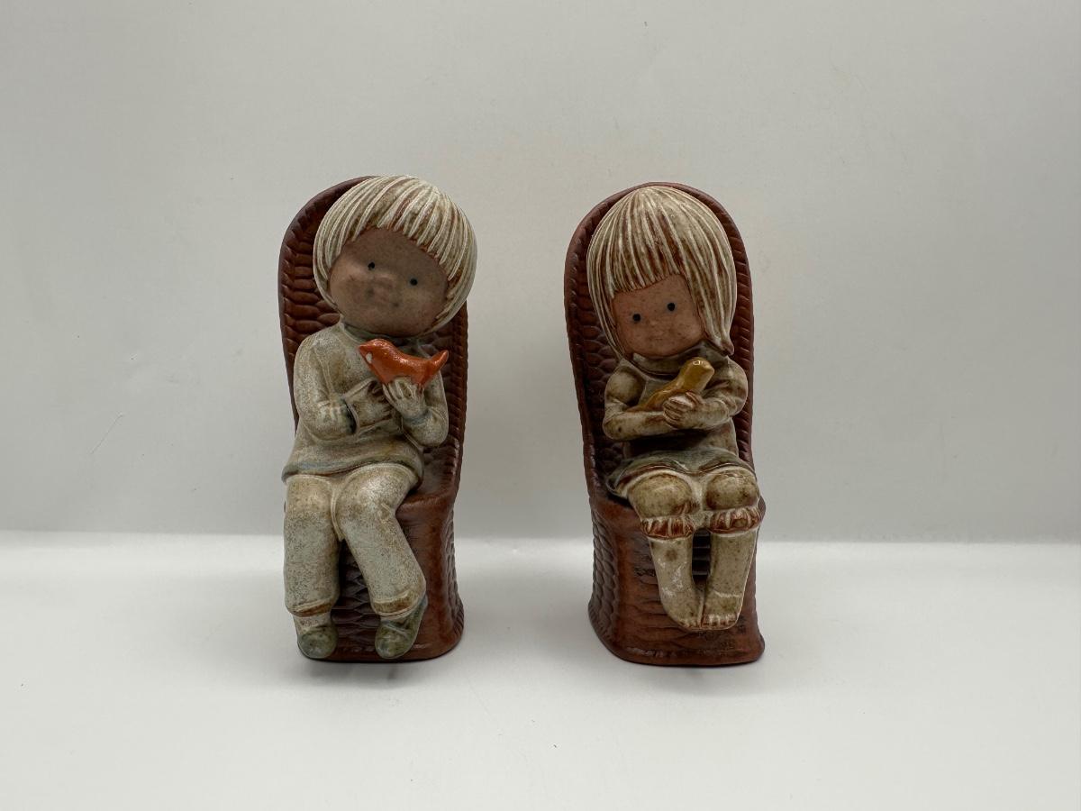 Vintage UCTCI Ceramic Hand Painted Young Boy and Girl Figurine Sitting on Wicker Woven Chair Holding Birds in Their Hands, JAPAN