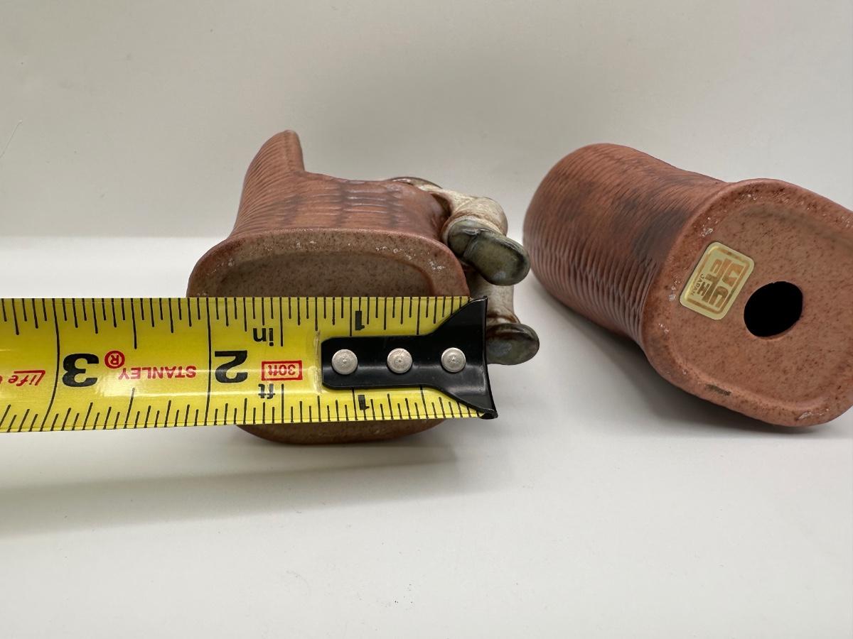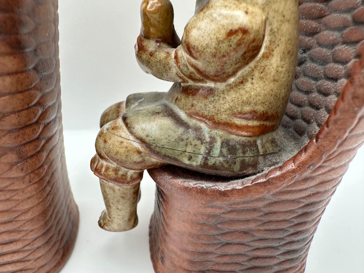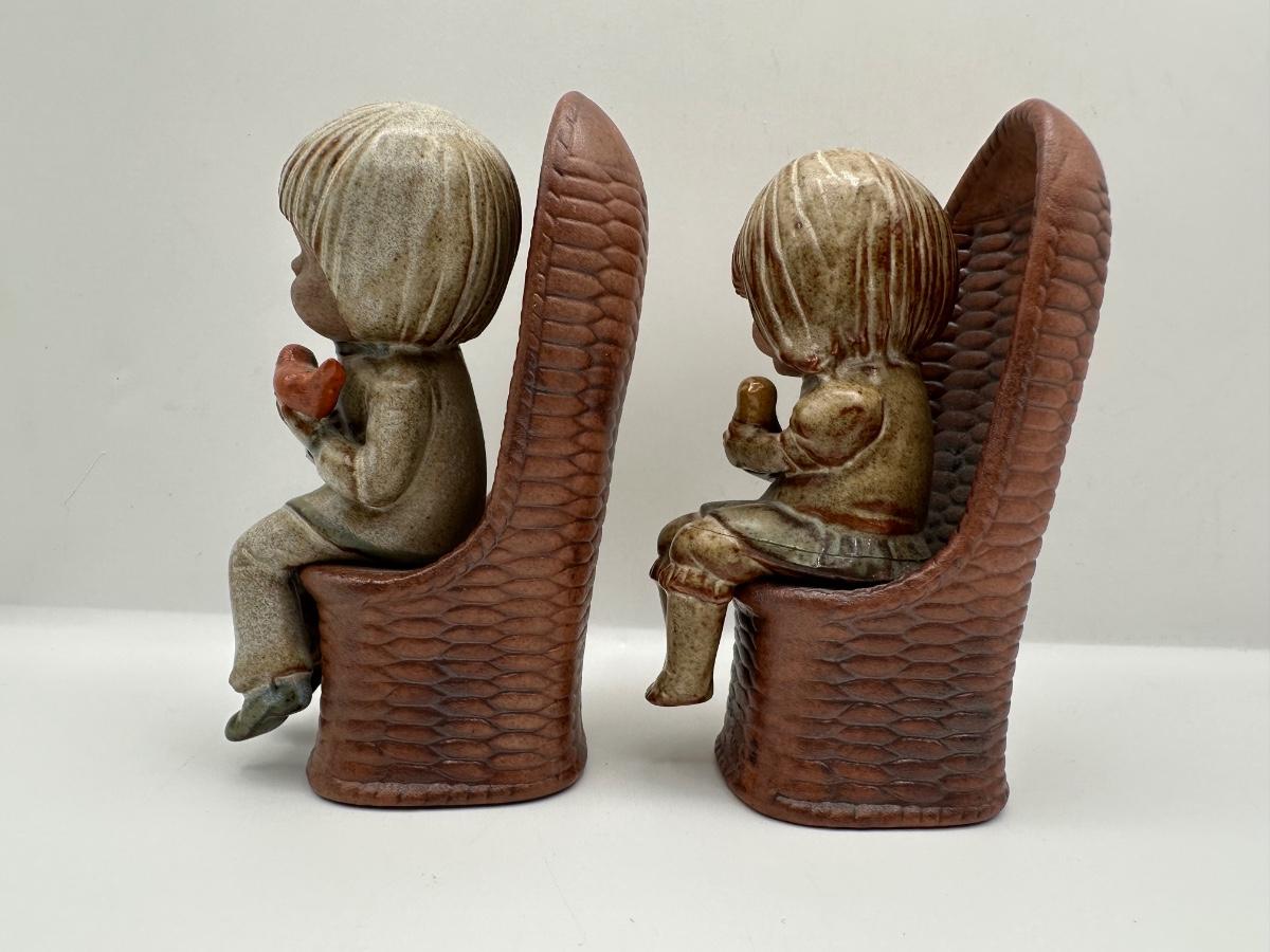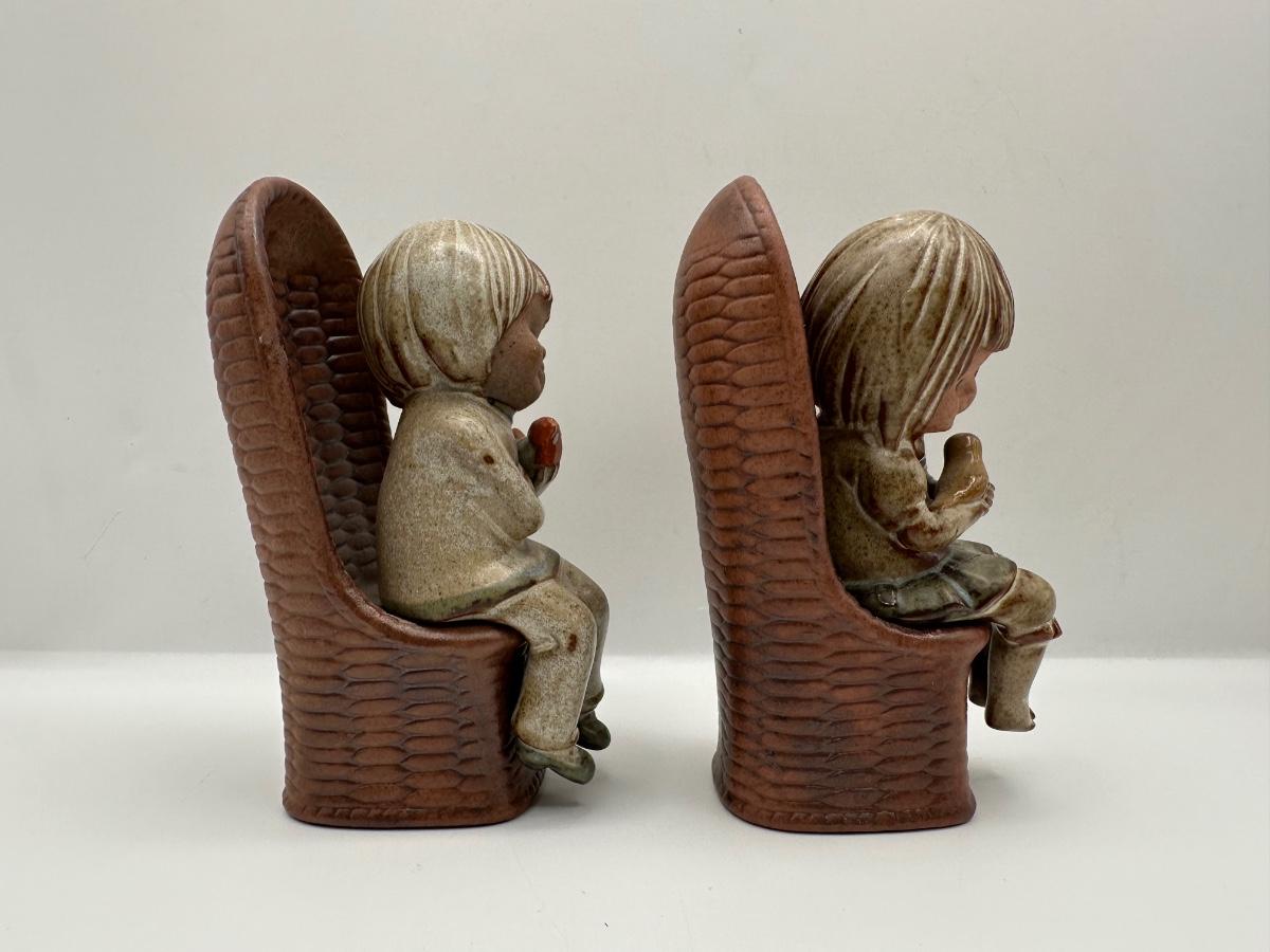 Vintage UCTCI Ceramic Hand Painted Young Boy and Girl Figurine Sitting on Wicker Woven Chair Holding Birds in Their Hands, JAPAN