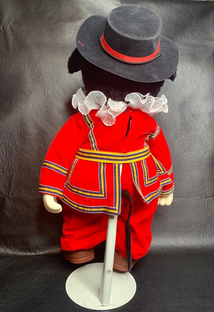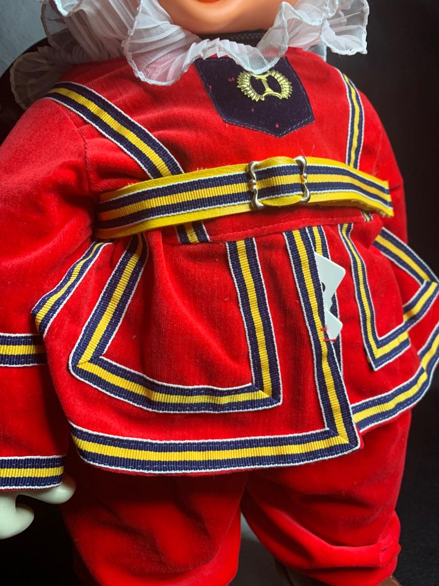 Had to do some research and I believe this uniform is called Yeomen warders uniform. This is a red uniform with ribbons of gold and blue strips trim. White ruffle collar.black top hat with red ribbon. His chest has an emblem on the front and brown shoes.