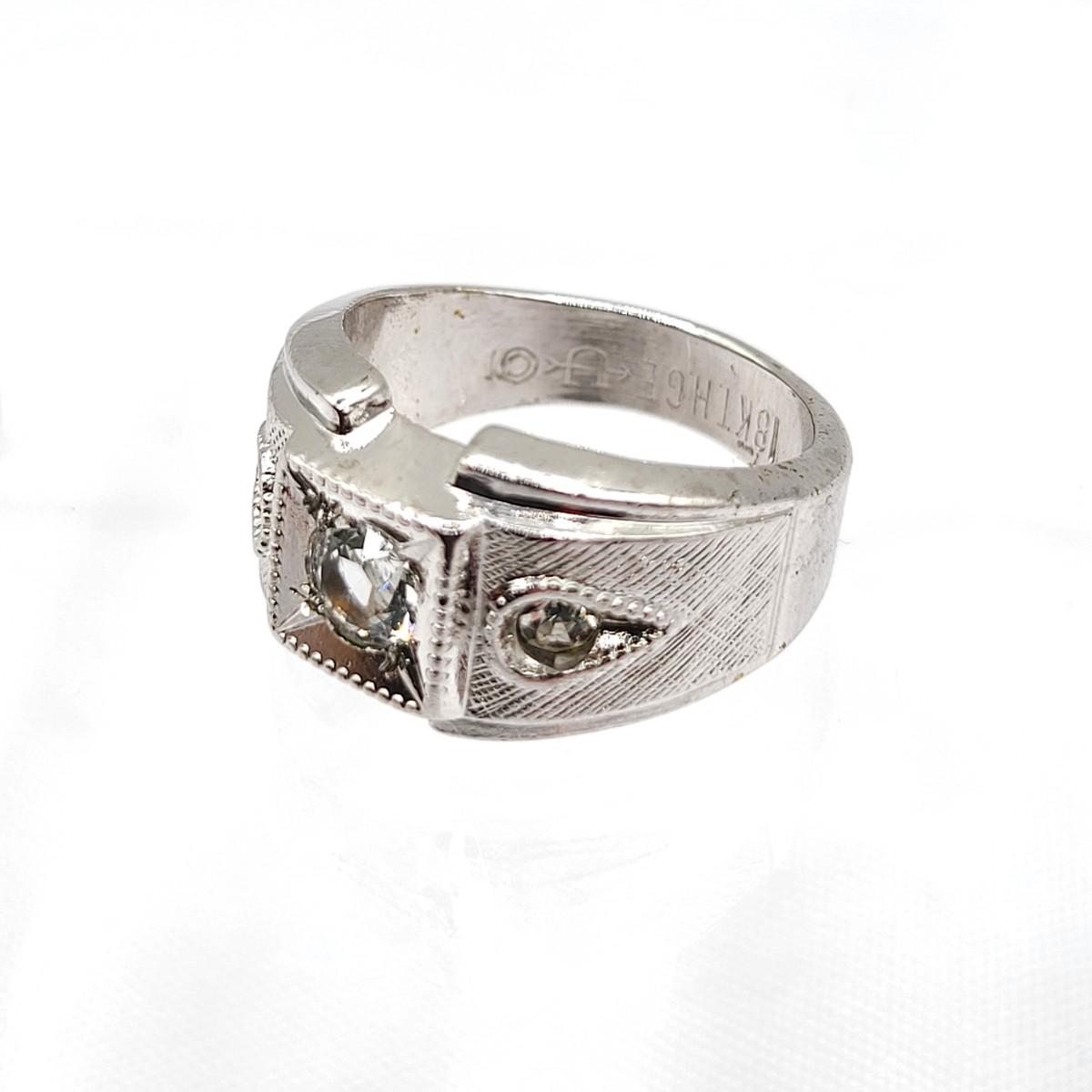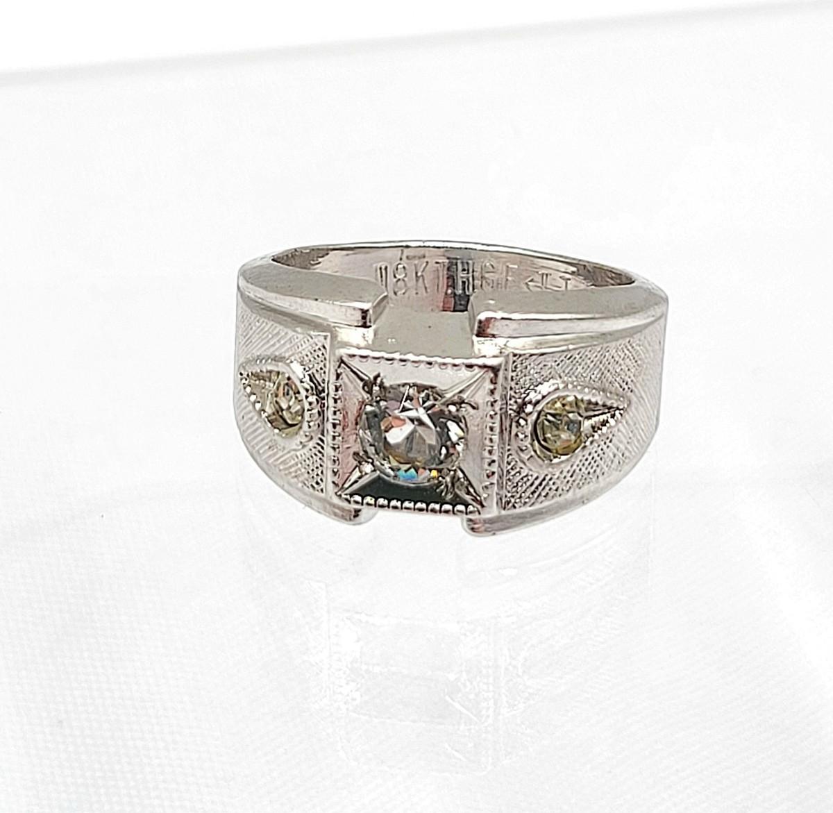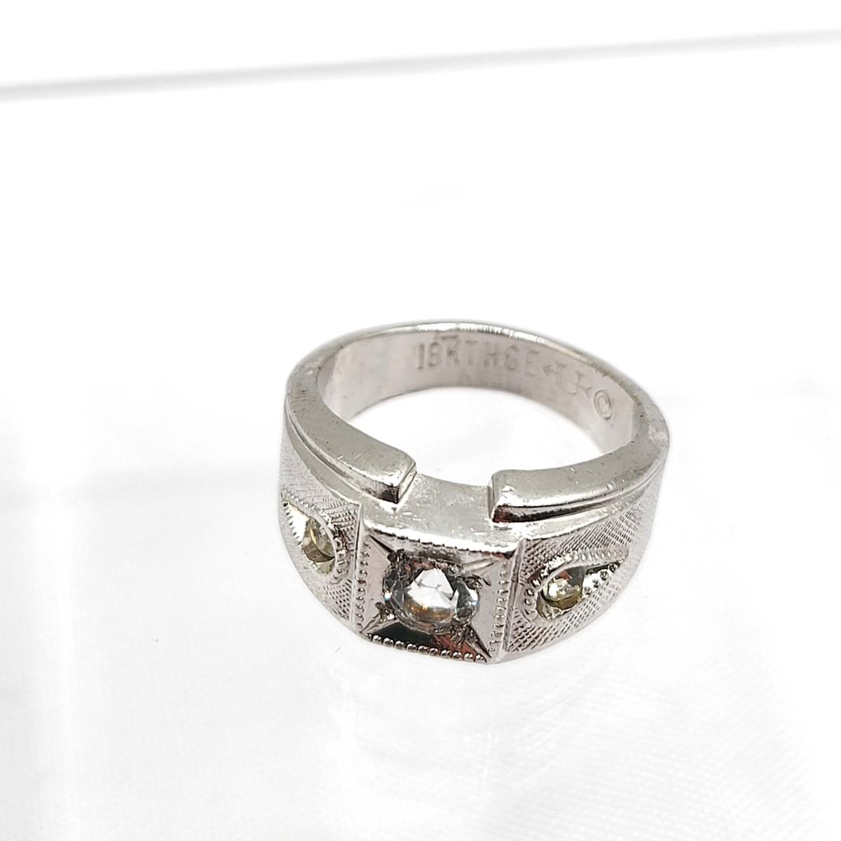 Vintage Uncas 18 KGEP ring, size 5. Clear sparkly center round cut faceted stone accented by two round cut side stones.
