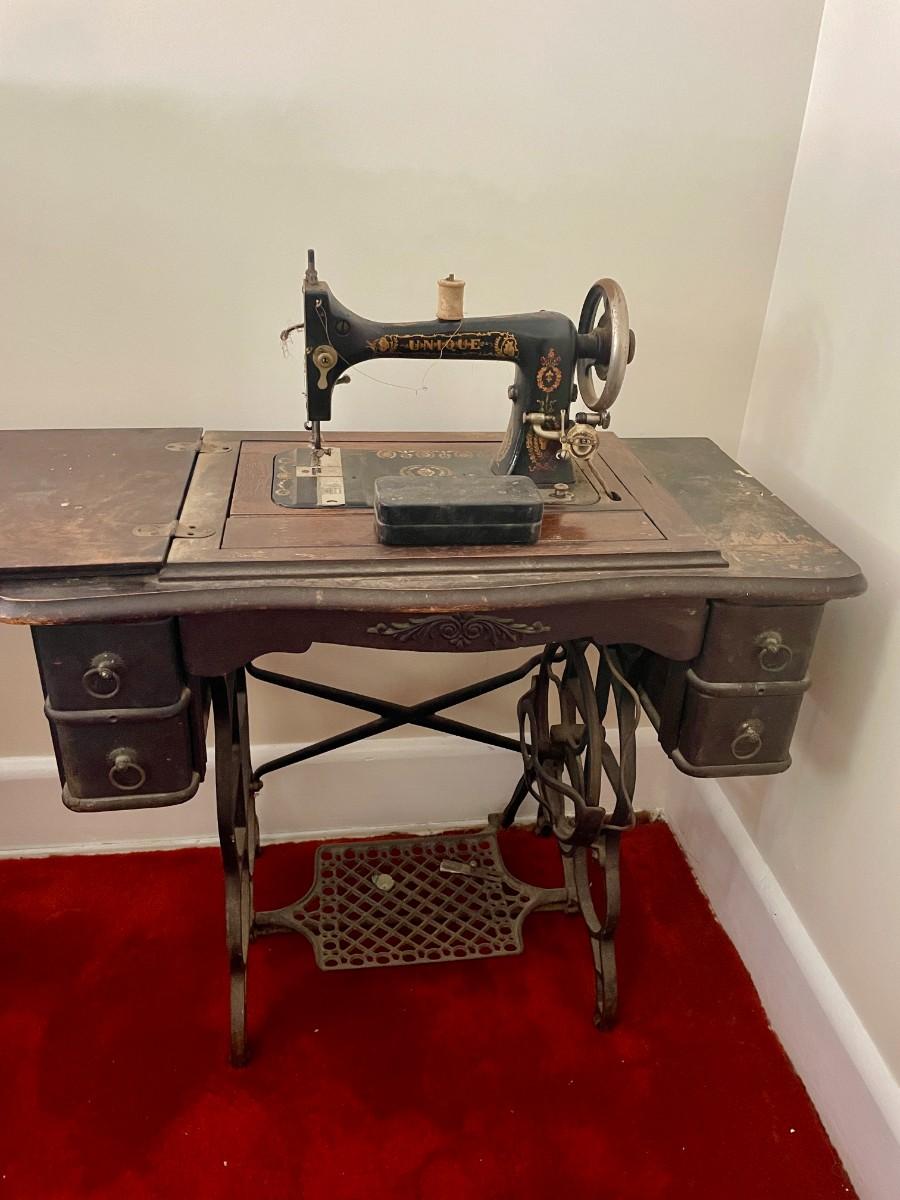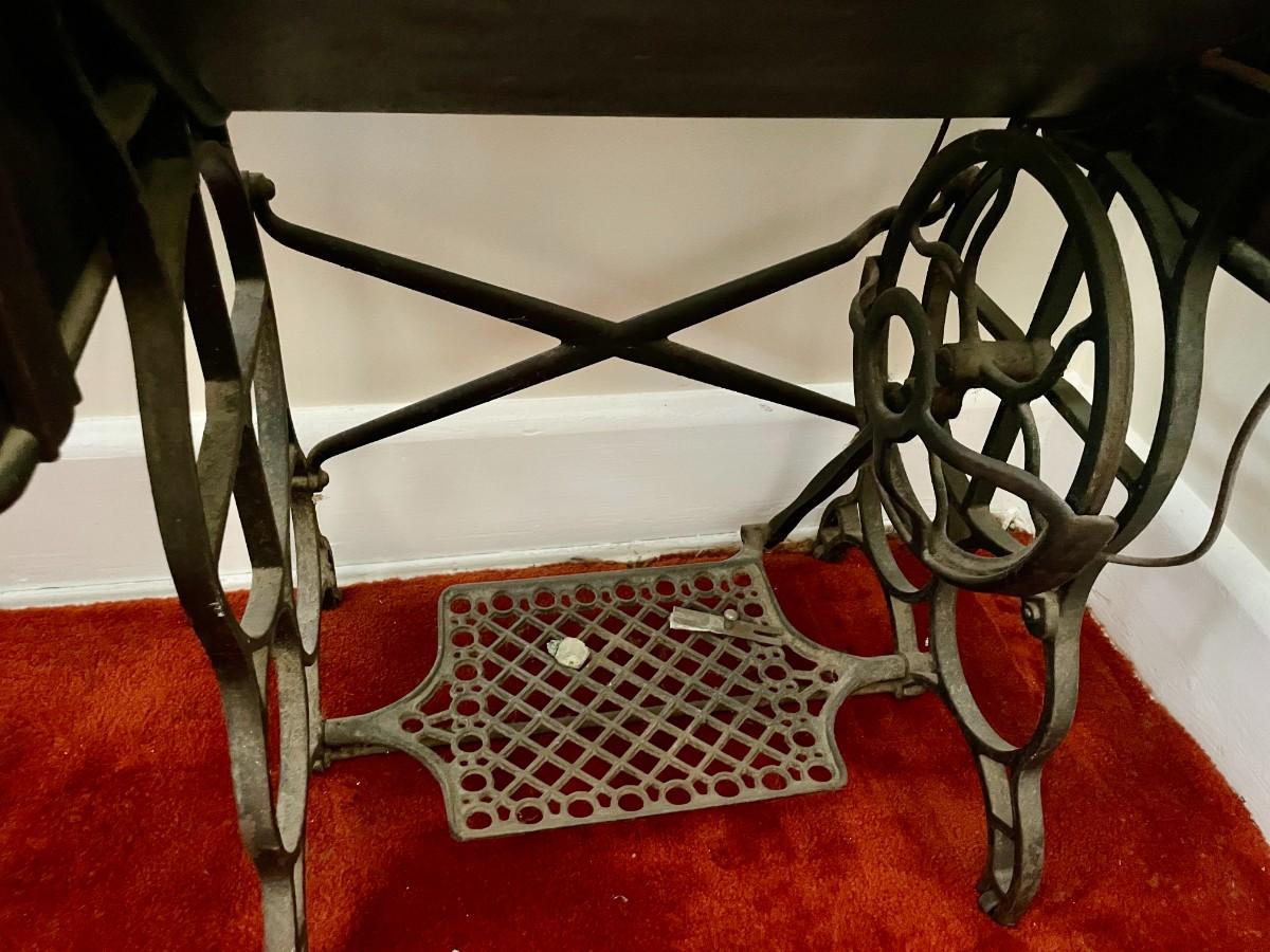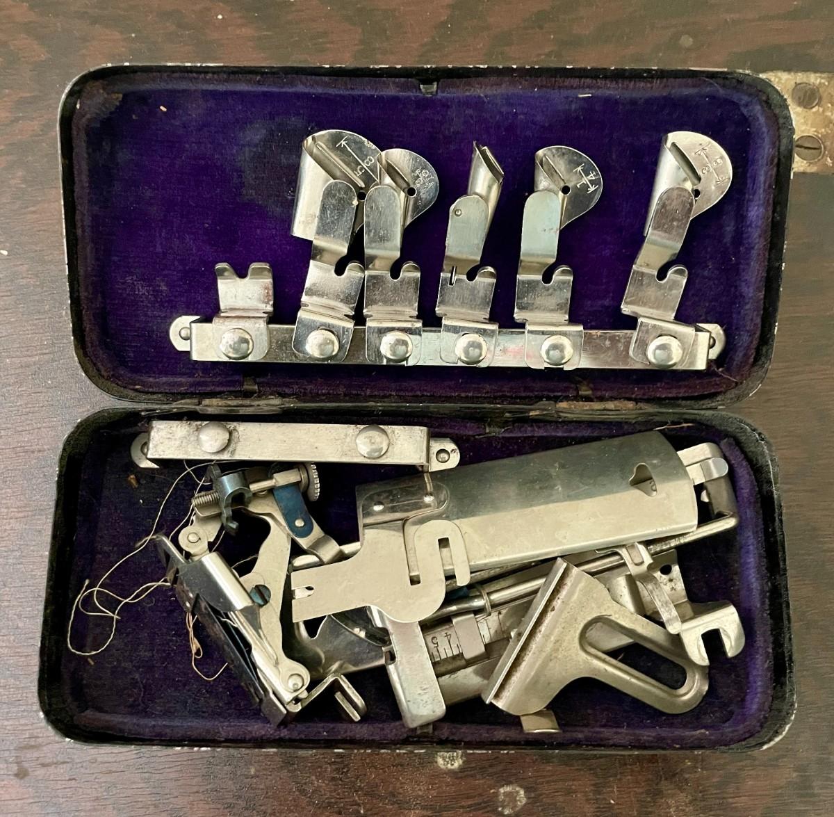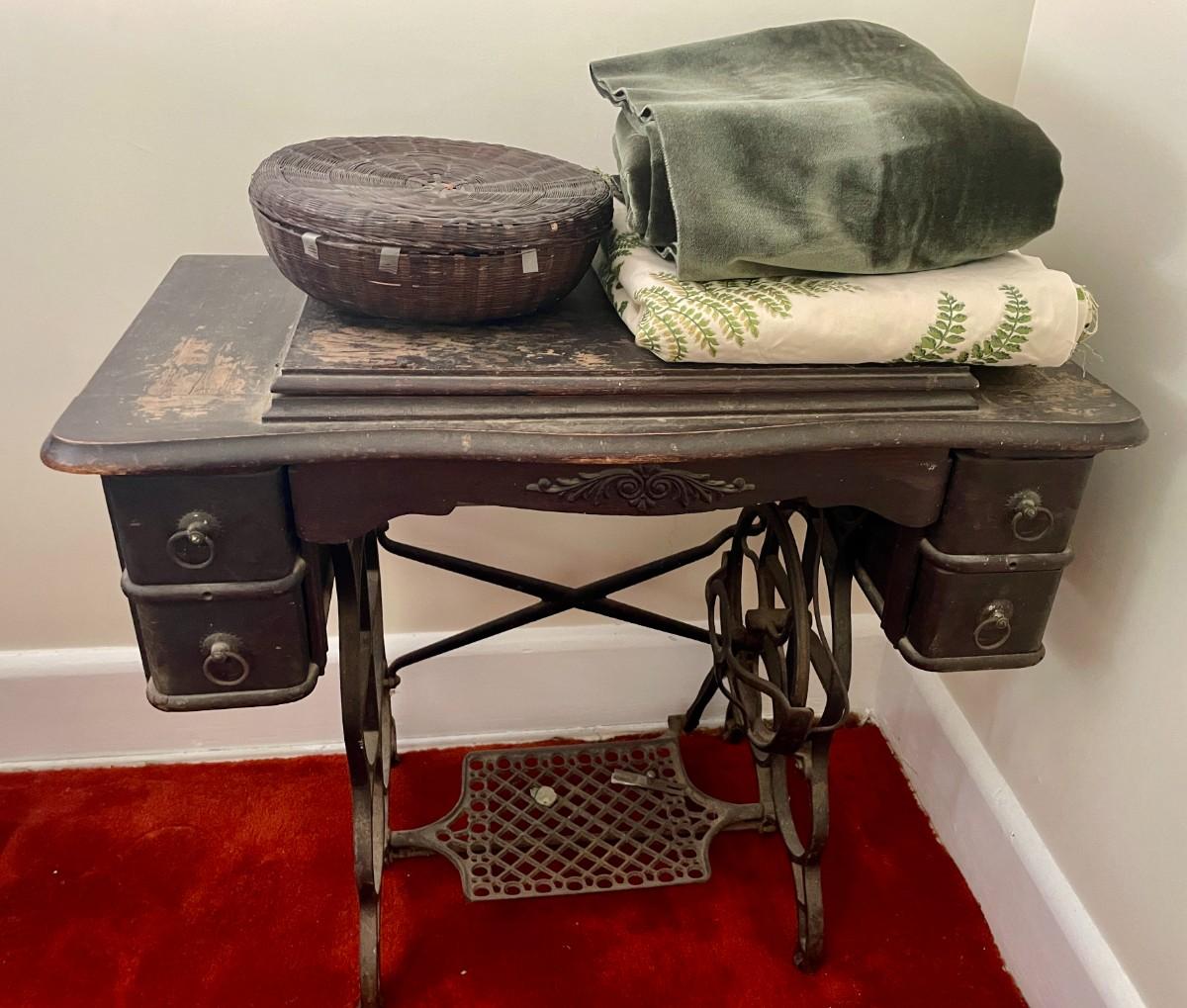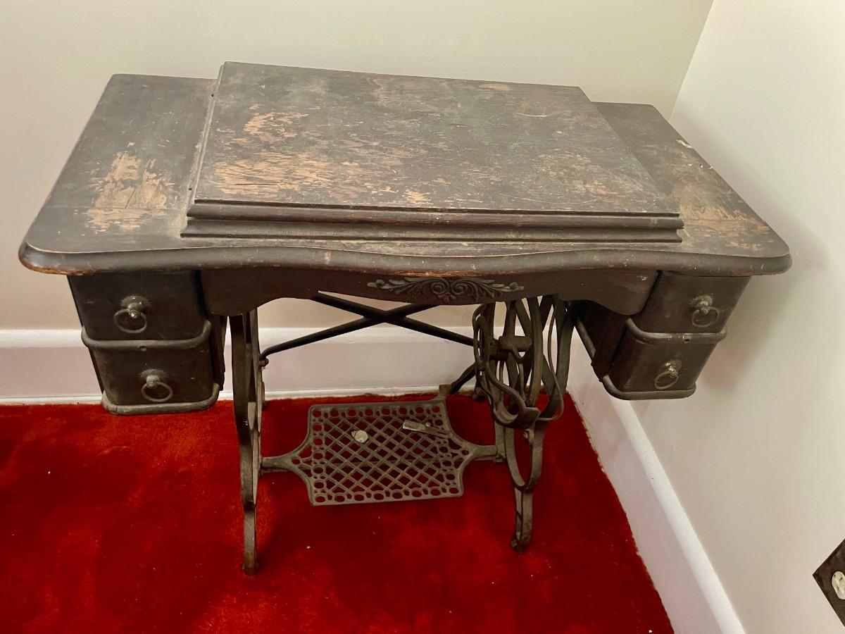 Untested. Comes with attachments, sewing basket & two bolts of upholstery fabric. Table measures 31.5" tall x 34" wide x 18" deep.