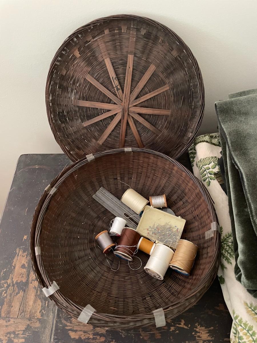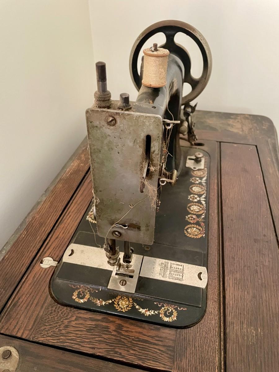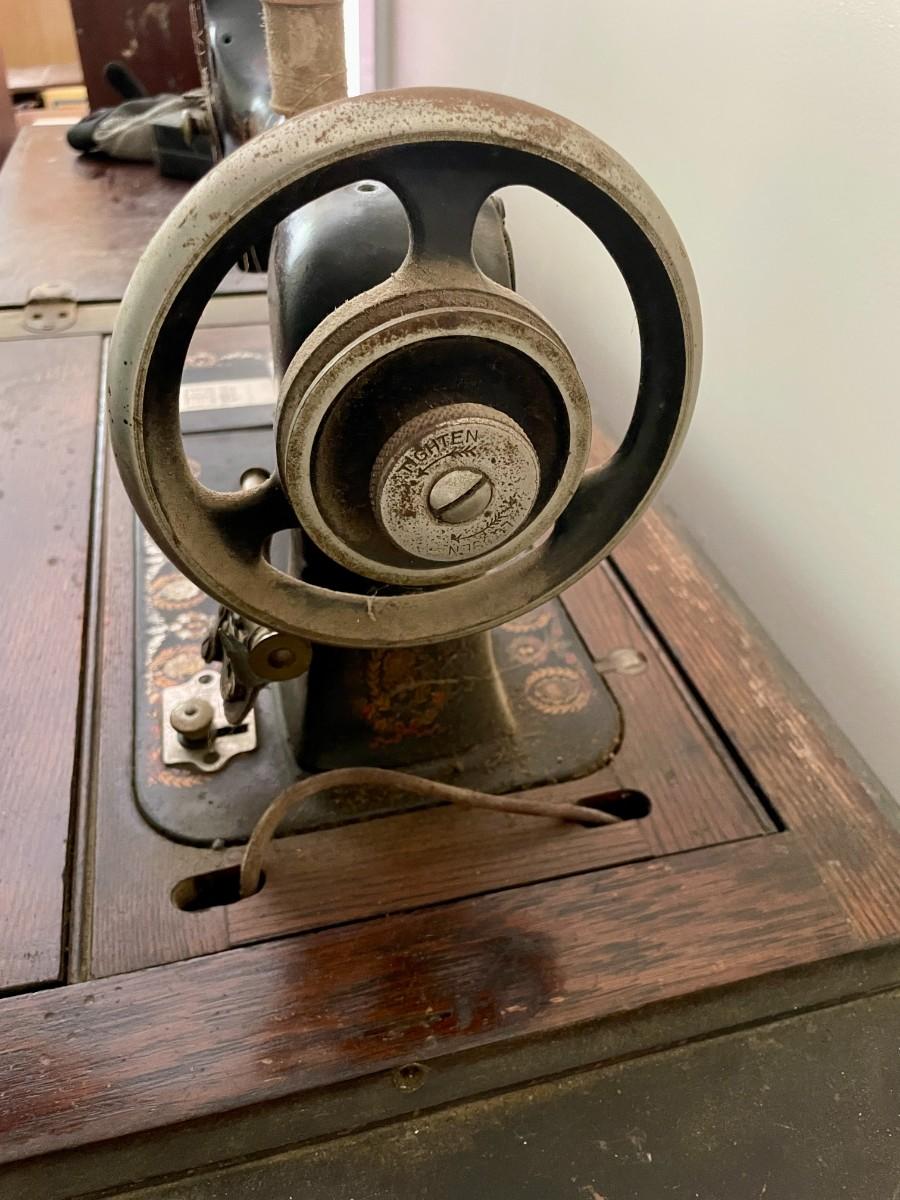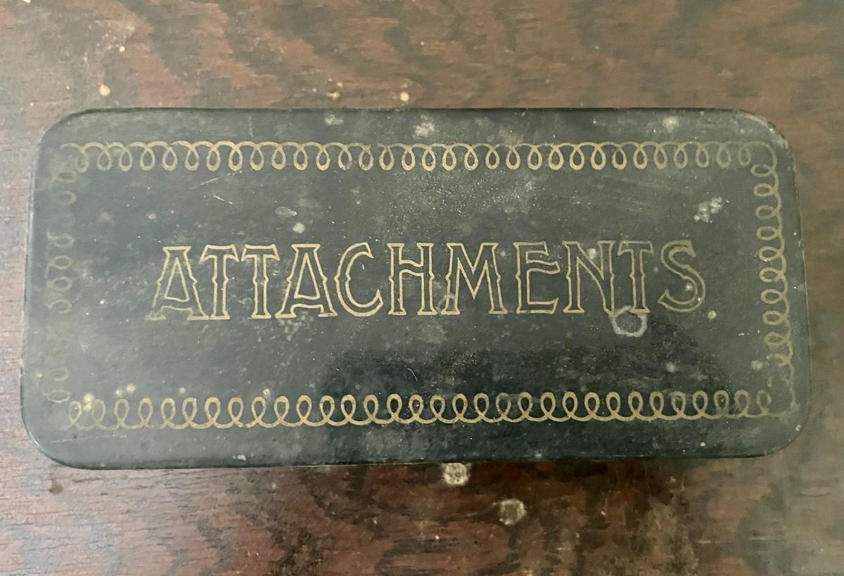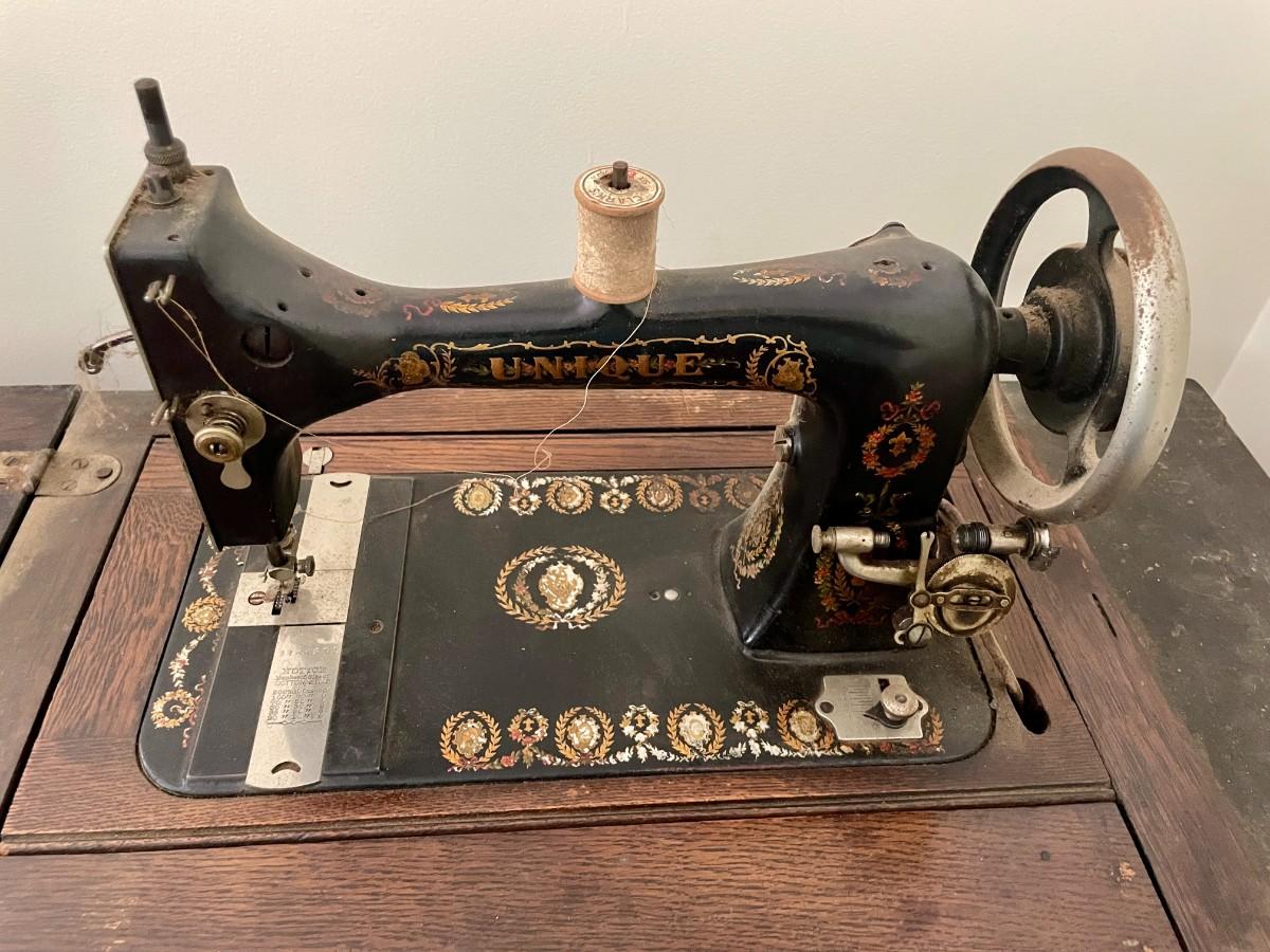 Untested. Comes with attachments, sewing basket & two bolts of upholstery fabric. Table measures 31.5" tall x 34" wide x 18" deep.