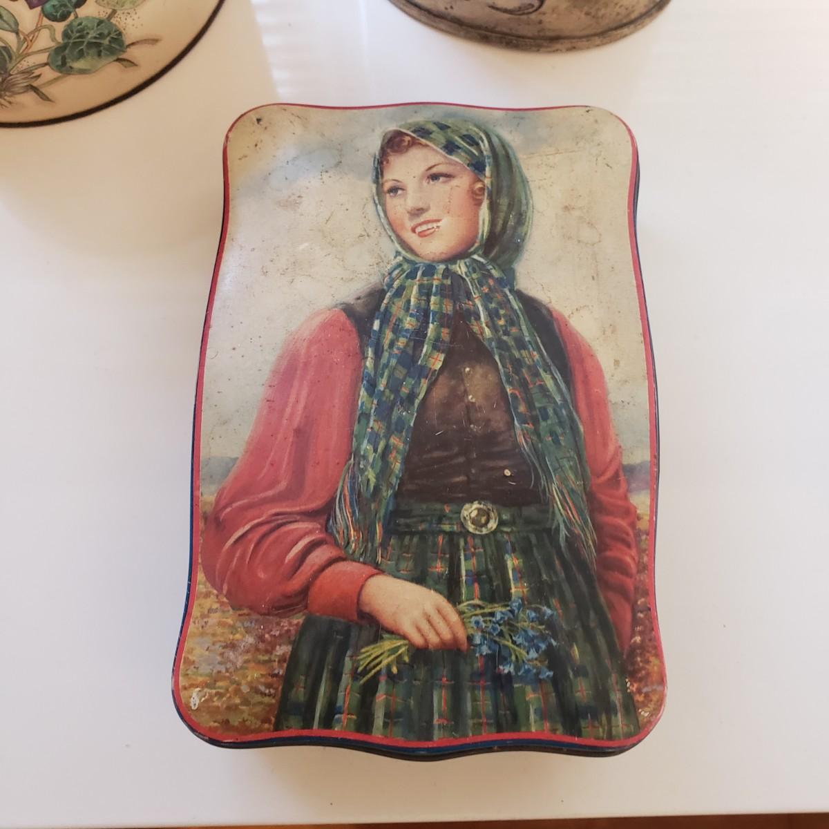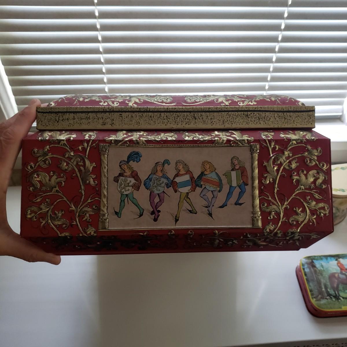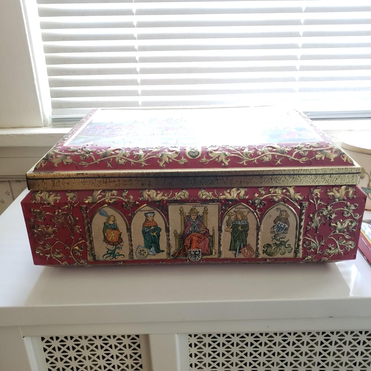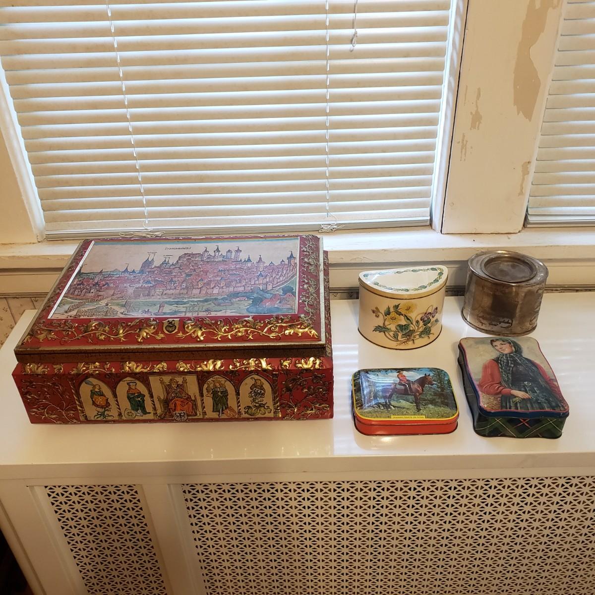 This five piece lot features tins from around the world! The large tin from Germany has amazing pictures on each side, with hardly any rust spots. This piece measures 17" x 12" x 7"H. The tins are in various conditions, see pictures for details. The English Tea tin is much heavier/thicker than the others.