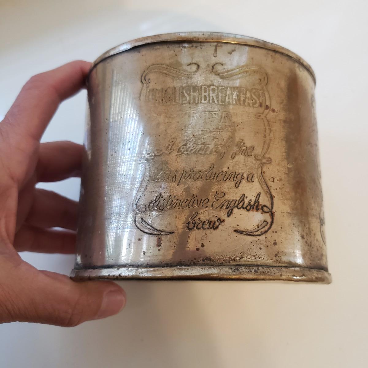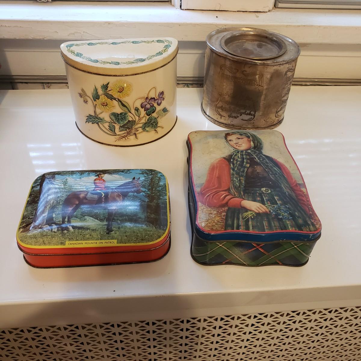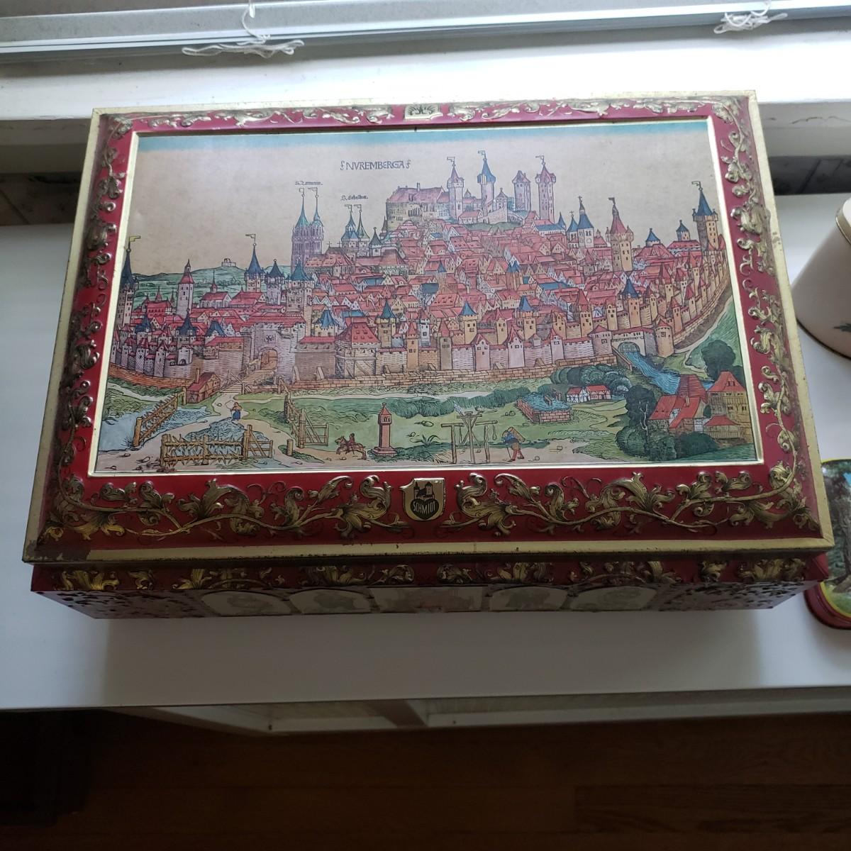 This five piece lot features tins from around the world! The large tin from Germany has amazing pictures on each side, with hardly any rust spots. This piece measures 17" x 12" x 7"H. The tins are in various conditions, see pictures for details. The English Tea tin is much heavier/thicker than the others.