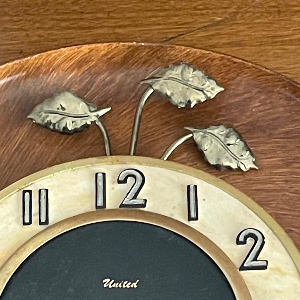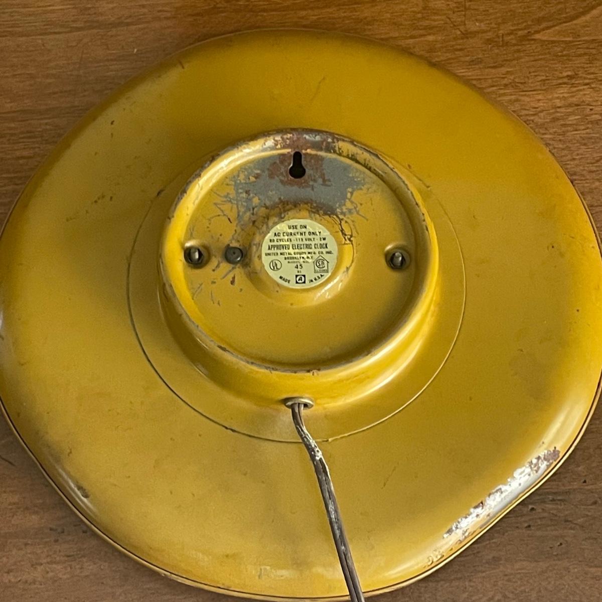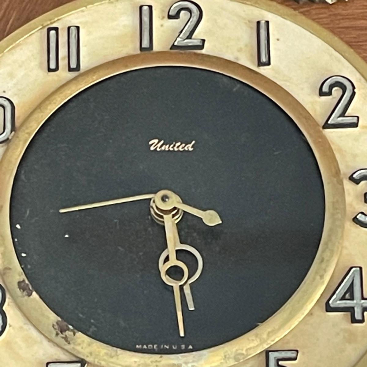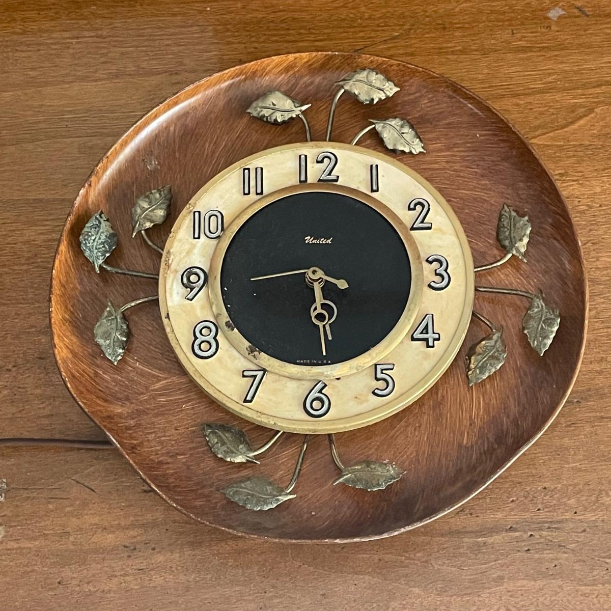 This vintage United clock is electric and it does power on when tested. This MCM clock face is mounted on a metal plate and has what appears to be brass embellishments & clock hands, and plastic numbers. There is some rust and oxidation and the plate has a dent that could potentially be straightened with care. It’s paired with an MCM wood-framed mirror that’s in great condition and measures 25” x 18” x 1". The hanging wire does need to be replaced.