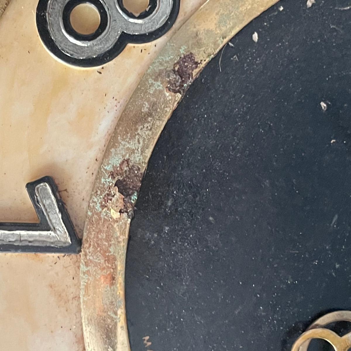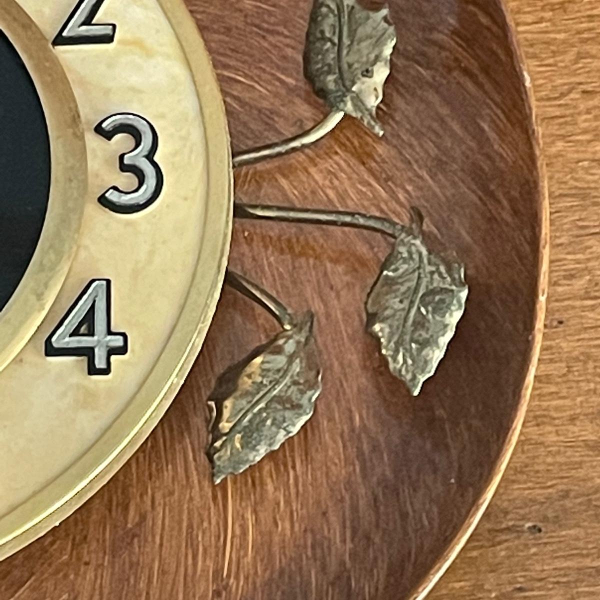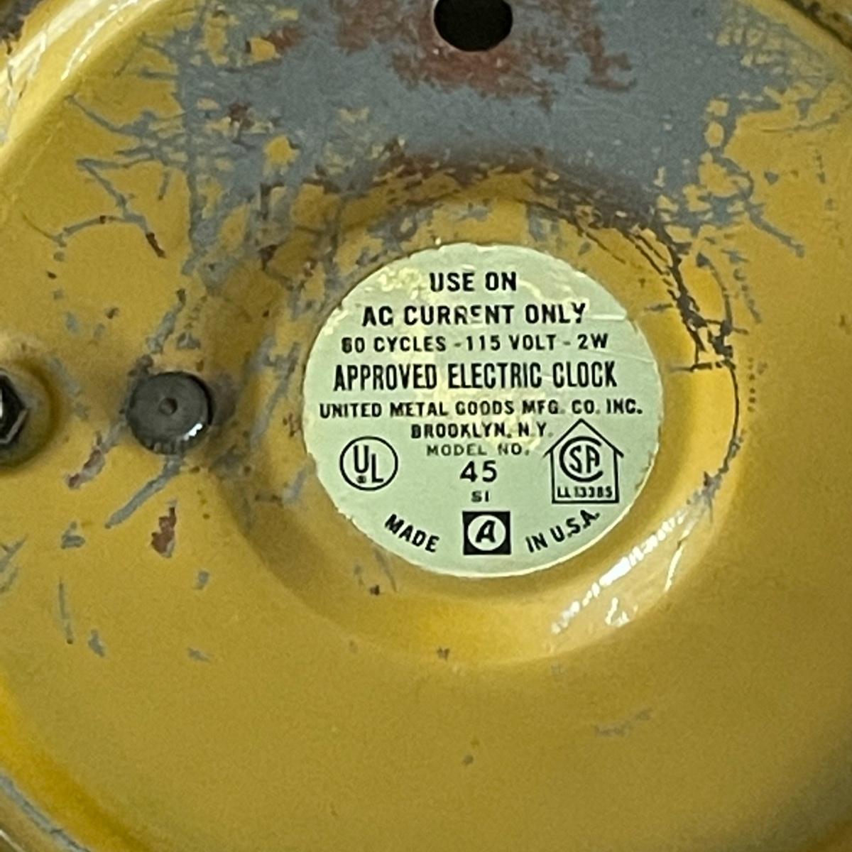 This vintage United clock is electric and it does power on when tested. This MCM clock face is mounted on a metal plate and has what appears to be brass embellishments & clock hands, and plastic numbers. There is some rust and oxidation and the plate has a dent that could potentially be straightened with care. It’s paired with an MCM wood-framed mirror that’s in great condition and measures 25” x 18” x 1". The hanging wire does need to be replaced.