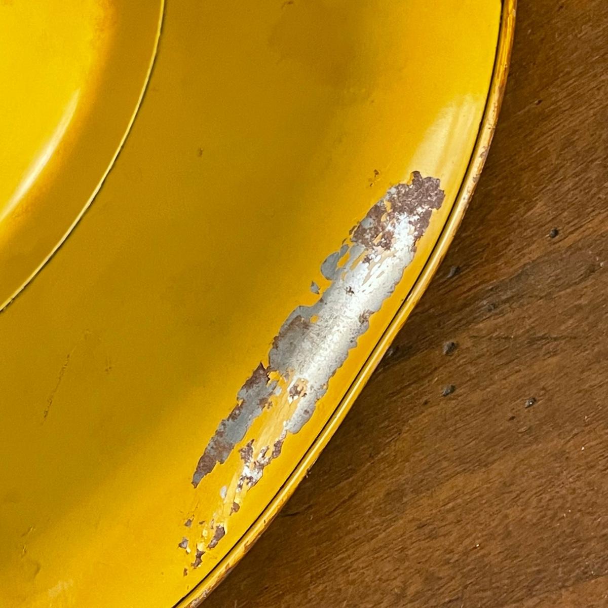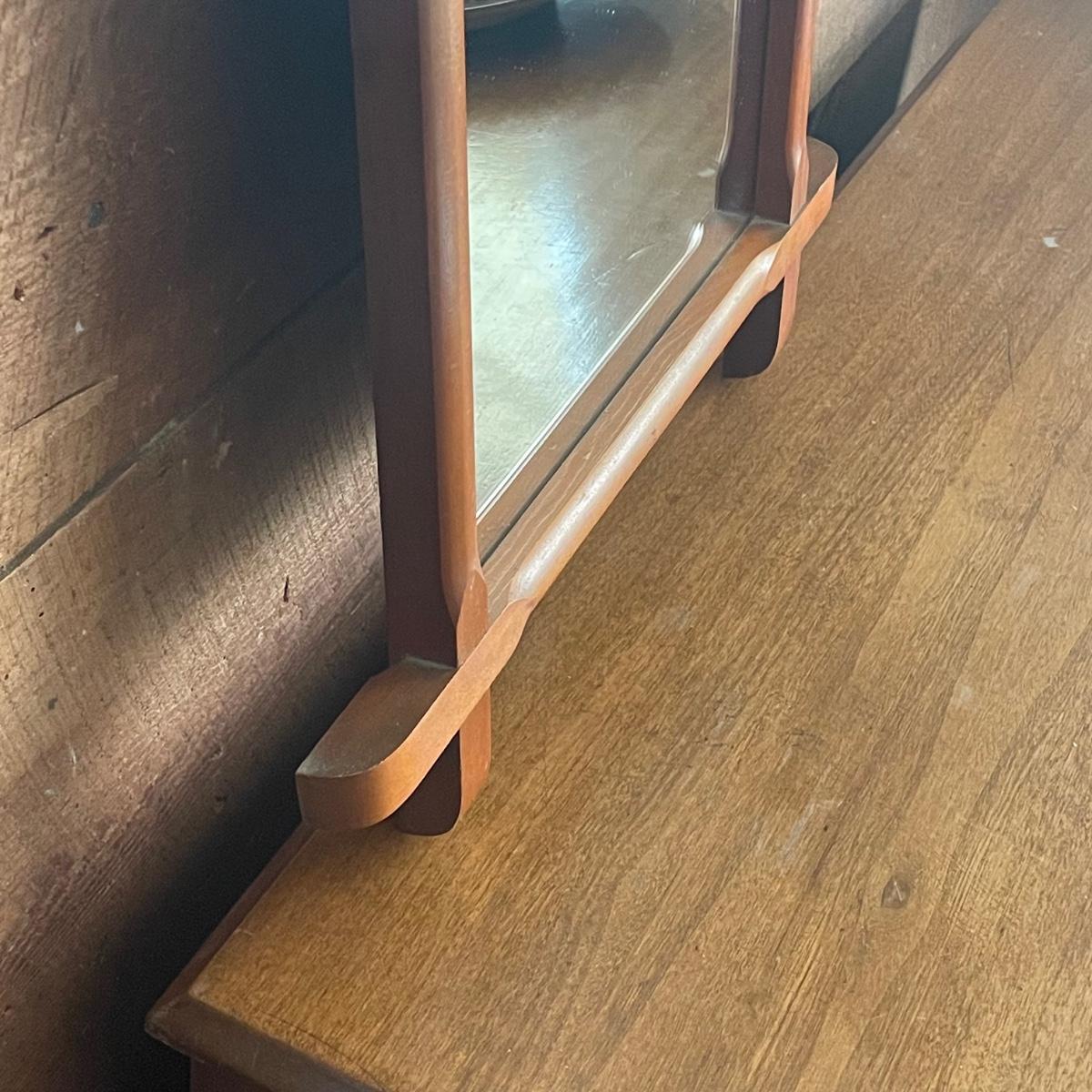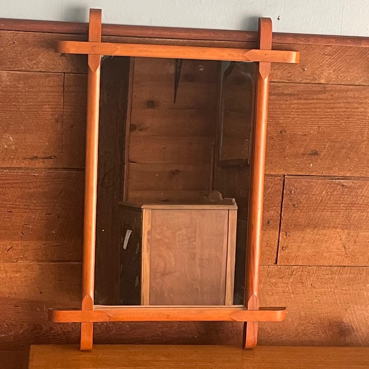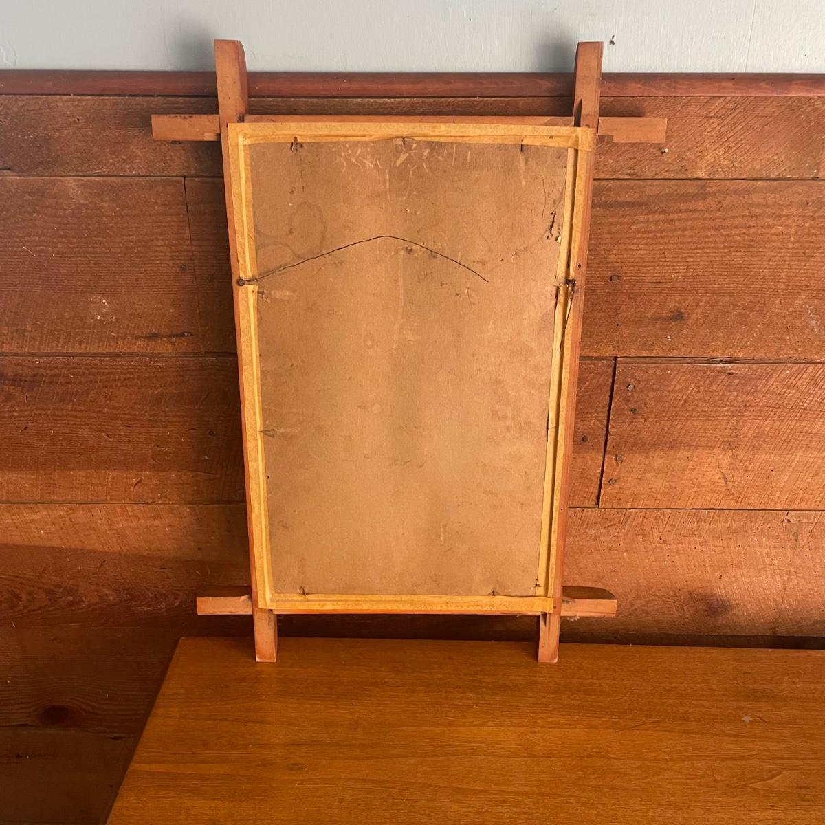 This vintage United clock is electric and it does power on when tested. This MCM clock face is mounted on a metal plate and has what appears to be brass embellishments & clock hands, and plastic numbers. There is some rust and oxidation and the plate has a dent that could potentially be straightened with care. It’s paired with an MCM wood-framed mirror that’s in great condition and measures 25” x 18” x 1". The hanging wire does need to be replaced.