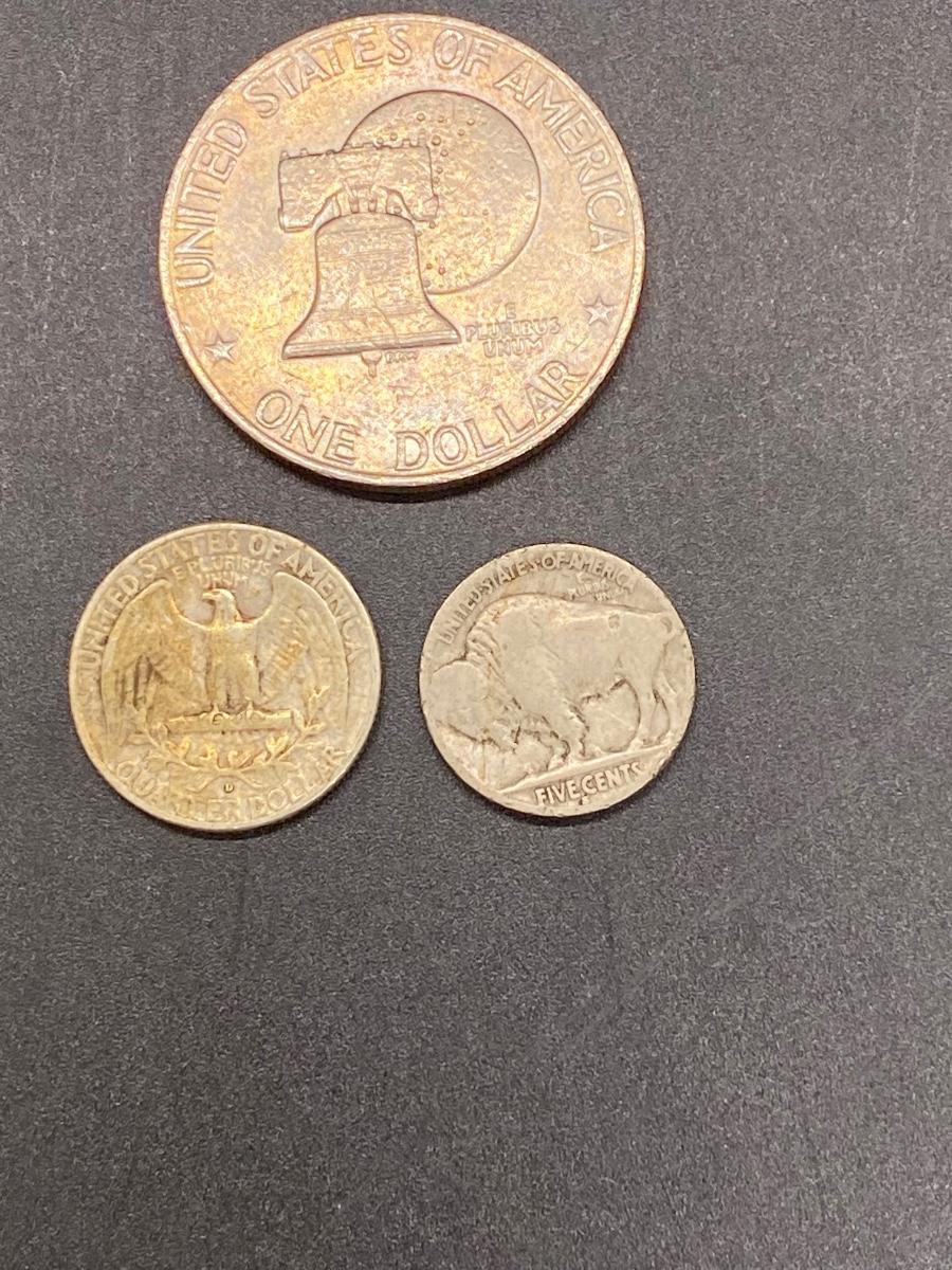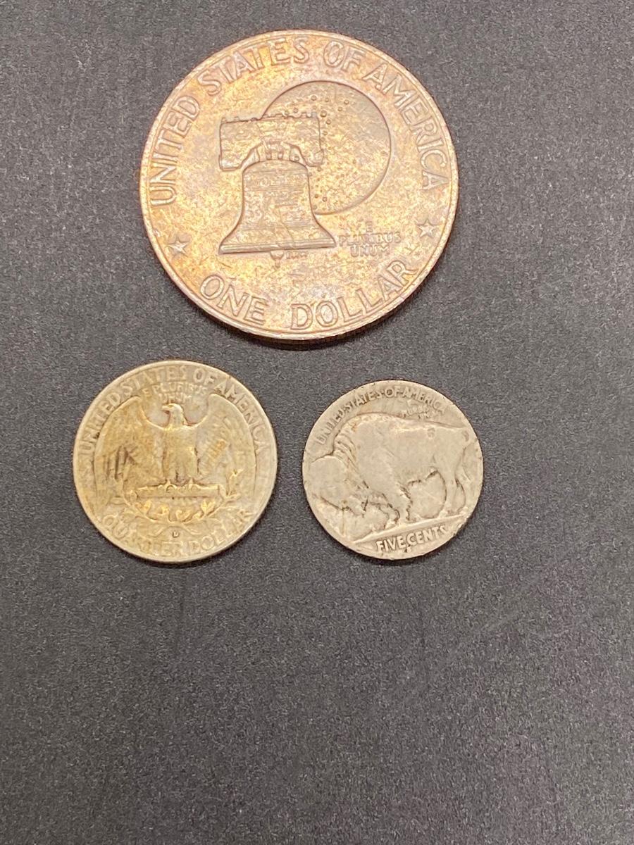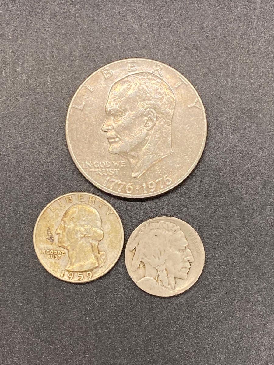 Set of three US coins. The 1959 Washington Quarter, a bicentennial Eisenhower dollar, and a Buffalo Nickel. See photos for condition.