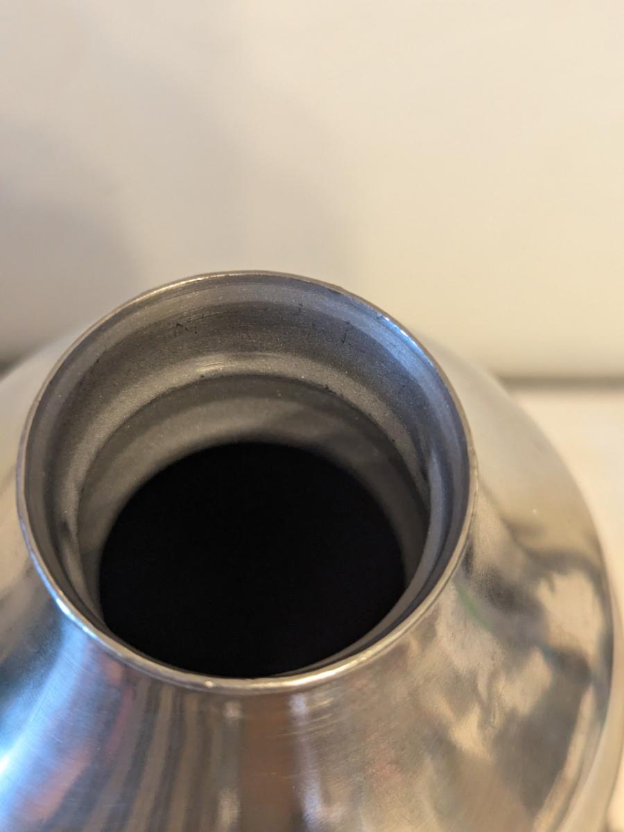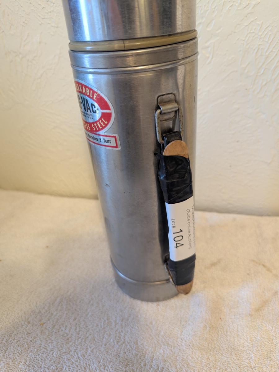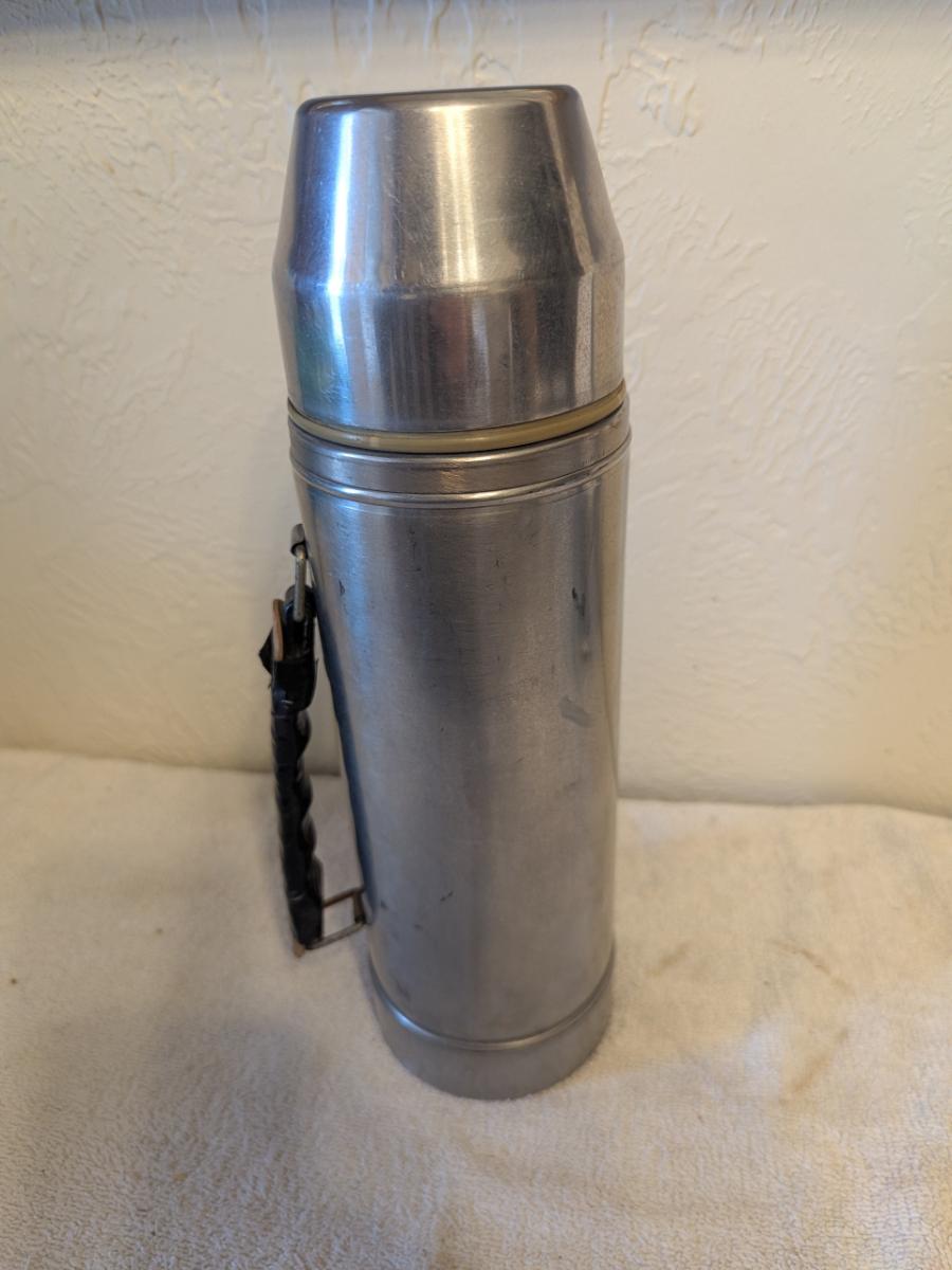 made of stainless steel both inside and out,has a screw-on top that doubles as a drinking cup and a durable attached side handle. made in the United States, primarily in the 1970s.