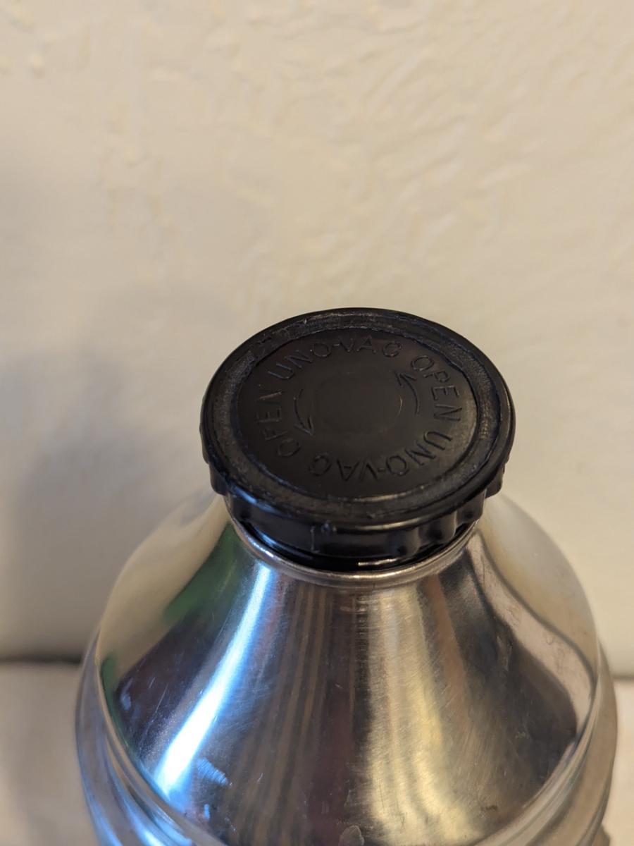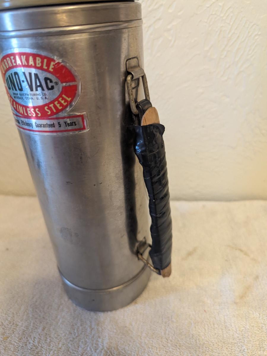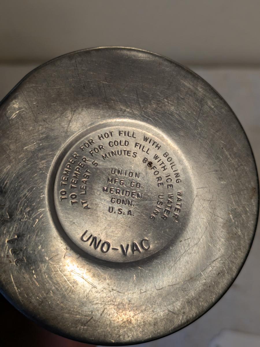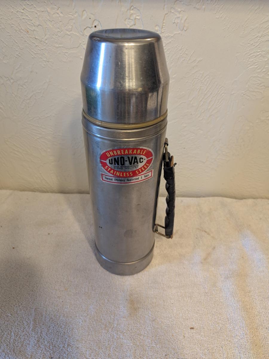 vintage Uno-Vac unbreakable stainless steel thermos, manufactured by the Union Manufacturing Co.