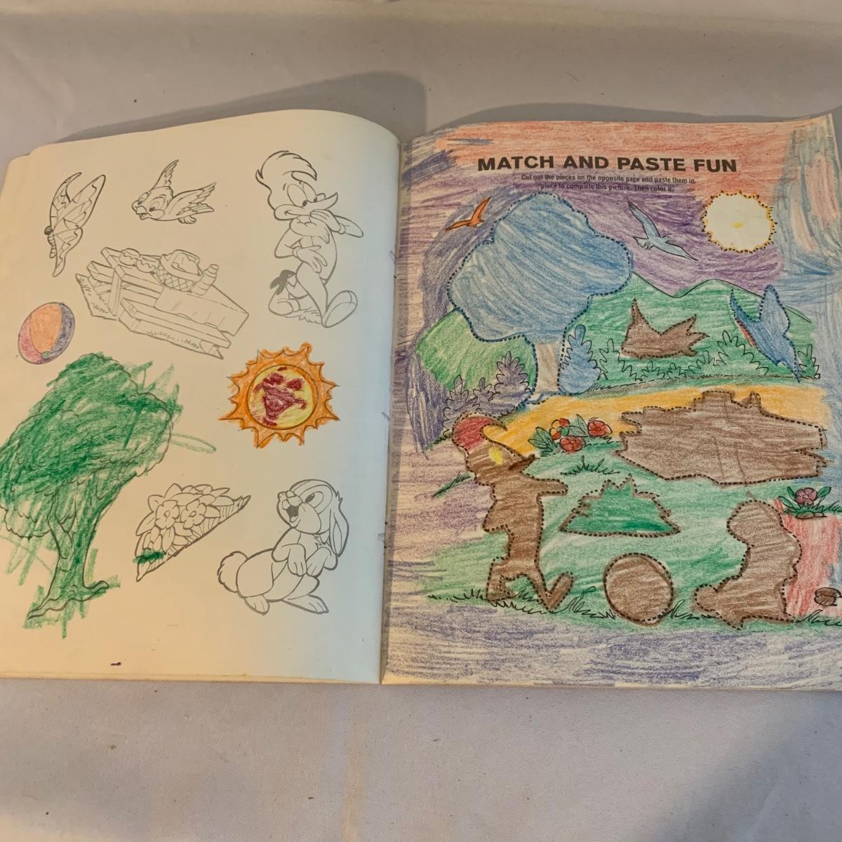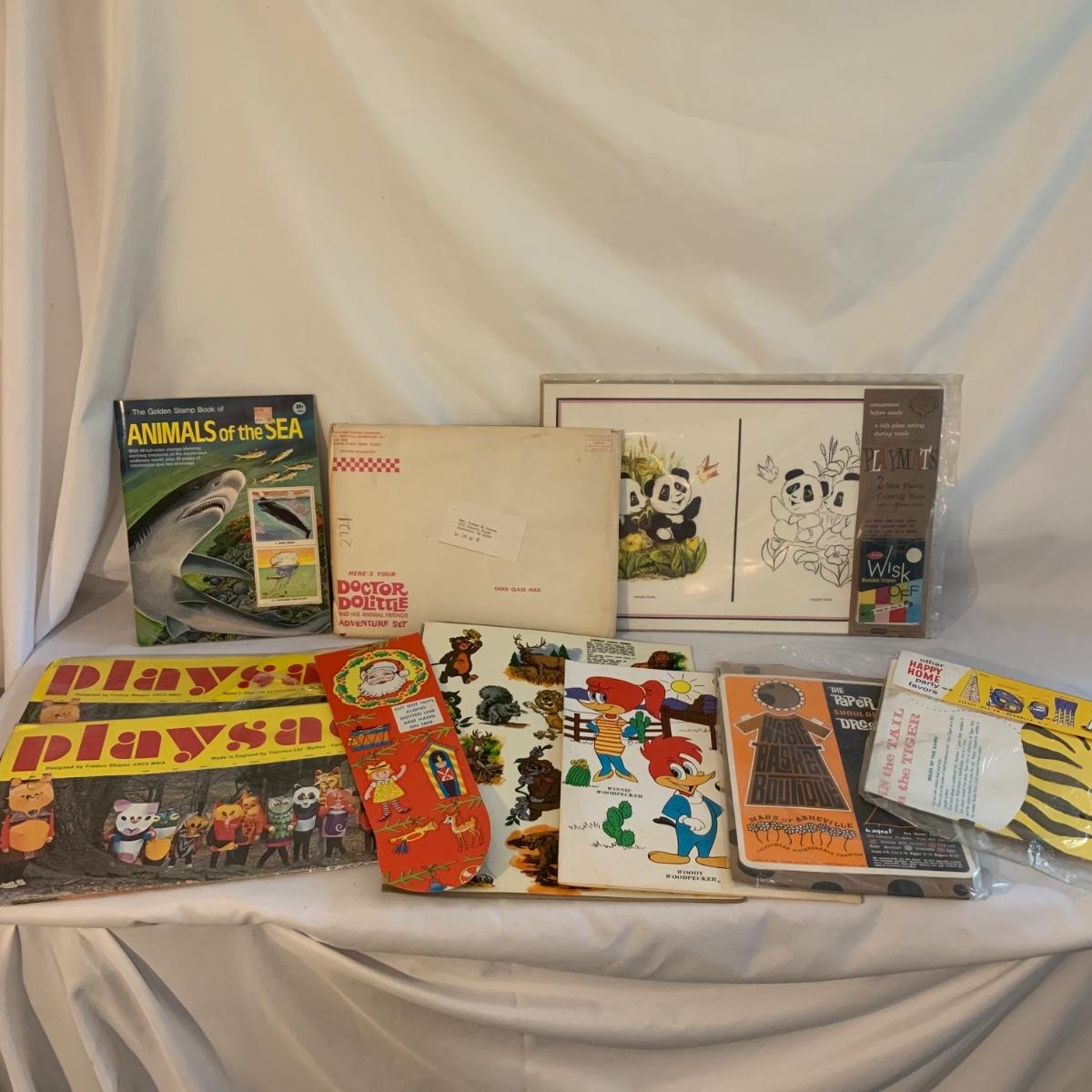 This lot includes a large variety of paper toys including coloring books, paper figurines, Play Sacks, Stickers, and More. The pieces is this lot are in good condition, some with some signs of aging. Most of the toys are unused. Shipping available.