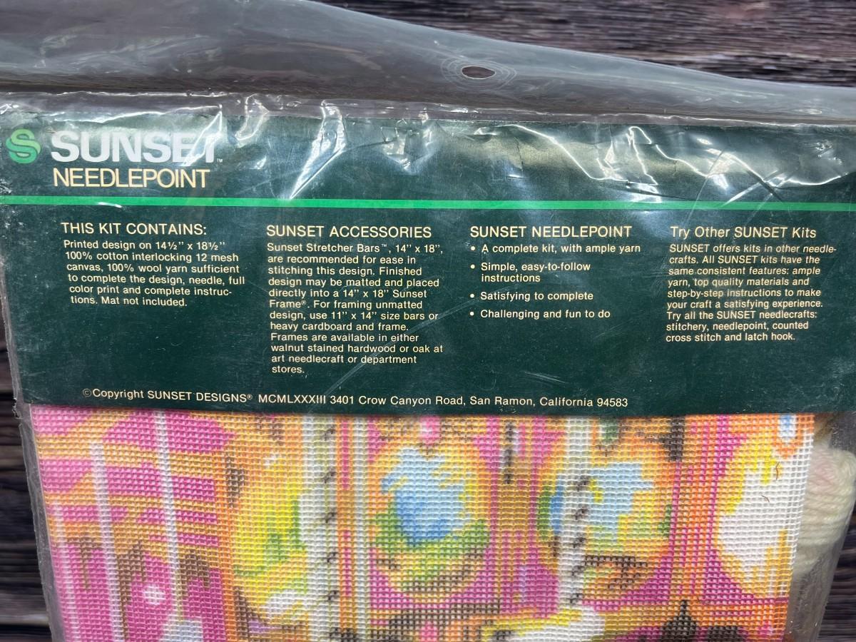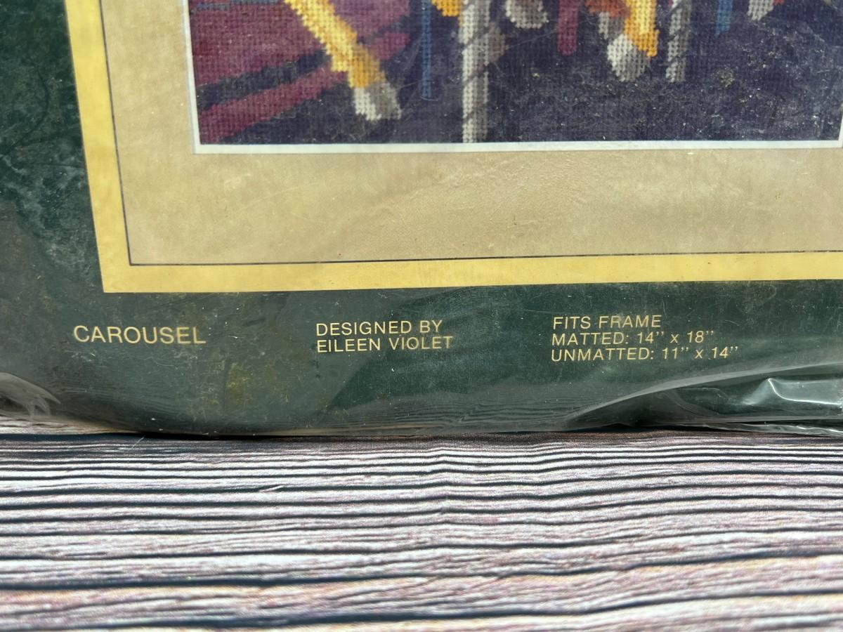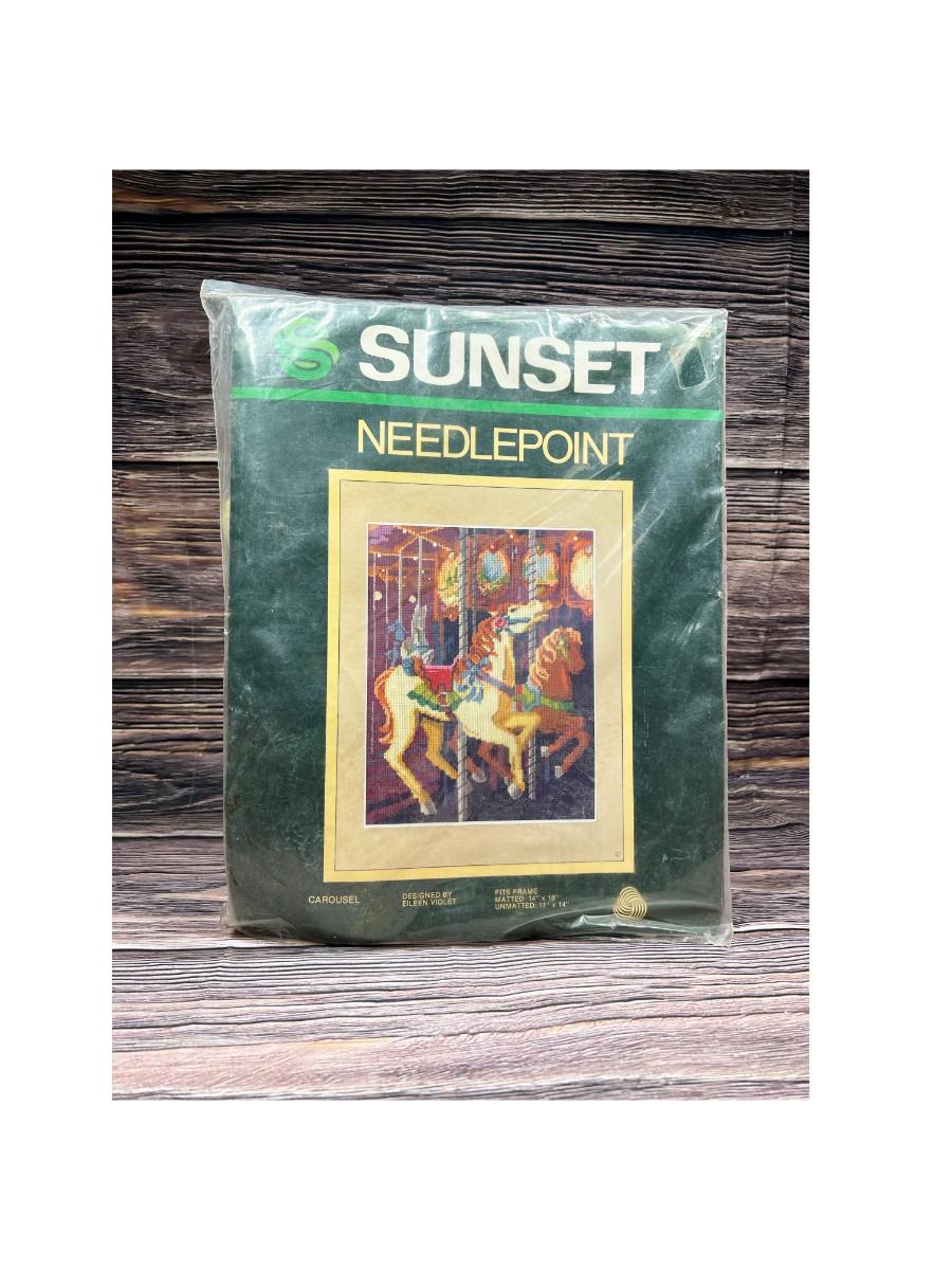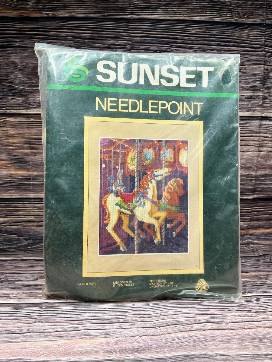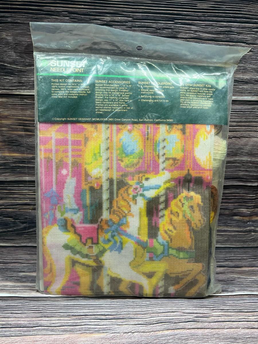 Vintage Unused Sunset Needlepoint Design Kit Carnival Carousel by Eileen Violet, there is no significant damage and is in good vintage condition. Has not been opened, check pictures for more details and for sizing.